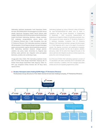 Subholding Upstream berdasarkan Surat Keputusan Direksi No. Kpts-19/C00000/2020-S0 tertanggal 16 Juni 2020. Sesuai dengan Keputusan Pemegang Saham Secara Sirkuler pada tanggal 1 September 2021 tentang Implementasi Pembentukan (Legal End-State) Subholding Upstream, dengan demikian, PHE melakukan pengambilalihan seluruh saham milik PT Pertamina (Persero) atas 11 Anak Perusahaan Hulu dari PT Pertamina (Persero). PHE Subholding Upstream mengelola WK berdasarkan 5 (lima) Regional dengan mempertimbangkan aspek volume produksi, regional, dan kompleksitas operasional. PHE Subholding Upstream berperan sebagai planner, validator, dan policy maker. Sementara itu, Regional akan berfokus pada optimizer dan integrator serta peningkatan keamanan, produksi, dan sumberdaya migas.Hingga akhir tahun 2024, PHE Subholding Upstream terdiri atas 72 Entitas Anak dengan kepemilikan langsung dan 21 Entitas Anak dengan kepemilikan tidak langsung. Selain itu, PHE juga mengelola Entitas Asosiasi dan 29 Kerja Sama Operasi (KSO).Subholding Upstream by virtue of Decision Letter of Directors No. Kpts-19/C00000/2020-S0 dated June 16, 2020. In compliance with the Circular Resolution of Shareholders of September 1, 2021 concerning Implementation of Establishment (Legal End-State) of Subholding Upstream, thus, PHE acquired all shares owned by PT Pertamina (Persero) in 11 Upstream Subsidiary Companies from PT Pertamina (Persero). PHE Subholding Upstream manages the block based on 5 (five) Regionals with a view to the aspect of production volume, the regional concerned, and operational complexity. PHE Subholding Upstream has the role of planner, validator, and policy maker. At the same time, Regional focuses on the role as optimizer and integrator as well as on enhancing security, production, and oil and gas resources. As of the end of 2024, PHE Subholding Upstream consists of 72 subsidiaries with direct ownership and 21 subsidiaries with indirect ownership. In addition, PHE also manages associated entities and 29 Joint Operating Agreements (JOAs).Subholding UpstreamAP/ Service Portofolio Gas SubholdingIntegrated Marine Logistic SubholdingPower & NRE SubholdingRefining & Petrochemical SubholdingCommercial Trading SubholdingKegiatan Eksplorasi dan ProduksiExploration and Production ActivitiesRegional 1 SumatraRegion 1 SumatraRegional 2 JawaRegion 2 JavaRegional 3 KalimantanRegion 3 KalimantanRegional 4 Indonesia TimurRegion 4 Eastern IndonesiaRegional 5InternasionalRegion 5 InternationalKegiatan Non Eksplorasi dan ProduksiNon-Exploration and Production ActivitiesPT Elnusa Tbk PT PDSI PT Badak NGLPT Pertamina (Persero)Holding BUMN MigasStruktur Kelompok Usaha Holding BUMN Migas, PT Pertamina (Persero)The Business Group Structure of the State-Owned Oil and Gas Holding Company, PT Pertamina (Persero)010203 Company Profile Profil Perusahaan04050607 PT Pertamina Hulu Energi 93