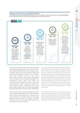 Adapun PT Pertamina Hulu Energi Subholding Upstream berhasil meraih maturity level Commitment, di mana pencapaian ini di atas rata-rata pencapaian Pertamina. PT Pertamina Hulu Energi Subholding Upstream has succeeded in achieving a maturity level of Commitment, the achievement of which is above the average performance of Pertamina.Leader dan seluruh unit / fungsi dibawahnya masih dalam tahap pengenalan Nilai Utama AKHLAK dan CriticalBehavior, serta baru membentuk program budaya.Leader sebagai role model berperan aktif dalam menggerakkan seluruh unit / fungsi di bawahnya untuk mengimplementasikan program budaya sesuai denga wokrplan demi mencapai success indicatorSebagai role model, leader mendorong implementasi budaya terhadap pencapaian kinerja di unit/ fungsiSebagai role model, Leadertelah menanamkan budaya dalam setiap elemen organisasi dan mengintegrasikannya ke dalam sistem manajeamen, serta unit/ fungsi di bawahnya telah mampu beraktivitas sesuai dengan elemen budaya yang diharapkanAwareness0 - 159Dalam rangka memastikan kualitas implementasi AKHLAK bagi para pekerja, program pembelajaran online mengenai nilai-nilai utama AKHLAK dilaksanakan setiap tahun sebagai pelatihan mandatory. Selain itu, secara khusus bagi para pekerja yang tergabung sebagai Agents of Change (AoC) PT Pertamina Hulu Energi Subholding Upstream, fungsi Human Capital melalui fungsi Culture Change Management(CCM) berkolaborasi dalam peningkatan kapabilitas AoC, pengembangan program budaya untuk pimpinan dan memastikan pimpinan sebagai role model dan culture leaderdalam program LCV SERUM 135 untuk Vice President dan General Manager, program pengembangan untuk manajer dalam program Exponent, serta survei implementasi program budaya untuk pekerja dan mitra dalam program AKHLAK Pulse.Salah satu bentuk komitmen dalam pengembangan program di seluruh lingkungan Subholding Upstream dengan memastikan program budaya berjalan dengan baik, di antaranya dengan Culture Amplifier dan CULTURE SUMMIT yang mana para pekerja dan leader termasuk AoC (Agents of Change) berkontribusi aktif serta memberikan dampak kepada kinerja bisnis ataupun operasional Perusahaan.To ensure the quality of AKHLAK implementation for the workers, an online learning program on AKHLAK core values is held each year as mandatory training. In addition, specifically for workers who serve as Agents of Change (AoC) of PT Pertamina Hulu Energi Subholding Upstream, Human Capital function through the Culture Change Management (CCM) function collaborate to enhance the capabilities of AoC, development of cultural program for leaders and ensuring their position as role models and culture leaders through LCV SERUM 135 program for Vice Presidents and General Managers, development programs for managers in Exponent programs, as well as a survey of cultural program implementation for workers and partners in AKHLAK Pulse program. One of the forms of commitment in developing the program within the Subholding Upstream is by ensuring that the cultural program runs well, among others, by holding Culture Amplifier and CULTURE SUMMIT, where workers and leaders, including the AoC, actively contribute and give impacts to the business performance or operations of the Company. Engagement260 - 359Commitment360 - 459Ownership460 - 500Leader dan unit/ fungsi di baawahnya sudah menerima, melakukan, dan mulai mengkaji program budaya, serta mengimplementasikan Nilai Utama AKHLAK danCritical Behavior.Acceptance160 - 259010203 Company Profile Profil Perusahaan04050607 PT Pertamina Hulu Energi 97