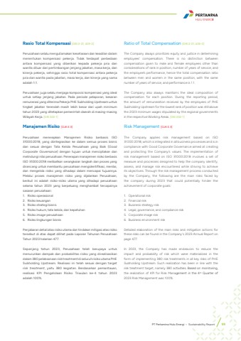 Rasio Total Kompensasi [GRI 2-21, 405-2]Perusahaan selalu mengutamakan kesetaraan dan keadilan dalam menentukan kompensasi pekerja. Tidak terdapat perbedaan antara kompensasi yang diberikan kepada pekerja pria dan wanita diluar dari pertimbangan jenjang jabatan, masa kerja, dan kinerja pekerja, sehingga rasio total kompensasi antara pekerja pria dan wanita pada jabatan, masa kerja, dan kinerja yang sama adalah 1:1.Perusahaan juga selalu menjaga komposisi kompensasi yang ideal untuk setiap jenjang jabatan. Pada periode pelaporan, besaran remunerasi yang diterima Pekerja PHE Subholding Upstream untuk tingkat jabatan terendah masih lebih besar dari upah minimum tahun 2023 yang ditetapkan pemerintah daerah di masing-masing Wilayah Kerja. [GRI 202-1]Manajemen Risiko [OJK E.3]Perusahaan menerapkan Manajemen Risiko berbasis ISO 31000:2018, yang diintegrasikan ke dalam semua proses bisnis dan sesuai dengan Tata Kelola Perusahaan yang Baik (Good Corporate Governance) dengan tujuan untuk menciptakan dan melindungi nilai perusahaan. Penerapan manajemen risiko berbasis ISO 31000:2018 melibatkan serangkaian langkah dan proses yang dirancang untuk membantu perusahaan mengidentifikasi, menilai, dan mengelola risiko yang dihadapi dalam mencapai tujuannya. Melalui proses manajemen risiko yang dijalankan Perusahaan, berikut ini adalah risiko-risiko utama yang dihadapi perusahaan selama tahun 2023 yang berpeluang menghambat tercapainya sasaran perusahaan:1. Risiko operasional2. Risiko keuangan3. Risiko strategi bisnis4. Risiko hukum, tata kelola, dan kepatuhan5. Risiko image perusahaan6. Risiko lingkungan bisnisPenjabaran detail atas risiko utama dan tindakan mitigasi atas risiko tersebut di atas dapat dilihat pada Laporan Tahunan Perusahaan Tahun 2023 halaman 477.Sepanjang tahun 2023, Perusahaan telah berupaya untuk menurunkan dampak dan probabilitas risiko yang direalisasikan dalam 380 pelaksanaan risk treatment di seluruh risiko utama PHE Subholding Upstream. Realisasi ini telah sesuai dengan target risk treatment, yaitu 380 kegiatan. Berdasarkan pemantauan, realisasi KPI Pengelolaan Risiko Triwulan ke-4 tahun 2023 adalah 100%.Ratio of Total Compensation [GRI 2-21, 405-2] The Company always prioritizes equity and justice in determining employees%u2019 compensation. There is no distinction between compensation given to male and female employees other than considerations of rank in position, number of years of service, and the employee%u2019s performance, hence the total compensation ratio between men and women in the same position, with the same number of years of service, and performance is 1:1.The Company also always maintains the ideal composition of compensation for each position. During the reporting period, the amount of remuneration received by the employees of PHE Subholding Upstream for the lowest rank of position was still above the 2023 minimum wages stipulated by the regional governments in the respective Working Areas. [GRI 202-1]Risk Management [OJK E.3] The Company applies risk management based on ISO 31000:2018, which is integrated in all business processes and is in compliance with Good Corporate Governance aimed at creating and protecting the Company%u2019s values. The implementation of risk management based on ISO 31000:2018 involves a set of measure and processes designed to help the company identify, assess, and manage risk encountered while striving to achieve its objectives. Through the risk management process conducted by the Company, the following are the main risks faced by the company during 2023 that could potentially hinder the achievement of corporate goals:1. Operational risk2. Financial risk3. Business strategy risk4. Legal, governance, and compliance risk5. Corporate image risk6. Business environment riskDetailed elaboration of the main risks and mitigation actions for these risks can be found in the Company's 2023 Annual Report on page 477.In 2023, the Company has made endeavors to reduce the impact and probability of risk which were materialized in the form of implementing 380 risk treatments in all key risks of PHE Subholding Upstream. Such realization has been in line with the risk treatment target, namely 380 activities. Based on monitoring, the realization of KPI for Risk Management in the 4th Quarter of 2023 Risk Management was 100%.PT Pertamina Hulu Energi %u2022 Sustainability Report 99