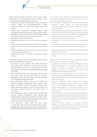 Tata Kelola KeberlanjutanSustainability GovernanceIn the context of risk management implementation, there have been plans for sustainability and business continuity in various aspects, among other things as follows:1. Implementation of Regulation of the Minister of State-owned Enterprises (Permen BUMN) No. PER-5/MBU/09/2022 concerning Implementation of Risk Management in Stateowned Enterprises.2. Risk Management Campaign program as an endeavor to increase Risk Awareness and Risk Culture through training, knowledge sharing, broadcast and cascading KPI of Risk Management as well as strengthening the role of Person in Charge (PIC).3. Updating of the Work Procedure System.4. Development of method and tools for risk management evaluation.5. Implementation and monitoring of Key Risk Indicators (KRI) as an early analysis method to understand early warning status.1. Fulfilling Opportunity for Improvement (OFI) for Risk Maturity of Regional and AP Services.2. Implementation of Business Continuity Management System (BCMS).Implementation of Business Continuity Management System (BCMS) based on ISO 22301:2019, among others:1. Completion of the Business Continuity Management System (SMKB) STK Ratification of PT Pertamina (Persero) for PHE Subholding Upstream in accordance with Memo of the Director of HC & CS of PT Pertamina Hulu Energi No.043/PHE50000/2023-S9 dated May 22, 2023.2. Conducted Monitoring and Completion of All Follow up on Audit Results ISO22301:2019 Business Continuity Management System (BCMS) Within the scope of Subholding Upstream Year 2022 on May 25, 2023.3. Conducted awareness Training ISO22301:2019 Business Continuity Management System (BCMS) for all BCMS PICs in PHE Subholding Upstream in compliance with training implementation by PT Pertamina (Persero) & PCU. (Session I : April 10, 2023, Session II : May 8, 2023, Session III : June 12, 2023).4. Conducted Internal Auditor Training ISO22301:2019 Business Continuity Management System (BCMS) on August 8, 2023 for representatives of each Function in PHE Subholding Upstream in compliance with training implementation by PT Pertamina (Persero) & PCU.5. Conducted table-top simulation on November 20, 2023. Simulation was implemented with the scenario of a cyberattack against the business process of the IT function (Risk Management and TIK Security business process).Dalam rangka penerapan pengelolaan risiko, rencana strategi keberlanjutan dan keberlangsungan bisnis dituangkan dalam beberapa aturan dan implementasinya, antara lain:1. Implementasi Peraturan Menteri Badan Usaha Milik Negara (Permen BUMN) No. PER-5/MBU/09/2022 tentang Penerapan Manajemen Risiko Pada Badan Usaha Milik Negara.2. Program Risk Management Campaign sebagai upaya peningkatan Risk Awareness dan Risk Culture melalui training, knowledge sharing, broadcast dan cascading KPI Pengelolaan Risiko serta peningkatan peran Person in Charge (PIC).3. Pembaharuan Sistem Tata Kerja (STK).4. Pengembangan metode dan tools untuk evaluasi manajemen risiko.5. Implementasi dan monitoring Key Risk Indicator (KRI) sebagai metode analisis lebih awal untuk mengetahui early warning status.6. Pemenuhan Opportunity for Improvement (OFI) untuk Risk Maturity Regional dan AP Services.7. Implementasi Business Continuity Management System (BCMS).Implementasi Business Continuity Management System (BCMS) berdasarkan ISO 22301:2019, antara lain:1. Penyelesaian proses Ratifikasi STK Sistem Manajemen Kelangsungan Bisnis (SMKB) PT Pertamina (Persero) untuk PHE Subholding Upstream sesuai Memo Direktur SDM & PB PT Pertamina Hulu Energi No.043/PHE50000/2023-S9 tanggal 22 Mei 2023.2. Telah dilakukan Monitoring dan Penyelesaian Seluruh Tindak Lanjut Hasil Audit ISO 22301:2019 Business Continuity Management System (BCMS) Lingkup Subholding Upstream Tahun 2022 pada tanggal 25 Mei 2023.3. Telah dilaksanakan Pelatihan awareness ISO 22301:2019 Business Continuity Management System (BCMS) untuk seluruh PIC BCMS di PHE Subholding Upstream sesuai dengan pelaksanaan pelatihan dari PT Pertamina (Persero) & PCU. (Sesi I : 10 April 2023, Sesi II : 8 Mei 2023, Sesi III : 12 Juni 2023).4. Telah dilaksanakan Pelatihan Internal Auditor ISO 22301:2019 Business Continuity Management System (BCMS) pada tanggal 8 Agustus 2023 untuk perwakilan dari masing-masing Fungsi di PHE Subholding Upstream sesuai dengan pelaksanaan pelatihan dari PT Pertamina (Persero) & PCU.5. Telah dilaksanakan simulasi table top pada tanggal 20 November 2023. Simulasi dilaksanakan dengan skenario terjadinya cyber attack yang terjadi terhadap proses bisnis dari fungsi IT (proses bisnis Pengelolaan Risiko dan Keamanan TIK).67 8 9 10 11100 Laporan Keberlanjutan %u2022 PT Pertamina Hulu Energi