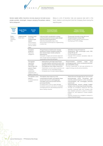 Tata Kelola KeberlanjutanSustainability GovernanceBelow is a list of transition risks and physical risks both in the short, medium, and long term that the Company faces during the reporting year:Berikut adalah daftar transition risk dan physical risk baik secara jangka pendek, menengah, maupun panjang Perusahaan selama tahun pelaporan:Kategori RisikoRisk CategoryJangka WaktuTermsMasalahIssueDeskripsi DampakImpact DescriptionMitigasi, StrategiMitigation, StrategyRisiko TransisiTransition RiskJangka pendekShort-termKenaikan harga emisi GRK misalnya pajak karbonGHG emission price increases such as carbon taxesIndonesia telah mengeluarkan undangundang tentang harmonisasi pajak sebagai dasar penerapan pajak karbon.Indonesia has passed a law on tax harmonization as the basis for implementing a carbon tax.%u2022 Mengurangi intensitas energi dan emisi.%u2022 Mengembangkan strategi NZE.%u2022 Reduce energy intensity and emissions.%u2022 Developing an NZE strategy.Kewajiban pelaporanReporting obligationsMengantisipasi perubahan dan menjaga keselarasan dengan kewajiban pelaporan iklim terkait dengan standar pelaporan keberlanjutan.Anticipate changes and maintain alignment with climate reporting obligations related to sustainability reporting standards.%u2022 Melibatkan tenaga ahli eksternal.%u2022 Mengevaluasi data perhitungan emisi GRK setiap WK dan AP.%u2022 Involving external experts.%u2022 Evaluate GHG emission calculation data for each WA and AP.Peningkatan kepedulian pemangku kepentingan dan paparan litigasiIncreased stakeholder awareness and litigation exposure%u2022 Kekhawatiran pemangku kepentingan terhadap kegiatan operasional yang mana sebagai produsen energi tidak terbarukan.%u2022 Meningkatnya risiko litigasi terkait iklim.%u2022 Stakeholder concerns about operations as a producer of non-renewable energy.%u2022 Increased risk of climate-related litigation. Memprioritaskan produksi migas yang bertanggung jawab untuk mendukung keamanan dan aksesibilitas energi.Prioritize responsible oil and gas production to support energy security and accessibility.Peningkatan cuaca ekstremIncreased extreme weatherPeningkatan biaya langsung untuk memperbaiki kerusakan, peningkatan biaya asuransi karena premi pertanggungan meningkat, penurunan produksi karena penutupan fasilitas.Increased direct costs to repair damage, increased insurance costs due to increased coverage premiums, decreased production due to facility closures.%u2022 Melalui Rencana Tanggap Darurat dan rencana kesinambungan bisnis, Perusahaan juga memiliki protokol terperinci untuk memantau, mempersiapkan, dan menanggapi peristiwa cuaca buruk.%u2022 Mempertahankan asuransi sebagai langkah mitigasi untuk mengurangi dampak keuangan.%u2022 Through our Emergency Response Plan and business continuity plan, the Company also have detailed protocols in place to monitor, prepare for, and respond to severe weather events.%u2022 Maintain insurance as a mitigation measure to reduce financial impact.67 8 9 10 11102 Laporan Keberlanjutan %u2022 PT Pertamina Hulu Energi