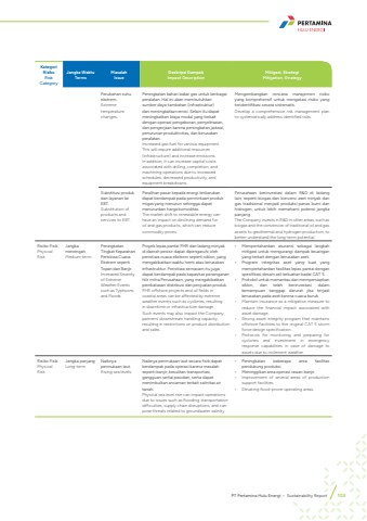 Kategori RisikoRisk CategoryJangka WaktuTermsMasalahIssueDeskripsi DampakImpact DescriptionMitigasi, StrategiMitigation, StrategyPerubahan suhu ekstrem.Extreme temperature changes.Peningkatan bahan bakar gas untuk berbagai peralatan. Hal ini akan membutuhkan sumber daya tambahan (infrastruktur) dan meningkatkan emisi. Selain itu dapat meningkatkan biaya modal yang terkait dengan operasi pengeboran, penyelesaian, dan pengerjaan karena peningkatan jadwal, penurunan produktivitas, dan kerusakan peralatan.Increased gas fuel for various equipment. This will require additional resources (infrastructure) and increase emissions. In addition, it can increase capital costs associated with drilling, completion, and machining operations due to increased schedules, decreased productivity, and equipment breakdowns.Mengembangkan rencana manajemen risiko yang komprehensif untuk mengatasi risiko yang teridentifikasi secara sistematis.Develop a comprehensive risk management plan to systematically address identified risks.Substitusi produk dan layanan ke EBT.Substitution of products and services to EBT.Peralihan pasar kepada energi terbarukan dapat berdampak pada permintaan produk migas yang menurun sehingga dapat menurunkan harga komoditas.The market shift to renewable energy can have an impact on declining demand for oil and gas products, which can reduce commodity prices.Perusahaan berinvestasi dalam R&D di bidang lain, seperti biogas dan konversi aset minyak dan gas tradisional menjadi produksi panas bumi dan hidrogen, untuk lebih memahami potensi jangka panjang.The Company invests in R&D in other areas, such as biogas and the conversion of traditional oil and gas assets to geothermal and hydrogen production, to better understand the long-term potential.Risiko FisikPhysical RiskJangka menengahMedium-termPeningkatan Tingkat Keparahan Peristiwa Cuaca Ekstrem seperti Topan dan Banjir.Increased Severity of Extreme Weather Events such as Typhoons and Floods.Proyek lepas pantai PHR dan ladang minyak di daerah pesisir dapat dipengaruhi oleh peristiwa cuaca ekstrem seperti siklon, yang mengakibatkan waktu henti atau kerusakan infrastruktur. Peristiwa semacam itu juga dapat berdampak pada kapasitas penanganan hilir mitra Perusahaan, yang mengakibatkan pembatasan distribusi dan penjualan produk.PHR offshore projects and oil fields in coastal areas can be affected by extreme weather events such as cyclones, resulting in downtime or infrastructure damage. Such events may also impact the Company partners' downstream handling capacity, resulting in restrictions on product distribution and sales.%u2022 Mempertahankan asuransi sebagai langkah mitigasi untuk mengurangi dampak keuangan yang terkait dengan kerusakan aset.%u2022 Program integritas aset yang kuat yang mempertahankan fasilitas lepas pantai dengan spesifikasi desain asli kekuatan badai CAT 5.%u2022 Protokol untuk memantau dan mempersiapkan siklon, dan telah berinvestasi dalam kemampuan tanggap darurat jika terjadi kerusakan pada aset karena cuaca buruk.%u2022 Maintain insurance as a mitigation measure to reduce the financial impact associated with asset damage.%u2022 Strong asset integrity program that maintains offshore facilities to the original CAT 5 storm force design specification.%u2022 Protocols for monitoring and preparing for cyclones and investment in emergency response capabilities in case of damage to assets due to inclement weather.Risiko FisikPhysical RiskJangka panjangLong-termNaiknya permukaan laut.Rising sea levels.Naiknya permukaan laut secara fisik dapat berdampak pada operasi karena masalah seperti banjir, kesulitan transportasi, gangguan rantai pasokan, serta dapat menimbulkan ancaman terkait salinitas air tanah.Physical sea level rise can impact operations due to issues such as flooding, transportation difficulties, supply chain disruptions, and can pose threats related to groundwater salinity.%u2022 Peningkatan beberapa area fasilitas pendukung produksi.%u2022 Meninggikan area operasi rawan banjir.%u2022 Improvement of several areas of production support facilities.%u2022 Elevating flood-prone operating areas.PT Pertamina Hulu Energi %u2022 Sustainability Report 103