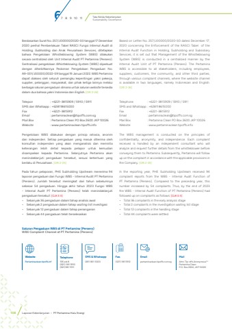 Tata Kelola KeberlanjutanSustainability GovernanceBerdasarkan Surat No. 257/J00000/2020-S0 tanggal 17 Desember 2020 perihal Pemberlakuan Tabel RASCI Fungsi Internal Audit di Holding, Subholding dan Anak Perusahaan Services, ditetapkan bahwa Pengelolaan Whistleblowing System (WBS) dilakukan secara centralized oleh Unit Internal Audit PT Pertamina (Persero). Sentralisasi pengelolaan Whistleblowing System (WBS) diperkuat dengan diterbitkannya Pedoman Pengelolaan Pengaduan No. A9-001/J00000/2022-S9 tanggal 19 Januari 2022. WBS Pertamina dapat diakses oleh seluruh pemangku kepentingan yakni pekerja, supplier, pelanggan, masyarakat, dan pihak ketiga lainnya melalui berbagai saluran pengaduan dimana untuk saluran website tersedia dalam dua bahasa yakni Indonesia dan English. [GRI 2-26]Telepon : +6221-3815909 / 5910 / 5911SMS dan Whatsapp : +628118615000Fax : +6221-3815912Email : pertaminaclean@tipoffs.com.sgMail Box : Pertamina Clean PO Box 2600 JKP 10026Website : www.pertaminaclean.tipoffs.infoPengelolaan WBS dilakukan dengan prinsip rahasia, anonim dan independen. Setiap pengaduan yang masuk diterima oleh konsultan independen yang akan menganalisis dan meminta keterangan lebih detail kepada pelapor untuk kemudian disampaikan kepada Pertamina. Selanjutnya Pertamina akan menindaklanjuti pengaduan tersebut, sesuai ketentuan yang berlaku di Perusahaan. [GRI 2-25]Pada tahun pelaporan, PHE Subholding Upstream menerima 94 laporan pengaduan dari Fungsi WBS - Internal Audit PT Pertamina (Persero). Jumlah tersebut meningkat dari tahun sebelumnya sebesar 54 pengaduan. Hingga akhir tahun 2023 Fungsi WBS - Internal Audit PT Pertamina (Persero) telah menindaklanjuti pengaduan tersebut: [OJK E.5]%u2022 Sebanyak 36 pengaduan dalam tahap analisis awal%u2022 Sebanyak 2 pengaduan dalam tahap waiting list investigasi%u2022 Sebanyak 12 pengaduan dalam tahap penanganan%u2022 Sebanyak 44 pengaduan telah terselesaikanBased on Letter No. 257/J00000/2020-S0 dated December 17, 2020 concerning the Enforcement of the RASCI Tabel of the Internal Audit Function in Holding, Subholding and Subsidiary Services, it is set out that Management of the Whistleblowing System (WBS) is conducted in a centralized manner by the Internal Audit Unit of PT Pertamina (Persero). The Pertamina WBS is accessible to all stakeholders, including employees, suppliers, customers, the community, and other third parties, through various complaint channels, where the website channel is available in two languages, namely Indonesian and English. [GRI 2-26] Telephone : +6221-3815909 / 5910 / 5911SMS and Whatsapp : +628118615000Fax : +6221-3815912Email : pertaminaclean@tipoffs.com.sgMail Box : Pertamina Clean PO Box 2600 JKP 10026Website : www.pertaminaclean.tipoffs.infoThe WBS management is conducted on the principles of confidentiality, anonymity, and independence. Each complaint received is handled by an independent consultant who will analyze and request further details from the whistleblower before conveying them to Pertamina. Subsequently, Pertamina will follow up on the complaint in accordance with the applicable provisions in the Company. [GRI 2-25]In the reporting year, PHE Subholding Upstream received 94 complaint reports from the WBS - Internal Audit Function of PT Pertamina (Persero). Compared to the preceding year, this number increased by 54 complaints. Thus, by the end of 2023 the WBS - Internal Audit Function of PT Pertamina (Persero) had followed up on complaints as follows: [OJK E.5]%u2022 Total 36 complaints in the early analysis stage %u2022 Total 2 complaints in the investigation waiting list stage%u2022 Total 12 complaints in the handling stage%u2022 Total 44 complaints were settledSaluran Pengaduan WBS di PT Pertamina (Persero)WBS Complaint Channel at PT Pertamina (Persero)WebsitePertaminaclean.tipoffs.infTelephone135 ext.8(021) 381 5910(021)381 5911SMS & Whatsapp0811 861 5000Fax.(021) 381 5912Emailpertaminaclean.tipoffs.com.sgMailAttn: Tip-offs AnonymousTMPertamina CleanP.O. Box 2600, JKP 1002667 8 9 10 11108 Laporan Keberlanjutan %u2022 PT Pertamina Hulu Energi