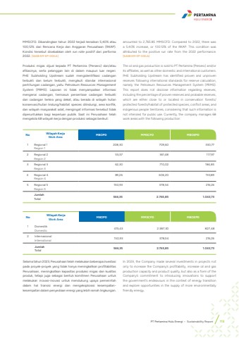 PT Pertamina Hulu Energi %u2022 Sustainability Report 113MMSCFD. Dibandingkan tahun 2022 terjadi kenaikan 5,40% atau 100,12% dari Rencana Kerja dan Anggaran Perusahaan (RKAP). Kondisi tersebut disebabkan oleh run rate positif dari performa 2022. [SASB EM-EP-000.A]Produksi migas d%u0133ual kepada PT Pertamina (Persero) dan/atau afiliasinya, serta pelanggan lain di dalam maupun luar negeri. PHE Subholding Upstream sudah mengidentifikasi cadangan terbukti dan belum terbukti, mengikuti standar internasional perhitungan cadangan, yaitu Petroleum Resources Management System (PRMS). Laporan ini tidak menyampaikan informasi mengenai cadangan, termasuk persentase cadangan terbukti dan cadangan terkira yang dekat, atau berada di wilayah hutan konservasi/hutan lindung/habitat spesies dilindungi, area konflik, dan wilayah masyarakat adat, mengingat informasi tersebut tidak diperuntukkan bagi keperluan publik. Saat ini Perusahaan telah mengelola 68 wilayah kerja dengan produksi sebagai berikut: amounted to 2,765.85 MMSCFD. Compared to 2022, there was a 5.40% increase, or 100.12% of the RKAP. This condition was attributed to the positive run rate from the 2022 performance. [SASB EM-EP-000.A]The oil and gas production is sold to PT Pertamina (Persero) and/or its affiliates, as well as other domestic and international customers. PHE Subholding Upstream has identified proven and unproven reserves following international standards for reserve calculation, namely the Petroleum Resources Management System (PRMS). This report does not disclose information regarding reserves, including the percentage of proven reserves and probable reserves, which are either close to or located in conservation forests/protected forests/habitat of protected species, conflict areas, and indigenous people territories, considering that such information is not intended for public use. Currently, the company manages 68 work areas with the following production:No Wilayah KerjaWork Area MBOPD MMSCFD MBOEPD1 DomestikDomestic 415,43 2.387,30 827,482 InternasionalInternational 150,93 378,54 216,26JumlahTotal 566,35 2.765,85 1.043,73No Wilayah KerjaWork Area MBOPD MMSCFD MBOEPD1 Regional 1Region 1208,30 709,60 330,772 Regional 2Region 255,57 361,48 117,973 Regional 3Region 362,30 710,02 184,854 Regional 4Region 489,26 606,20 193,895 Regional 5Region 5150,93 378,54 216,26JumlahTotal 566,35 2.765,85 1.043,73Selama tahun 2023, Perusahaan telah melakukan beberapa investasi pada proyek-proyek yang tidak hanya meningkatkan profitabilitas Perusahaan, meningkatkan kapasitas produksi migas dan kualitas produk, tetapi juga sebagai bentuk komitmen Perusahaan untuk melakukan inovasi-inovasi untuk mendukung upaya pemerintah dalam hal transisi energi dan mengeksplorasi kesempatankesempatan dalam penyediaan energi yang lebih ramah lingkungan. In 2023, the Company made several investments in projects not only to increase the Company%u2019s profitability, increase oil and gas production capacity and product quality, but also as a form of the Company%u2019s commitment to introducing innovations to support the government%u2019s endeavours in the context of energy transition and explore opportunities in the supply of more environmentally friendly energy.