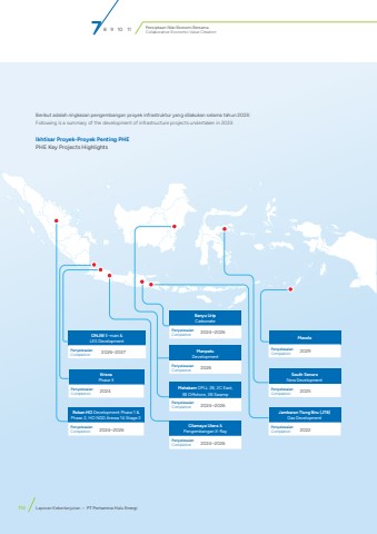 Penciptaan Nilai Ekonomi BersamaCollaborative Economic Value Creation114 Laporan Keberlanjutan %u2022 PT Pertamina Hulu EnergiIkhtisar Proyek-Proyek Penting PHEPHE Key Projects HighlightsRokan HO Development Phase 1 & Phase 2, HO NDD Arewa 14 Stage 2PenyelesaianCompletion 2024%u20132026ManpatuDevelopmentPenyelesaianCompletion 2026Krisna Phase 3PenyelesaianCompletion 2024ONJW E-main & LES DevelopmentPenyelesaianCompletion 2026%u20132027South Senoro New DevelopmentPenyelesaianCompletion 2025Jambaran Tiung Biru (JTB) Gas DevelopmentPenyelesaianCompletion 2022MaselaPenyelesaianCompletion 2029Banyu Urip CarbonatePenyelesaianCompletion 2024%u20132026Mahakam OPLL 2B, 2C East, 3B Offshore, 3B SwampPenyelesaianCompletion 2024%u20132026Cilamaya Utara & Pengembangan X-RayPenyelesaianCompletion 2024%u20132026Berikut adalah ringkasan pengembangan proyek infrastruktur yang dilakukan selama tahun 2023:Following is a summary of the development of infrastructure projects undertaken in 2023:114 Laporan Keberlanjutan %u2022 PT Pertamina Hulu Energi7 8 9 10 11