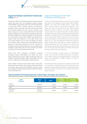 Penciptaan Nilai Ekonomi BersamaCollaborative Economic Value Creation116 Laporan Keberlanjutan %u2022 PT Pertamina Hulu EnergiTarget dan Realisasi Laba Bersih, Produksi dan Lifting [OJK F.2]Selama tahun 2023, PHE Subholding Upstream telah menemukan sumber daya migas baru hasil pengeboran eksplorasi sebesar 239,93 MMBOE yang diperoleh dari South East Mandala (SEM)-1, Sungai Rotan (SRT)-1, NSO-R2, NSO-S2, dan NSO-XLLL1 (Regional 1); Sumur East Akasia Cinta (EAC)-001 dan East Pondok Aren (EPN)-001 (Regional 2); Sumur Helios-1, Adiwarna-1 dan Polaris-1 (Regional 3); Sumur Kembo (KMO)-001 dan East Wolai (EWO)-001 (Regional 4); Sumur FB3N, Mong Merah, Hikmat dan Dermawan (Regional 5). Sementara tambahan 2C dari hasil studi dan reassessment sebesar 248,22 MMBOE yang diperoleh dari struktur Mindal Emas (Regional 1), North Zelda, Krisna, Hana, Sumi, Tambun Kelapa, SC-4, KL-3 dan Janti (Regional 2), Serban, Dian, Pemarung, Ragat, Offshore Bunyu Barat-OBB dan Manpatu (Regional 3), Mogoi Deep (Regional 4), dan D9-1 (Regional 5). Terdapat 3 temuan big fish dari pengeboran sumur eksplorasi yang dicatatkan di tahun 2023 yaitu dari sumur NSO-R2, East Akasia Cinta (EAC)-001 dan East Pondok Aren (EPN)-001.Selama tahun 2023, Perusahaan mencatatkan perolehan pendapatan sebesar USD14.568,38 juta, dengan laba bersih sebesar USD2.725,54 juta, atau 72,82% dari Rencana Kerja dan Anggaran Perusahaan (RKAP) sebesar USD3.742,66 juta, dan menurun 41,69% dari tahun 2022 sebesar USD4.674,16 juta. Seluruh kegiatan operasional baik produksi maupun lifting tetap berlangsung secara optimal. Uraian lengkap jumlah total produksi dan realisasi lifting migas PHE Subholding Upstream selama periode pelaporan dapat dilihat pada Laporan Tahunan Perusahaan Tahun 2023 halaman 161.Target and Realization of Net Profit, Production and Lifting [OJK F.2]In 2023, PHE Subholding Upstream has discovered a new oil and gas resource from exploration drilling, totaling 239.93 MMBOE, obtained from South East Mandala (SEM)-1, Sungai Rotan (SRT)-1, NSO-R2, NSO-S2, and NSO-XLLL1 (Regional 1); East Akasia Cinta (EAC)-001 and East Pondok Aren (EPN)-001 Wells (Regional 2); Helios-1, Adiwarna-1 and Polaris-1 Wells (Regional 3); Kembo (KMO)-001 and East Wolai (EWO)-001 Wells (Regional 4); FB3N, Mong Merah, Hikmat and Dermawan Wells (Regional 5). Meanwhile, an additional 2C from the study and reassessment results totaled 248.22 MMBOE obtained from the structure of Mindal Emas (Regional 1), North Zelda, Krisna, Hana, Sumi, Tambun Kelapa, SC-4, KL-3 and Janti (Regional 2), Serban, Dian, Pemarung, Ragat, Offshore Bunyu Barat-OBB and Manpatu (Regional 3), Mogoi Deep (Regional 4), and D9-1 (Regional 5). There are 3 big fish findings from exploration well drilling recorded in 2023, namely from the NSO-R2 well, East Akasia Cinta (EAC)-001 and East Pondok Aren (EPN)-001 wells respectively.In 2023, the Company recorded revenue of USD14,568.38 million, with a net profit of USD2,725.54 million, or 72.82% of the Company's Work Plan and Budget (RKAP) of USD3,742.66 million, and decreased by 41.69% compared to 2022 of USD4,674.16 million. All operational activities, both production and lifting, have continued to run optimally. A complete description of the total production and realization of PHE Subholding Upstream's oil and gas lifting during the reporting period can be seen in the Company%u2019s 2023 Annual Report on page 161.UraianDescriptionSatuanUnit RKAP RealisasiRealizationPersentasePercentageProduksiProduction MBOEPD 1.072,22 1.043,73 97,34%Lifting MBOEPD 916,58 905,40 98,78%Laba BersihNet ProfitUSD JutaUSD Million 3.742,66 2.725,54 72,82%Target dan Realisasi PHE Subholding Upstream: Produksi Migas, Lifting Migas, dan Laba Bersih PHE Subholding Upstream's Target and Realization: Oil & Gas Production, Oil & Gas Lifting, and Net Profit 7 8 9 10 11