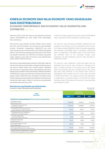 PT Pertamina Hulu Energi %u2022 Sustainability Report 117Pada tahun 2023, jumlah nilai ekonomi yang diperoleh Perusahaan sebesar USD14,568,38 juta, lebih rendah 9,12% dibandingkan tahun sebelumnya. Nilai ekonomi yang dihasilkan tersebut 99,94% persen berasal dari bisnis utama Perusahaan. Dari nilai ekonomi yang dihasilkan tersebut, Perusahaan menggunakan USD8.223,75 juta untuk biaya operasional, dan mendistribusikan USD1.386,26 juta kepada pekerja, USD4.123,59 juta kepada penyandang dana, USD1.766,49 juta kepada Pemerintah, dan USD14,94 juta kepada masyarakat melalui anggaran sosial. Total nilai ekonomi yang didistribusikan adalah sebesar USD15.515,03 juta. Nilai ekonomi yang didistribusikan pada tahun 2023 lebih tinggi dari nilai ekonomi langsung yang dihasilkan, sehingga terdapat penurunan nilai ekonomi ditahan selama tahun berjalan sebesar USD938,76 juta. Penurunan ini dikarenakan dividen yang dibayarkan pada tahun berjalan yang merupakan dividen atas laba tahun sebelumnya sebesar USD3.664,30 juta yang mana lebih besar daripada laba bersih tahun berjalan sebesar USD2.725,54 juta. Perusahaan memastikan bahwa distribusi kepada pemangku kepentingan dilakukan berdasarkan asas manfaat dan tepat sasaran. Berikut ini nilai ekonomi yang dihasilkan dan didistribusikan pada tahun 2023: In 2023, the Company obtained an economic value of USD14,568.38 million, a decrease of 9.12% compared to the previous year. This economic value, amounting to 99.94%, originated from the Company's core business. Out of the generated economic value, the Company utilized USD8,223.75 million for operational expenses and distributed USD1,386.26 million to employees, USD4,123.59 million to stakeholders, USD1,766.49 million to the Government, and USD14.94 million to the community through social investment. The total distributed economic value amounted to USD15,515.03 million. The economic value distributed in 2023 was higher than the generated direct economic value, resulting in a decrease of the value of retained earnings in the current year by USD 938.76 million. This decrease was due to dividends paid in the current year which were dividends on the previous year's profit of USD3,664.30 million, greater than the current year's net profit of USD2,725.54 million. The Company ensures that distribution to stakeholders is conducted based on the benefit and target oriented principle. The following is the economic value generated and distributed in 2023: KINERJA EKONOMI DAN NILAI EKONOMI YANG DIHASILKAN DAN DIDISTRIBUSIKANECONOMIC PERFORMANCE AND ECONOMIC VALUE GENERATED AND DISTRIBUTED [GRI 3-3, 201-1]UraianDescriptionNilai EkonomiEconomic Value 2023 2022* 2021*Nilai Ekonomi Langsung Dihasilkan | Direct economic value generatedPendapatan UsahaOperating Revenues 14.568,38 16.183,40 11.740,08Pendapatan Minyak dan GasOil and Gas Revenue 13.974,86 15.583,86 11.319,55Jasa Distribusi dan Logistik EnergiEnergy Distribution and Logistics Services 434,65 483,71 297,15Pendapatan dari Jasa PengeboranRevenue from Drilling Services 107,19 85,19 102,13Jasa Penunjang MigasOil and Gas Support Services 51,68 30,64 21,26Penghasilan KeuanganFinancial Income 140,41 48,99 30,00Keuntungan selisih kurs, netoNet exchange gain (19,77) 53,83 5,29(Beban)/pendapatan lain-lain, netoNet (expenses)/revenue from other sources (112,75) (247,87) (103,05)Jumlah Penerimaan Nilai Ekonomi LangsungTotal Directly Generated Economic Value 14.576,27 16.038,35 11.672,32Nilai Ekonomi yang Dihasilkan dan DidistribusikanEconomic Value Generated and Distributed dalam juta USDin million USD