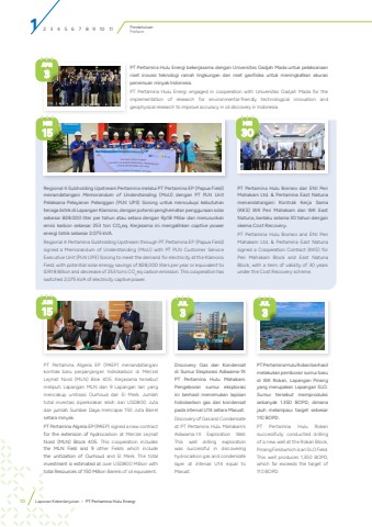 PT Pertamina Hulu Energi bekerjasama dengan Universitas Gadjah Mada untuk pelaksanaan riset inovasi teknologi ramah lingkungan dan riset geofisika untuk meningkatkan akurasi penemuan minyak Indonesia.PT Pertamina Hulu Energi engaged in cooperation with Universitas Gadjah Mada for the implementation of research for environmental-friendly technological innovation and geophysical research to improve accuracy in oil discovery in Indonesia.APR3MEI15MEI30PT Pertamina Algeria EP (PAEP) menandatangani kontrak baru perpanjangan hidrokarbon di Menzel Lejmat Nord (MLN) Blok 405. Kerjasama tersebut meliputi Lapangan MLN dan 9 Lapangan lain yang mencakup unitisasi Ourhoud dan El Merk. Jumlah total investasi diperkirakan lebih dari USD800 Juta dan jumlah Sumber Daya mencapai 150 Juta Barrel setara minyak.PT Pertamina Algeria EP (PAEP) signed a new contract for the extension of hydrocarbon at Menzel Lejmat Nord (MLN) Block 405. This cooperation includes the MLN Field and 9 other Fields which include the unitization of Ourhoud and El Merk. The total investment is estimated at over USD800 Million with total Resources of 150 Million Barrels of oil equivalent.Regional 4 Subholding Upstream Pertamina melalui PT Pertamina EP (Papua Field) menandatangani Memorandum of Understanding (MoU) dengan PT PLN Unit Pelaksana Pelayanan Pelanggan (PLN UP3) Sorong untuk mencukupi kebutuhan tenaga listrik di Lapangan Klamono, dengan potensi penghematan penggunaan solar sebesar 828.000 liter per tahun atau setara dengan Rp18 Miliar dan menurunkan emisi karbon sebesar 253 ton CO2eq. Kerjasama ini mengalihkan captive power energi listrik sebesar 2.075 kVA.Regional 4 Pertamina Subholding Upstream through PT Pertamina EP (Papua Field) signed a Memorandum of Understanding (MoU) with PT PLN Customer Service Executive Unit (PLN UP3) Sorong to meet the demand for electricity at the Klamono Field, with potential solar energy savings of 828,000 liters per year or equivalent to IDR18 Billion and decrease of 253 tons CO2eq carbon emission. This cooperation has switched 2,075 kVA of electricity captive power.PT Pertamina Hulu Borneo dan ENI Peri Mahakam Ltd. & Pertamina East Natuna menandatangani Kontrak Kerja Sama (KKS) WK Peri Mahakam dan WK East Natuna, berlaku selama 30 tahun dengan skema Cost Recovery.PT Pertamina Hulu Borneo and ENI Peri Mahakam Ltd. & Pertamina East Natuna signed a Cooperation Contract (KKS) for Peri Mahakam Block and East Natuna Block, with a term of validity of 30 years under the Cost Recovery scheme.JUN15Discovery Gas dan Kondensat di Sumur Eksplorasi Adiwarna-1X PT Pertamina Hulu Mahakam. Pengeboran sumur eksplorasi ini berhasil menemukan lapisan hidrokarbon gas dan kondensat pada interval U14 setara Maruat.Discovery of Gas and Condensate at PT Pertamina Hulu Mahakam's Adiwarna-1X Exploration Well. This well drilling exploration was successful in discovering hydrocarbon gas and condensate layer at interval U14 equal to Maruat.JUL3JUL3PT Pertamina Hulu Rokan berhasil melakukan pemboran sumur baru di WK Rokan, Lapangan Pinang yang merupakan Lapangan SLO. Sumur tersebut memproduksi sebanyak 1.350 BOPD, dimana jauh melampaui target sebesar 110 BOPD.PT Pertamina Hulu Rokan successfully conducted drilling of a new well at the Rokan Block, Pinang Field which is an SLO Field. This well produces 1,350 BOPD, which far exceeds the target of 110 BOPD.1 2 3 4 5 6 7 8 9 10 11 PendahuluanPreface10 Laporan Keberlanjutan %u2022 PT Pertamina Hulu Energi