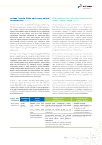 PT Pertamina Hulu Energi %u2022 Sustainability Report 121Financial Risks, Implications and Opportunities Due to Climate Change [GRI 201-2] Climate change has brought significant financial implications for PHE Subholding Upstream, particularly in view of operational and investment risks. Extreme changes in weather patterns and the increasing frequency of natural disasters can potentially disrupt production and exploration operations, both onshore as well as offshore, which can possibly cause delays in operations and increased maintenance costs. In addition, global transition moving towards low carbon energy and more stringent regulations concerning greenhouse gas emission pose a demand on PHE Subholding Upstream to invest in lean and efficient technology. Even though such investment is important for long-term sustainability, it requires the allocation of great amount of funds and can affect the Company%u2019s financial performance in the short term. On the other hand, climate change also opens up new opportunities for PHE Subholding Upstream to innovate and adapt to more sustainable business models. The global trend moving toward clean and renewable energy offers new opportunities to PHE Subholding Upstream to develop renewable energy projects, such as solar, wind, and bioenergy. PHE Subholding Upstream can also use this opportunity to solidify the Company's reputation as leader in sustainability and energy innovation. Thus, while climate change brings significant risks, it also provides opportunities for PHE Subholding Upstream to take a leading position in energy transition and create long-term values through responsible and innovative investment.Based on the analysis of Global Circulation Model (GCM), the average increase of temperature in Indonesia is projected to range between 0.8%u00ba - 1%u00baC in the period of 2020-2050, relative to the baseline period of 1961-1990. On the one hand, climate change brings risks, while on the other hand it presents opportunities for the Company. Following are the impacts of climate change which are bound to affect the Company%u2019s activities, the risks encountered by it, and financial implications.Implikasi Finansial, Risiko dan Peluang Karena Perubahan Iklim [GRI 201-2] Perubahan iklim membawa implikasi finansial yang signifikan bagi PHE Subholding Upstream, terutama dalam hal risiko operasional dan investasi. Perubahan pola cuaca ekstrem dan peningkatan frekuensi bencana alam dapat mengganggu operasi produksi dan eksplorasi, baik di darat maupun lepas pantai, yang berpotensi menyebabkan penundaan operasional dan peningkatan biaya pemeliharaan. Selain itu, transisi global menuju energi rendah karbon dan regulasi yang lebih ketat terkait emisi gas rumah kaca menuntut PHE Subholding Upstream untuk berinvestasi dalam teknologi bersih dan efisien. Investasi ini, meskipun penting untuk keberlanjutan jangka panjang, memerlukan alokasi dana yang besar dan dapat mempengaruhi kinerja finansial perusahaan dalam jangka pendek.Di sisi lain, perubahan iklim juga membuka peluang bagi PHE Subholding Upstream untuk berinovasi dan beradaptasi dengan model bisnis yang lebih berkelanjutan. Tren global menuju energi bersih dan terbarukan menawarkan peluang pasar baru bagi PHE Subholding Upstream untuk mengembangkan proyek energi terbarukan, seperti tenaga surya, angin, dan bioenergi. PHE Subholding Upstream juga dapat memanfaatkan peluang ini untuk memperkuat reputasi perusahaan sebagai pemimpin dalam keberlanjutan dan inovasi energi. Dengan demikian, meskipun perubahan iklim membawa risiko yang signifikan, ia juga memberikan kesempatan bagi PHE Subholding Upstream untuk memimpin transisi energi dan menciptakan nilai jangka panjang melalui investasi yang bertanggung jawab dan inovatif.Berdasarkan analisis dari Global Circulation Model (GCM), proyeksi kenaikan suhu rata-rata di Indonesia adalah antara 0,8%u00ba - 1%u00baC untuk periode 2020-2050, relatif terhadap periode baseline 1961-1990. Perubahan iklim tersebut memiliki risiko, dan memberikan peluang di sisi lain bagi Perusahaan. Berikut adalah dampak dari perubahan iklim yang akan mempengaruhi kegiatan Perusahaan, risiko yang dihadapi, dan implikasi keuangan.Kategori RisikoRisk CategoryJangka WaktuPeriodMasalah ProblemDeskripsi DampakImpact DescriptionDampak KeuanganMitigation, StrategyRisiko TransisiTransition RiskJangka pendekShort-termKenaikan harga emisi GRK misalnya pajak karbonGHG emission price increases such as carbon taxesIndonesia telah mengeluarkan undangundang tentang harmonisasi pajak sebagai dasar penerapan pajak karbon.Indonesia has passed a law on tax harmonization as the basis for implementing a carbon tax.%u2022 Kenaikan nilai pajak.%u2022 Kenaikan alokasi modal untuk proyek pengurangan emisi.%u2022 Increase in tax rate.%u2022 Increase in capital allocation for emission reduction projects.Kewajiban pelaporanReporting obligationsMengantisipasi perubahan dan menjaga keselarasan dengan kewajiban pelaporan iklim terkait dengan standar pelaporan keberlanjutan.Anticipate changes and maintain alignment with climate reporting obligations related to sustainability reporting standards.Peningkatan biaya tidak langsung.Increased indirect costs.