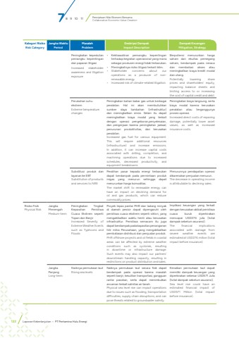 Penciptaan Nilai Ekonomi BersamaCollaborative Economic Value Creation122 Laporan Keberlanjutan %u2022 PT Pertamina Hulu EnergiKategori RisikoRisk CategoryJangka WaktuPeriodMasalah ProblemDeskripsi DampakImpact DescriptionDampak KeuanganMitigation, StrategyPeningkatan kepedulian pemangku kepentingan dan paparan litigasiIncreased stakeholder awareness and litigation exposure%u2022 Kekhawatiran pemangku kepentingan terhadap kegiatan operasional yang mana sebagai produsen energi tidak terbarukan.%u2022 Meningkatnya risiko litigasi terkait iklim. %u2022 Stakeholder concerns about our operations as a producer of nonrenewable energy.%u2022 Increased risk of climate-related litigation. Berpotensi menurunkan harga saham dan ekuitas pemegang saham, berdampak pada neraca dan membatasi akses atau meningkatkan biaya kredit modal dan utang.Potentially lowering share prices and shareholders' equity, impacting balance sheets and limiting access to or increasing the cost of capital credit and debt.Perubahan suhu ekstremExtreme temperature changesPeningkatan bahan bakar gas untuk berbagai peralatan. Hal ini akan membutuhkan sumber daya tambahan (infrastruktur) dan meningkatkan emisi. Selain itu dapat meningkatkan biaya modal yang terkait dengan operasi pengeboran,penyelesaian, dan pengerjaan karena peningkatan jadwal, penurunan produktivitas, dan kerusakan peralatan.Increased gas fuel for various equipment. This will require additional resources (infrastructure) and increase emissions. In addition, it can increase capital costs associated with drilling, completion, and machining operations due to increased schedules, decreased productivity, and equipment breakdowns.Peningkatan biaya langsung, serta biaya modal karena kerusakan peralatan atau terganggunya proses operasi.Increased direct costs of repairing damage, potentially lower asset values, as well as increased insurance costs.Substitusi produk dan layanan ke EBTSubstitution of products and services to NREPeralihan pasar kepada energi terbarukan dapat berdampak pada permintaan produk migas yang menurun sehingga dapat menurunkan harga komoditas.The market shift to renewable energy can have an impact on declining demand for oil and gas products, which can reduce commodity prices.Menurunnya pendapatan operasi dikarenakan penjualan menurun.The decrease in operating income is attributable to declining sales.Risiko FisikPhysical RiskJangka MenengahMedium-term Peningkatan Tingkat Keparahan Peristiwa Cuaca Ekstrem seperti Topan dan BanjirIncreased Severity of Extreme Weather Events such as Typhoons and FloodsProyek lepas pantai PHR dan ladang minyak di daerah pesisir dapat dipengaruhi oleh peristiwa cuaca ekstrem seperti siklon, yang mengakibatkan waktu henti atau kerusakan infrastruktur. Peristiwa semacam itu juga dapat berdampak pada kapasitas penanganan hilir mitra Perusahaan, yang mengakibatkan pembatasan distribusi dan penjualan produk.PHR offshore projects and oil fields in coastal areas can be affected by extreme weather conditions such as cyclones, resulting in downtime or infrastructure damage. Such events may also impact our partners' downstream handling capacity, resulting in restrictions on product distribution and sales.Implikasi keuangan yang terkait dengan kerusakan akibat peristiwa cuaca buruk diperkirakan mencapai USD274 juta (total dampak sebelum asuransi).The financial implications associated with damage from severe weather events are estimated at USD274 million (total impact before insurance).Jangka PanjangLong-term Naiknya permukaan lautRising sea levelsNaiknya permukaan laut secara fisik dapat berdampak pada operasi karena masalah seperti banjir, kesulitan transportasi, gangguan rantai pasokan, serta dapat menimbulkan ancaman terkait salinitas air tanah.Physical sea level rise can impact operations due to issues such as flooding, transportation difficulties, supply chain disruptions, and can pose threats related to groundwater salinity.Kenaikan permukaan laut dapat memiliki dampak keuangan yang diperkirakan sebesar USD571 Juta (total dampak sebelum asuransi).Sea level rise could have an estimated financial impact of USD571 Million (total impact before insurance).7 8 9 10 11