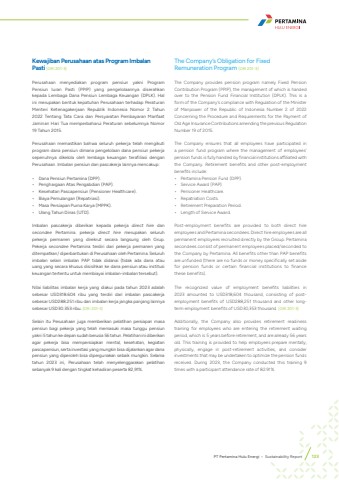 PT Pertamina Hulu Energi %u2022 Sustainability Report 123Kewajiban Perusahaan atas Program Imbalan Pasti [GRI 201-3]Perusahaan menyediakan program pensiun yakni Program Pensiun Iuran Pasti (PPIP) yang pengelolaannya diserahkan kepada Lembaga Dana Pensiun Lembaga Keuangan (DPLK). Hal ini merupakan bentuk kepatuhan Perusahaan terhadap Peraturan Menteri Ketenagakerjaan Republik Indonesia Nomor 2 Tahun 2022 Tentang Tata Cara dan Persyaratan Pembayaran Manfaat Jaminan Hari Tua memperbaharui Peraturan sebelumnya Nomor 19 Tahun 2015. Perusahaan memastikan bahwa seluruh pekerja telah mengikuti program dana pensiun dimana pengelolaan dana pensiun pekerja sepenuhnya dikelola oleh lembaga keuangan terafiliasi dengan Perusahaan. Imbalan pensiun dan pascakerja lainnya mencakup:%u2022 Dana Pensiun Pertamina (DPP).%u2022 Penghargaan Atas Pengabdian (PAP).%u2022 Kesehatan Pascapensiun (Pensioner Healthcare).%u2022 Biaya Pemulangan (Repatriasi).%u2022 Masa Persiapan Purna Karya (MPPK).%u2022 Ulang Tahun Dinas (UTD).Imbalan pascakerja diberikan kepada pekerja direct hire dan secondee Pertamina. pekerja direct hire merupakan seluruh pekerja permanen yang direkrut secara langsung oleh Grup. Pekerja secondee Pertamina terdiri dari pekerja permanen yang ditempatkan/ diperbantukan di Perusahaan oleh Pertamina. Seluruh imbalan selain imbalan PAP tidak didanai (tidak ada dana atau uang yang secara khusus disisihkan ke dana pensiun atau institusi keuangan tertentu untuk membiayai imbalan-imbalan tersebut).Nilai liabilitas imbalan kerja yang diakui pada tahun 2023 adalah sebesar USD318.604 ribu yang terdiri dari imbalan pascakerja sebesar USD288.251 ribu dan imbalan kerja jangka panjang lainnya sebesar USD30.353 ribu. [GRI 201-3]Selain itu Perusahaan juga memberikan pelatihan persiapan masa pensiun bagi pekerja yang telah memasuki masa tunggu pensiun yakni 5 tahun ke depan sudah berusia 56 tahun. Pelatihan ini diberikan agar pekerja bisa mempersiapkan mental, kesehatan, kegiatan pascapensiun, serta investasi yang mungkin bisa dijalankan agar dana pensiun yang diperoleh bisa dipergunakan sebaik mungkin. Selama tahun 2023 ini, Perusahaan telah menyelenggarakan pelatihan sebanyak 9 kali dengan tingkat kehadiran peserta 82,91%.The Company%u2019s Obligation for Fixed Remuneration Program [GRI 201-3]The Company provides pension program namely Fixed Pension Contribution Program (PPIP), the management of which is handed over to the Pension Fund Financial Institution (DPLK). This is a form of the Company%u2019s compliance with Regulation of the Minister of Manpower of the Republic of Indonesia Number 2 of 2022 Concerning the Procedure and Requirements for the Payment of Old Age Insurance Contributions amending the previous Regulation Number 19 of 2015. The Company ensures that all employees have participated in a pension fund program where the management of employees' pension funds is fully handled by financial institutions affiliated with the Company. Retirement benefits and other post-employment benefits include:%u2022 Pertamina Pension Fund (DPP).%u2022 Service Award (PAP).%u2022 Pensioner Healthcare.%u2022 Repatriation Costs.%u2022 Retirement Preparation Period.%u2022 Length of Service Award.Post-employment benefits are provided to both direct hire employees and Pertamina secondees. Direct hire employees are all permanent employees recruited directly by the Group. Pertamina secondees consist of permanent employees placed/seconded to the Company by Pertamina. All benefits other than PAP benefits are unfunded (there are no funds or money specifically set aside for pension funds or certain financial institutions to finance these benefits).The recognized value of employment benefits liabilities in 2023 amounted to USD318,604 thousand, consisting of postemployment benefits of USD288,251 thousand and other longterm employment benefits of USD30,353 thousand. [GRI 201-3]Additionally, the Company also provides retirement readiness training for employees who are entering the retirement waiting period, which is 5 years before retirement, and are already 56 years old. This training is provided to help employees prepare mentally, physically, engage in post-retirement activities, and consider investments that may be undertaken to optimize the pension funds received. During 2023, the Company conducted this training 9 times with a participant attendance rate of 82.91%.