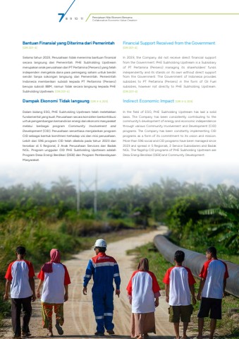 Penciptaan Nilai Ekonomi BersamaCollaborative Economic Value Creation124 Laporan Keberlanjutan %u2022 PT Pertamina Hulu EnergiBantuan Finansial yang Diterima dari Pemerintah[GRI 201-4]Selama tahun 2023, Perusahaan tidak menerima bantuan finansial secara langsung dari Pemerintah. PHE Subholding Upstream merupakan anak perusahaan dari PT Pertamina (Persero) yang telah independen mengelola dana para pemegang saham untuk berdiri sendiri tanpa sokongan langsung dari Pemerintah. Pemerintah Indonesia memberikan subsidi kepada PT Pertamina (Persero) berupa subsidi BBM, namun tidak secara langsung kepada PHE Subholding Upstream. [GRI 201-4]Dampak Ekonomi Tidak langsung [GRI 3-3, 203]Dalam bidang ESG, PHE Subholding Upstream telah meletakkan fundamental yang kuat. Perusahaan secara konsisten berkontribusi untuk pengembangan kemandirian energi dan ekonomi masyarakat melalui berbagai program Community Involvement and Development (CID). Perusahaan senantiasa menjalankan program CID sebagai bentuk komitmen terhadap visi dan misi perusahaan. Lebih dari 596 program CID telah dikelola pada tahun 2023 dan tersebar di 5 Regional, 2 Anak Perusahaan Services dan Badak NGL. Program unggulan CID PHE Subholding Upstream adalah Program Desa Energi Berdikari (DEB) dan Program Pemberdayaan Masyarakat. Financial Support Received from the Government[GRI 201-4]In 2023, the Company did not receive direct financial support from the Government. PHE Subholding Upstream is a Subsidiary of PT Pertamina (Persero) managing its shareholders%u2019 funds independently and its stands on its own without direct support from the Government. The Government of Indonesia provides subsidies to PT Pertamina (Persero) in the form of Oil Fuel subsidies, however not directly to PHE Subholding Upstream. [GRI 201-4]Indirect Economic Impact [GRI 3-3, 203]In the field of ESG, PHE Subholding Upstream has laid a solid basis. The Company has been consistently contributing to the community%u2019s development of energy and economic independence through various Community Involvement and Development (CID) programs. The Company has been constantly implementing CID programs as a form of its commitment to its vision and mission. More than 596 social and CID programs have been managed since 2023 and spread in 5 Regionals, 2 Service Subsidiaries and Badak NGL. The flagship CID programs of PHE Subholding Upstream are Desa Energi Berdikari (DEB) and Community Development. 7 8 9 10 11