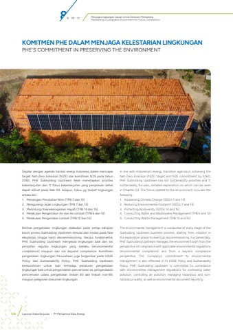 Menjaga Lingkungan Lestari untuk Generasi MendatangMaintaining a Sustainable Environment for Future Generations128 Laporan Keberlanjutan %u2022 PT Pertamina Hulu EnergiKOMITMEN PHE DALAM MENJAGA KELESTARIAN LINGKUNGAN PHE'S COMMITMENT IN PRESERVING THE ENVIRONMENTSejalan dengan agenda transisi energi Indonesia dalam mencapai target Net-Zero Emission (NZE) dan komitmen NZE pada tahun 2060, PHE Subholding Upstream telah menetapkan prioritas keberlanjutan dan 11 fokus keberlanjutan yang penjelasan detail dapat dilihat pada Bab 03. Adapun fokus yg terkait lingkungan antara lain:1. Menangani Perubahan Iklim (TPB 7 dan 13) 2. Mengurangi Jejak Lingkungan (TPB 7 dan 13)3. Melindungi Keanekaragaman Hayati (TPB 14 dan 15)4. Melakukan Pengelolaan Air dan Air Limbah (TPB 6 dan 12)5. Melakukan Pengelolaan Limbah (TPB 12 dan 15)Bentuk pengelolaan lingkungan dilakukan pada setiap tahapan bisnis proses Subholding Upstream dimulai dari inisiasi pada fase eksplorasi hingga nanti decommissioning. Secara fundamental, PHE Subholding Upstream mengelola lingkungan baik dari sisi penaatan regulasi lingkungan yang berlaku (environmental compliance) maupun dari sisi beyond compliance. Komitmen pengelolaan lingkungan Perusahaan juga tergambar pada HSSE Policy dan Sustainability Policy. PHE Subholding Upstream berkomitmen untuk taat terhadap peraturan pengelolaan lingkungan baik untuk pengendalian pencemaran air, pengendalian pencemaran udara, pengelolaan limbah B3 dan limbah non-B3, maupun pelaporan dokumen lingkungan. In line with Indonesia's energy transition agenda in achieving the Net-Zero Emission (NZE) target and NZE commitment by 2060, PHE Subholding Upstream has set sustainability priorities and 11 sustainability focuses, detailed explanation on which can be seen in Chapter 03. The focus related to the environment includes the following: 1. Addressing Climate Change (SDGs 7 and 13)2. Reducing Environmental Footprint (SDGs 7 and 13) 3. Protecting Biodiversity (SDGs 14 and 15) 4. Conducting Water and Wastewater Management (TPB 6 and 12) 5. Conducting Waste Management (TPB 12 and 15)The environmental management is conducted at every stage of the Subholding Upstream business process, starting from initiation in the exploration phase to eventual decommissioning. Fundamentally, PHE Subholding Upstream manages the environment both from the perspective of compliance with applicable environmental regulations (environmental compliance) and from a beyond compliance perspective. The Company's commitment to environmental management is also reflected in its HSSE Policy and Sustainability Policy. PHE Subholding Upstream is committed to compliance with environmental management regulations for controlling water pollution, controlling air pollution, managing hazardous and nonhazardous waste, as well as environmental document reporting. 89 10 11