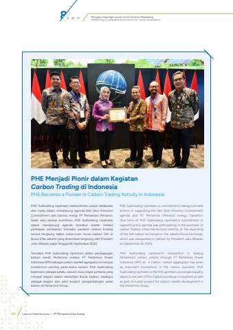 Menjaga Lingkungan Lestari untuk Generasi MendatangMaintaining a Sustainable Environment for Future Generations130 Laporan Keberlanjutan %u2022 PT Pertamina Hulu EnergiPHE Menjadi Pionir dalam KegiatanCarbon Trading di IndonesiaPHE Becomes a Pioneer in Carbon Trading Activity in IndonesiaPHE Subholding Upstream berkomitmen untuk melakukan aksi nyata dalam mendukung agenda Net Zero Emission Commitment dan transisi energi PT Pertamina (Persero). Salah satu bentuk komitmen PHE Subholding Upstream dalam mendukung agenda tersebut adalah melalui partisipasi pembelian transaksi perdana carbon tradingsecara langsung dalam peluncuran bursa karbon IDX di Bursa Efek Jakarta yang diresmikan langsung oleh Presiden Joko Widodo pada Tanggal 26 September 2023.Transaksi PHE Subholding Upstream dalam perdagangan karbon kredit Pertamina melalui PT Pertamina Power Indonesia (PPI) sebagai carbon market agregator ini menjadi momentum penting pada bisnis karbon. PHE Subholding Upstream sebagai pelaku industri hulu migas pertama yang menjadi bagian dalam ekosistem Bursa Karbon sekaligus sebagai bagian dari pilot project pengembangan pasar karbon di Pertamina Group.PHE Subholding Upstream is committed to taking concrete actions in supporting the Net Zero Emission Commitment agenda and PT Pertamina (Persero) energy transition. One form of PHE Subholding Upstream's commitment in supporting this agenda was participating in the purchase of carbon trading initial transactions directly at the launching of the IDX carbon exchange on the Jakarta Stock Exchange, which was inaugurated in-person by President Joko Widodo on September 26, 2023. PHE Subholding Upstream's transaction in trading Pertamina's carbon credits through PT Pertamina Power Indonesia (PPI) as a carbon market aggregator has been an important momentum in the carbon business. PHE Subholding Upstream is the first upstream oil and gas industry player to be part of the Carbon Exchange ecosystem as well as part of a pilot project for carbon market development in the Pertamina Group.89 10 11