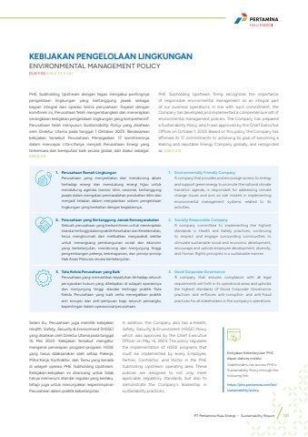 PT Pertamina Hulu Energi %u2022 Sustainability Report 131PHE Subholding Upstream dengan tegas mengakui pentingnya pengelolaan lingkungan yang bertanggung jawab sebagai bagian integral dari operasi bisnis perusahaan. Sejalan dengan komitmen ini, Perusahaan telah mengembangkan dan menerapkan serangkaian kebijakan pengelolaan lingkungan yang komprehensif. Perusahaan telah menyusun Sustainability Policy yang disahkan oleh Direktur Utama pada tanggal 1 Oktober 2022. Berdasarkan kebijakan tersebut Perusahaan Menegaskan 17 komitmennya dalam mencapai cita-citanya menjadi Perusahaan Energi yang terkemuka dan bereputasi baik secara global, dan diakui sebagai: [GRI 2-23]PHE Subholding Upstream firmly recognizes the importance of responsible environmental management as an integral part of our business operations. In line with such commitment, the Company has developed and implemented a comprehensive set of environmental management policies. The Company has prepared a Sustainability Policy which was approved by the Chief Executive Officer on October 1, 2022. Based on this policy, the Company has affirmed its 17 commitments to achieving its goal of becoming a leading and reputable Energy Company globally, and recognized as: [GRI 2-23]KEB%u0132AKAN PENGELOLAAN LINGKUNGANENVIRONMENTAL MANAGEMENT POLICY[OJK F.16] [GRI 2-23, 2-24]1. Perusahaan Ramah LingkunganPerusahaan yang menyediakan dan mendorong akses terhadap energi dan mendukung energi hijau untuk mendukung agenda transisi iklim nasional, bertanggung jawab dalam mengatasi permasalahan perubahan iklim dan menjadi teladan dalam menjalankan sistem pengelolaan lingkungan yang berkaitan dengan kegiatannya.1. Environmentally Friendly CompanyA company that provides and encourage access to energy and support green energy to promote the national climate transition agenda, is responsible for addressing climate change issues and acrs as role models in implementing environmental management systems related to its activities.2. Perusahaan yang Bertanggung Jawab KemasyarakatanSebuah perusahaan yang berkomitmen untuk menerapkan standar tertinggi dalam praktik Kesehatan dan Keselamatan, terus menghormati dan melibatkan masyarakat sekitar untuk merangsang pembangunan sosial dan ekonomi yang berkelanjutan, mendorong dan menjunjung tinggi pengembangan pekerja, keberagaman, dan prinsip-prinsip Hak Asasi Manusia secara berkelanjutan.2. Socially Responsible CompanyA company committed to implementing the highest standards in Health and Safety practices, continuing to respect and engage surrounding communities to stimulate sustainable social and economic development, encourage and uphold employee development, diversity, and Human Rights principles in a sustainable manner.3. Tata Kelola Perusahaan yang BaikPerusahaan yang memastikan kepatuhan terhadap seluruh persyaratan hukum yang ditetapkan di wilayah operasinya dan menjunjung tinggi standar tertinggi praktik Tata Kelola Perusahaan yang baik serta menegakkan praktik anti korupsi dan anti-penipuan bagi seluruh pemangku kepentingan dalam operasional perusahaan.3. Good Corporate GovernanceA company that ensures compliance with all legal requirements set forth in its operational areas and upholds the highest standards of Good Corporate Governance practices and enforces anti-corruption and anti-fraud practices for all stakeholders in the company's operations.Selain itu, Perusahaan juga memiliki kebijakan Health, Safety, Security & Environment (HSSE) yang disahkan oleh Direktur Utama pada tanggal 16 Mei 2023. Kebijakan tersebut mengatur mengenai penerapan program-program HSSE yang harus dilaksanakan oleh setiap Pekerja, Mitra Kerja, Kontraktor, dan Tamu yang berada di wilayah operasi PHE Subholding Upstream. Kebijakan-kebijakan ini dirancang untuk tidak hanya memenuhi standar regulasi yang berlaku, tetapi juga untuk menunjukkan kepemimpinan Perusahaan dalam praktik keberlanjutan. In addition, the Company also has a Health, Safety, Security & Environment (HSSE) Policy which was approved by the Chief Executive Officer on May 16, 2023. The policy regulates the implementation of HSSE programs that must be implemented by every Employee, Partner, Contractor, and Visitor in the PHE Subholding Upstream operating area. These policies are designed to not only meet applicable regulatory standards, but also to demonstrate the Company's leadership in sustainability practices. Kebijakan Keberlanjutan PHE dapat diakses melalui:Stakeholders can access PHE's Sustainability Policy through the following link:https://phe.pertamina.com/en/sustainability/policy