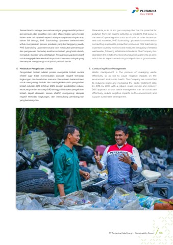 PT Pertamina Hulu Energi %u2022 Sustainability Report 135Sementara itu sebagai perusahaan migas yang memiliki potensi pencemaran dari kegiatan non-rutin atau insiden yang terjadi dalam area unit operasi seperti adanya tumpahan minyak atau bahan B3 lainnya, PHE Subholding Upstream berkomitmen untuk menjalankan proses produksi yang bertanggung jawab. PHE Subholding Upstream secara rutin melakukan pemantauan dan pengukuran terhadap kualitas air limbah yang telah diolah, mengikuti standar yang ditetapkan. Perusahaan juga berinisiatif untuk meginjeksikan kembali air produksi ke sumur minyak yang berdampak mengurangi total polusi pada air tanah.5. Melakukan Pengelolaan LimbahPengelolaan limbah adalah proses mengelola limbah secara efektif agar tidak menimbulkan dampak negatif terhadap lingkungan dan kesehatan manusia. Perusahaan berkomitmen untuk mengurangi limbah dan meningkatkan rasio pengolahan limbah sebesar 40% di tahun 2025 dengan pendekatan reduce, reuse, recycle dan recovery (4R) sehingga diharapkan pengelolaan limbah dapat dilakukan secara efektif, mengurangi dampak negatif terhadap lingkungan, dan mendukung pembangunan yang berkelanjutan.Meanwhile, as an oil and gas company that has the potential for pollution from non-routine activities or incidents that occur in the area of operating units such as oil spills or other hazardous and toxic materials, PHE Subholding Upstream is committed to conducting responsible production processes. PHE Subholding Upstream routinely monitors and measures the quality of treated wastewater, following established standards. The Company has also taken the initiative to reinject production water into oil wells which has an impact on reducing total pollution in groundwater.5. Conducting Waste Management Waste management is the process of managing waste effectively so as not to cause negative impacts on the environment and human health. The Company are committed to reducing waste and increasing the waste treatment ratio by 40% by 2025 with a reduce, reuse, recycle and recovery (4R) approach so that waste management can be conducted effectively, reduce negative impacts on the environment, and support sustainable development.