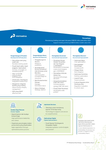 PT Pertamina Hulu Energi %u2022 Sustainability Report 137Sumber Daya ManusiaHuman Capital%u2022 Kepemimpinan dan budaya kinerja tinggi High performance leadership and culture%u2022 Organisasi yang tangkas melalui proses bisnis yang dioptimalkan Agile organization through optimized business process Optimalisasi Digital Digital Optimalization%u2022 Pusat Operasi Terintegrasi & Pengadaan Digital Integrated operation center & digital procurementUpstream Services%u2022 Teknologi untuk mendukung layanan inti & daya saing Technology to support core service & competitivenessPengembangan & Produksi Development & Production%u2022 Memulihkan aset yang sudah ada Revitalize existing assets%u2022 Proyek tepat waktu, tepat anggaran, tepat jadwal On time, on budget, on schedule projects%u2022 Step out & EOR%u2022 Integrasi POD POD Integration%u2022 Infrastruktur Terintegrasi Integrated infrastructure%u2022 Manajemen integritas fasilitas yang matang Mature facility integrity management%u2022 ASR yang efektif Affective ASRPengembangan BisnisBusiness Development%u2022 Penggabungan & AkuisisiMerger & acquisition%u2022 Studi Bersama/Ronde Penawaran/Hak Istimewa untuk Blok Baru Joint study/bid round/privilege for new block%u2022 Blok Pemberhentian Manajer Manager termination block%u2022 Aliansi StrategisStrategic alliancePeningkatan Komersial Commercial Improvement%u2022 Monetisasi Minyak Mentah Tersandera dan Gas Marginal (<25MMBOE) Monetization of stranded crude oil and marginal gas (<25MMBOE)%u2022 Memastikan GSA dan Alokasi Gas Securing GSA and gas allocation%u2022 Sinergi Komersialisasi (C&T), KPI, SHG) Commercialization synergy (C&T, KPI, SHG)%u2022 Produk Slide MonetisasiMonetization slide productPeningkatan Ekonomi Economical Improvement%u2022 Optimisasi Biaya Cost optimization%u2022 Meningkatkan Keuntungan Increase profit%u2022 Mitigasi Risiko Risk mitigation%u2022 Optimisasi Portofolio Portfolio optimization%u2022 Insentif Fiskal Fiscal incentives%u2022 Evaluasi Regulasi untuk Membuka Nilai Regulation evaluation to unlock valuePerusahaanMendukung Holding mencapai nilai pasar ES$100 miliar pada tahun 2021Support Holding achieving ES$100 billion market value 2021Penjelasan lebih detail terkait Tata Kelola Keberlanjutan dapat dilihat pada Bab 6 dalam Laporan Keberlanjutan ini. A more detailed explanation on Sustainability Governance can be seen in Chapter 6 of this Sustainability Report.