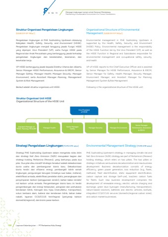 Menjaga Lingkungan Lestari untuk Generasi MendatangMaintaining a Sustainable Environment for Future Generations138 Laporan Keberlanjutan %u2022 PT Pertamina Hulu EnergiStruktur Organisasi Pengelolaan Lingkungan [SASB EM-EP-160a.1]Pengelolaan lingkungan di PHE Subholding Upstream didukung Kebijakan Health, Safety, Security, and Environment (HSSE). Pengelolaan lingkungan menjadi tanggung jawab Fungsi HSSE yang dipimpin Vice President (VP), serta Fungsi HSSE pada Regional dan Anak Perusahaan yang bertanggung jawab terhadap pengelolaan lingkungan dan keselamatan, keamanan, dan kesehatan kerja. VP HSSE bertanggung jawab kepada Direktur Utama dan dibantu Senior Manager HSSE Performance, Assurance & ERCM; Senior Manager Safety; Manager Health; Manager Security; Manager Environment; serta Assistant Manager Planning, Management System & Risk Management.Berikut adalah struktur organisasi unit HSSE:Organizational Structure of Environmental Management [SASB EM-EP-160a.1]Environmental management in PHE Subholding Upstream is supported by the Health, Safety, Security, and Environment (HSSE) Policy. Environmental management is the responsibility of the HSSE Function led by the Vice President (VP), as well as the HSSE Function in Regional and Subsidiaries responsible for environmental management and occupational safety, security, and health. VP of HSSE reports to the Chief Executive Officer and is assisted by Senior Manager for HSSE Performance, Assurance & ERCM; Senior Manager for Safety; Health Manager; Security Manager; Environment Manager; and Assistant Manager for Planning, Management System &;Risk Management.Following is the organizational structure of the HSSE unit:Strategi Pengelolaan Lingkungan [TCFD STR-a,b,c]Strategi PHE Subholding Upstream dalam mengelola risiko iklim dan strategi Net Zero Emission (NZE) merupakan bagian dari strategi holding Pertamina (Persero), yang bertumpu pada dua pilar. Dua pilar atau inisiatif strategis tersebut adalah dekarbonisasi dunia usaha dan pembangunan bisnis baru. Dekarbonisasi bisnis terdiri dari efisiensi energi, pembangkit listrik ramah lingkungan, pengurangan kerugian (misalnya suar bakar, metana), elektrifikasi armada, elektrifikasi peralatan statis, penangkapan dan penyimpanan karbon (penggunaan sendiri), bahan bakar rendah/nol karbon untuk armada. Pengembangan bisnis baru ini terdiri pengembangan dari energi terbarukan, pengisian dan pertukaran kendaraan listrik, hidrogen biru hijau (manufaktur, transportasi), solusi berbasis alam, baterai dan kendaraan listrik, bahan bakar nabati, layanan CCS/CCUS terintegrasi (penyerap karbon domestik/regional), dan bisnis pasar karbon.Environmental Management Strategy [TCFD STR-a,b,c]PHE Subholding Upstream's strategy in managing climate risk and Net Zero Emission (NZE) strategy are part of Pertamina's (Persero) holding strategy, which relies on two pillars. The two pillars or strategic initiatives are business decarbonization and new business development. Business decarbonization consists of energy efficiency, green power generation, loss reduction (e.g., flares, methane), fleet electrification, static equipment electrification, carbon capture and storage (self-use), low/zero carbon fuels for fleets. Such new business development comprises the development of renewable energy, electric vehicle charging and exchange, green blue hydrogen (manufacturing, transportation), nature-based solutions, batteries and electric vehicles, biofuels, integrated CCS/CCUS services (domestic/regional carbon sinks), and carbon market businesses.Struktur Organisasi Unit HSSEOrganizational Structure of the HSSE UnitVice President of HSSEAssistant Manager of HSSE, Planning. MS & RM Manager Health Manager SecuritySenior Manager Performance, Assurance & ERCMSenior ManagerSafety Manager Environment89 10 11