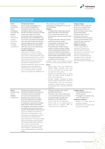 PT Pertamina Hulu Energi %u2022 Sustainability Report 145Risiko Fisik Jangka Pendek 2023-2025Short-term Physical Risks 2023-2025KronisPerubahan suhu ekstrim diikuti peningkatan suhu rata-rataChronicExtreme temperature changes followed by increases in average temperaturesDampak pada OperasiPenurunan atau peningkatan suhu ekstrim dapat mengakibatkan peningkatan bahan bakar untuk berbagai peralatan, bersama dengan peralatan tambahan (misalnya, pemanas bangunan dan pipa). Hal ini akan memerlukan sumber daya tambahan (infrastruktur) dan meningkatkan emisi. Suhu ekstrim juga dapat meningkatkan biaya operasional yang terkait dengan operasi pengeboran dan risiko adanya pekerjaan ulang karena penambahan waktu kerja, penurunan produktivitas, kerusakan peralatan, dll.Impact on OperationsA decrease or increase in extreme temperatures can result in increased use of fuel for various equipment, along with additional equipment (e.g., building heating and plumbing). This l requires additional resources (infrastructure) and causes increased emissions. Extreme temperatures can also increase operational costs associated with drilling operations and risk of rework due to increased uptime, decreased productivity, equipment breakdown, etc.Biaya langsung yang meningkat, mempengaruhi pendapatan, arus kas, dan neraca keuangan.Tindakan:- Mengidentifikasi biaya langsung yang paling terpengaruh oleh perubahan iklim, termasuk biaya seperti yang terkait dengan konsumsi energi, air, dan asuransi.- Mengkuantifikasikan dampak potensial pada biaya langsung, dengan menambahkan variabel iklim pada perhitungan risiko keuangan.- Mengembangkan strategi mitigasi dengan mengambil langkah-langkah untuk mengurangi kemungkinan atau dampak peningkatan biaya langsung. Dimana hal ini bisa melibatkan investasi dalam langkah-langkah efisiensi energi, mengurangi penggunaan air, atau membeli asuransi risiko iklim.Increased direct costs, affecting revenue, cash flow, as well as financial balance sheet.Action:- Identify direct costs most affected by climate change, including costs such as those associated with energy, water consumption, and insurance.- Quantify the potential impact on direct costs, by adding climate variables to financial risk calculations.- Develop mitigation strategies by taking steps to reduce the likelihood or impact of increased direct costs. This could involve investing in energy efficiency measures, reducing water use, or buying climate risk insurance.Strategi mitigasi:Melakukan evaluasi risiko yang tepat untuk mengidentifikasi dampak potensial dari suhu ekstrim terhadap operasi, biaya, dan kinerja keuangan.Mengembangkan rencana manajemen risiko yang komprehensif untuk menangani risiko yang teridentifikasi secara sistematis, yaitu melalui risk register perusahaan.Mitigation strategies:Conduct appropriate risk evaluations to identify the potential impact of extreme temperatures on operations, costs, and financial performance.Develop a comprehensive risk management plan to deal with identified risks systematically, namely through the Company's risk register.KronisKenaikan muka air lautChronicSea level riseDampak pada Operasi dan Kinerja Keuangan: peningkatan biaya langsung, memengaruhi laporan pendapatan dan arus kas. Dampak pada posisi keuangan: potensi penurunan nilai aset, memengaruhi neraca. Kenaikan permukaan air laut bisa secara fisik mempengaruhi operasi karena masalah seperti banjir, kesulitan transportasi, dan gangguan rantai pasokan. Kenaikan permukaan air laut juga menimbulkan ancaman terkait dengan kualitas air tanah.Impact on Operations and Financial Performance: increased direct costs, affecting income statements and cash flow. Impact on financial position: potential decrease in the value of assets, affecting the balance sheet. Sea level rise could physically affect operations due to issues such as flooding, transportation difficulties, and supply chain disruptions. Sea level rise also poses a threat related to groundwater quality.- Mengkomunikasikan risiko kepada pemangku kepentingan.- Memantau risiko secara berkelanjutan untuk memastikan bahwa perusahaan mengambil langkah-langkah yang diperlukan untuk mitigasi risiko.- Communicate risks to stakeholders- Monitor risks on an ongoing basis to ensure that the Company takes the necessary steps to mitigate risks.Strategi mitigasi:- Peninggian beberapa area fasilitas produksi.- Meninggikan area operasi yang rentan terhadap banjir.Mitigation strategies:- Elevation of some areas of production facilities.- Elevate areas of operations that are prone to flooding.