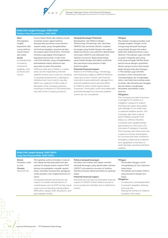 Menjaga Lingkungan Lestari untuk Generasi MendatangMaintaining a Sustainable Environment for Future Generations146 Laporan Keberlanjutan %u2022 PT Pertamina Hulu EnergiRisiko Fisik Jangka Menengah: 2026-2030Medium-Term Physical Risks: 2026-2030AkutPeningkatan tingkat keparahan dari cuaca ekstrim, seperti banjir dan badaiAcuteIncreased level of severity of extreme weather, such as floods and stormsSumur lepas Pantai dan ladang minyak di daerah pesisir dapat terkena dampak dari peristiwa cuaca ekstrim seperti badai, yang mengakibatkan terhentinya kegiatan operasional atau kerusakan pada infrastruktur. Peristiwa tersebut juga dapat memengaruhi kapasitas pemenuhan crude oil ke mitra Perusahaan, yang mengakibatkan keterbatasan dalam distribusi dan penjualan produk Perusahaan.Offshore wells and oil fields in coastal areas can be impacted by extreme weather events such as storms, resulting in operational downtime or damage to infrastructure. Such events may also affect our capacity to fulfil crude oil demands of the Company partners, resulting in limitations in the distribution and sale of the Company products.Dampak Keuangan Potensial:Berdasarkan nilai Platform Badan Meteorologi, Klimatologi, dan Geofisika (BMKG) dan peristiwa siklonik, implikasi keuangan yang terkait dengan kerusakan akibat peristiwa cuaca ekstrem diperkirakan mencapai USD274 juta (dampak total sebelum asuransi). Biaya pihak ketiga yang terkait dengan kerusakan potensial dari peristiwa cuaca ekstrem tidak diperhitungkan.Potential Financial Impact:Based on the Meteorology, Climatology and Geophysics Agency (BMKG) Platform value and cyclonic events, the financial implications associated with damage from extreme weather events are estimated at USD274 million (total impact before insurance). Third-party costs associated with potential damage from extreme weather events are not considered.Mitigasi:Perusahaan mengasuransikan aset sebagai langkah mitigasi untuk mengurangi dampak keuangan yang terkait dengan kerusakan pada aset akibat peristiwa cuaca ekstrem. Perusahaan juga memiliki program integritas aset yang kuat yang menjaga fasilitas lepas pantai sesuai dengan spesifikasi desain yang mumpuni jika terjadi badai dengan kekuatan kategori 5. Perusahaan juga memiliki protokol untuk memantau dan mempersiapkan diri menghadapi siklon, dan telah berinvestasi pada prosedur dan kemampuan tanggap darurat dalam menghadapi kerusakan aset akibat cuaca ekstrem.Mitigation:The Company provides insurance coverage for its assets as a mitigation measure to reduce the financial impact associated with damage to our assets due to extreme weather events. The Company also have a robust asset integrity program that keeps our offshore facilities compliant with capable design specifications in the event of a hurricane of category 5 severity. The Company also have protocols in place to monitor and prepare for cyclones and have invested in emergency response procedures and capabilities in the face of asset damage caused by extreme weather.Risiko Fisik Jangka Panjang: 2030-2050+Long-Term Physical Risks: 2030-2050+KronisKenaikan muka air lautChronicSea level risePeningkatan potensi kenaikan muka air laut dapat berdampak pada aset dan operasi di wilayah pesisir seperti PHM karena menyebabkan masalah seperti banjir, kesulitan transportasi, gangguan rantai pasokan, dan tingkat keasinan air tanah.Increased potential sea level rise can impact our assets and operations in coastal areas such as PHM as they cause issues such as flooding, transportation difficulties, supply chain disruptions, and groundwater acidity.Potensi dampak keuangan:Kenaikan permukaan laut dapat memiliki dampak keuangan yang diperkirakan sebesar USD571 juta sebelum asuransi di fasilitas fasilitas produksi akibat peristiwa air pasang/badai.Potential financial impact:Sea level rise can have an estimated financial impact of USD571 million before insurance at our production facilities due to tidal/storm events.Mitigasi:- Pembuatan tanggul untuk menghadang air laut masuk ke lokasi kerja.- Menaikkan permukaan stationyang berada di tengah laut lepas.Mitigation:- Construction of embankments to prevent seawater entering the work site- Raising the surface of stations located in the ocean.89 10 11
