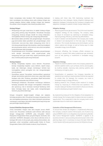 PT Pertamina Hulu Energi %u2022 Sustainability Report 147Dalam menghadapi risiko tersebut, PHE Subholding Upstream telah menetapkan dua strategi utama yaitu strategi mitigasi dan strategi adaptasi. Berikut adalah strategi mitigasi dan adaptasi Perusahaan untuk mengatasi risiko terkait perubahan iklim:Strategi Mitigasi%u2022 Mengurangi emisi gas rumah kaca: Ini adalah strategi mitigasi yang paling penting bagi Perusahaan. Perusahaan berupaya mengurangi emisinya dengan beralih ke energi terbarukan, meningkatkan efisiensi energi, dan mengurangi deforestasi.%u2022 Berinvestasi dalam penelitian dan pengembangan: Perusahaan juga berinvestasi dalam penelitian dan pengembangan untuk menemukan cara-cara baru dalam mengurangi emisi. Hal ini mencakup pengembangan teknologi baru, seperti penangkapan dan penyimpanan karbon, serta mencari cara untuk menjadikan energi terbarukan lebih terjangkau.%u2022 Penyeimbangan emisi: Perusahaan melakukan penyeimbangan emisi dengan berinvestasi pada proyek-proyek yang mengurangi emisi gas rumah kaca, seperti penanaman pohon atau investasi pada proyek energi terbarukan.Strategi Adaptasi%u2022 Bersiap menghadapi kejadian cuaca ekstrem: Perusahaan bersiap menghadapi kejadian cuaca ekstrem, seperti banjir, badai, dan kekeringan, dengan membangun tembok laut, meningkatkan sistem peringatan dini, dan mengembangkan rencana darurat.%u2022 Diversifikasi operasi: Perusahaan mendiversifikasi operasinya dengan berinvestasi pada bisnis-bisnis baru yang tidak terlalu terpapar risiko iklim. Misalnya, perusahaan dapat berinvestasi pada energi terbarukan atau efisiensi energi.%u2022 Membangun ketahanan: Perusahaan membangun ketahanan terhadap perubahan iklim dengan meningkatkan infrastruktur dan operasinya. Hal ini termasuk membuat fasilitasnya lebih tahan terhadap banjir dan badai, serta mengembangkan tanaman yang tahan kekeringan.Dengan mengambil langkah-langkah mitigasi dan adaptasi terhadap perubahan iklim, Perusahaan berupaya mengurangi risiko dan meningkatkan peluangnya. Hal ini akan membantu perusahaan membangun masa depan yang lebih berkelanjutan bagi dirinya dan para pemangku kepentingannya.Evaluasi Efektifitas Manajemen RisikoUntuk memastikan mitigasi risiko ilkim berjalan secara efektif, secara rutin, Perusahaan melakukan audit internal, salah satunya dengan menggunakan SUPREME yang merupakan Sistem Manajemen Pengendalian Risiko yang terintegrasi, terstruktur dan sistematis. SUPREME diterapkan untuk seluruh aktivitas bisnis di berbagai WK serta di site proyek yang sedang direncanakan; dan diperlukan untuk memastikan praktik-praktik Sistem & Proses Pengendalian Risiko HSSE terbaik di seluruh Grup Pertamina.In dealing with these risks, PHE Subholding Upstream has established two main strategies, namely mitigation strategies and adaptation strategies. Following are the Company's mitigation and adaptation strategies to address climate change-related risks:Mitigation Strategy%u2022 Reducing greenhouse gas emissions: This is the most important mitigation strategy for the Company. The company seeks to reduce its emissions by switching to renewable energy, improving energy efficiency, and reducing deforestation.%u2022 Invest in research and development: the Company also invests in research and development to find new ways of reducing emissions. This includes developing new technologies, such as carbon capture and storage, as well as finding ways to make renewable energy more affordable.%u2022 Emissions offsetting: the Company offsets emissions by investing in projects that reduce greenhouse gas emissions, such as tree planting or investments in renewable energy projects.Adaptation Strategy%u2022 Prepare for extreme weather events: the Company prepares for extreme weather events, such as floods, storms, and droughts, by building seawalls, improving early warning systems, and developing contingency plans.%u2022 Diversification of operations: the Company diversifies its operations by investing in new businesses that are less exposed to climate risks. For example, the company can invest in renewable energy or energy efficiency.%u2022 Building resilience: the Company builds resilience to climate change by improving its infrastructure and operations. This includes making its facilities more resilient to floods and storms, as well as developing drought-tolerant crops.By implementing measures for the mitigation of and adaptation to climate change, the Company seeks to reduce risks and increase its opportunities. This is expected to help the company build a more sustainable future for itself and its stakeholders.Evaluation of Risk Management EffectivenessTo ensure that climate risk mitigation is implemented effectively, the Company conducts routine internal audits, one of which is by using SUPREME which is an integrated, structured and systematic Risk Control Management System. SUPREME is applied to all business activities in various working area and at project sites in the planning stage; and it is necessary to ensure the best HSSE Risk Control System & Process practices across the Pertamina Group.