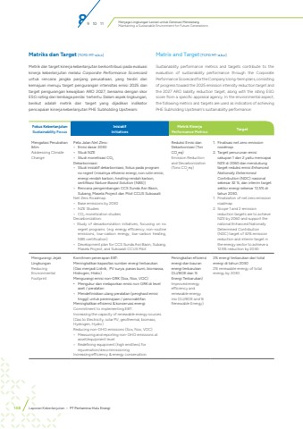 Menjaga Lingkungan Lestari untuk Generasi MendatangMaintaining a Sustainable Environment for Future Generations148 Laporan Keberlanjutan %u2022 PT Pertamina Hulu EnergiMatriks dan Target [TCFD MT-a,b,c]Metrik dan target kinerja keberlanjutan berkontribusi pada evaluasi kinerja keberlanjutan melalui Corporate Performance Scorecarduntuk rencana jangka panjang perusahaan, yang terdiri dari kemajuan menuju target pengurangan intensitas emisi 2025 dan target pengurangan kewajiban ARO 2027, bersama dengan skor ESG rating dari lembaga penilai tertentu. Dalam aspek lingkungan, berikut adalah metrik dan target yang dijadikan indikator pencapaian kinerja keberlanjutan PHE Subholding Upstream:Matrix and Target [TCFD MT-a,b,c]Sustainability performance metrics and targets contribute to the evaluation of sustainability performance through the Corporate Performance Scorecard for the Company's long-term plans, consisting of progress toward the 2025 emission intensity reduction target and the 2027 ARO liability reduction target, along with the rating ESG score from a specific appraisal agency. In the environmental aspect, the following metrics and targets are used as indicators of achieving PHE Subholding Upstream's sustainability performance:Fokus KeberlanjutanSustainability FocusInisiatifInitiativesMetrik KinerjaPerformance Metrics TargetMengatasi Perubahan Iklim Addressing Climate ChangePeta Jalan Net Zero:%u2022 Emisi dasar 2030%u2022 Studi NZE%u2022 Studi monetisasi CO2Dekarbonisasi:%u2022 Studi inisiatif dekarbonisasi, fokus pada program no regret (misalnya efisiensi energi, non rutin emisi, energi rendah karbon, heating rendah karbon, sertifikasi Nature Based Solution (NBS))%u2022 Rencana pengembangan CCS Sunda Asri Basin, Subang, Masela Project dan Pilot CCUS SukowatiNet Zero Roadmap:%u2022 Base emissions by 2030%u2022 NZE Studies%u2022 CO2 monetization studiesDecarbonization:%u2022 Study of decarbonization initiatives, focusing on no regret programs (e.g. energy efficiency, non-routine emissions, low-carbon energy, low-carbon heating, NBS certification)%u2022 Development plan for CCS Sunda Asri Basin, Subang, Masela Project, and Sukowati CCUS PilotReduksi Emisi dan Dekarbonisasi (Ton CO2eq)Emission Reduction and Decarbonization (Tons CO2eq)1. Finalisasi net zero emission roadmap.2. Target penurunan emisi cakupan 1 dan 2 yaitu mencapai NZE di 2060 dan mendukung target reduksi emisi Enhanced Nationally Determined Contribution (NDC) nasional sebesar 32 %, dan interim target sektor energi sebesar 12,5% di tahun 2030.1. Finalization of net zero emission roadmap.2. Scope 1 and 2 emission reduction targets are to achieve NZE by 2060 and support the national Enhanced Nationally Determined Contribution (NDC) target of 32% emission reduction and interim target in the energy sector to achieve a 12.5% reduction by 2030. Mengurangi Jejak Lingkungan Reducing Environmental FootprintKomitmen penerapan EBT:Meningkatkan kapasitas sumber energi terbarukan (Gas menjadi Listrik, PV surya, panas bumi, biomassa, Hidrogen, Hidro)Mengurangi emisi non-GRK (Sox, Nox, VOC)%u2022 Mengukur dan melaporkan emisi non GRK di level aset / peralatan%u2022 Mendefinisikan ulang peralatan (penghasil emisi tinggi) untuk peremajaan / penonaktifanMeningkatkan efisiensi & konservasi energiCommitment to implementing EBT:Increasing the capacity of renewable energy sources (Gas to Electricity, solar PV, geothermal, biomass, Hydrogen, Hydro)Reducing non-GHG emissions (Sox, Nox, VOC)%u2022 Measuring and reporting non-GHG emissions at asset/equipment level%u2022 Redefining equipment (high emitters) for rejuvenation/decommissioningIncreasing efficiency & energy conservationPeningkatan efisiensi energi dan bauran energi terbarukan (GJ/BOE dan % Energi Terbarukan)Improved energy efficiency and renewable energy mix (GJ/BOE and % Renewable Energy)2% energi terbarukan dari total energi di tahun 20302% renewable energy of total energy by 203089 10 11