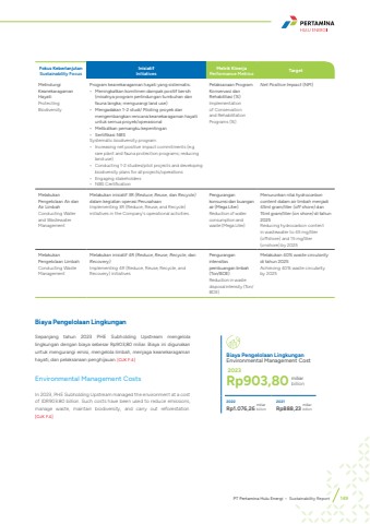 PT Pertamina Hulu Energi %u2022 Sustainability Report 149Fokus KeberlanjutanSustainability FocusInisiatifInitiativesMetrik KinerjaPerformance Metrics TargetMelindungi Keanekaragaman Hayati Protecting BiodiversityProgram keanekaragaman hayati yang sistematis:%u2022 Meningkatkan komitmen dampak positif bersih (misalnya program perlindungan tumbuhan dan fauna langka; mengurangi land use)%u2022 Mengadakan 1-2 studi/ Piloting proyek dan mengembangkan rencana keanekaragaman hayati untuk semua proyek/operasional %u2022 Melibatkan pemangku kepentingan%u2022 Sertifikasi NBSSystematic biodiversity program:%u2022 Increasing net positive impact commitments (e.g. rare plant and fauna protection programs; reducing land use)%u2022 Conducting 1-2 studies/pilot projects and developing biodiversity plans for all projects/operations%u2022 Engaging stakeholders%u2022 NBS CertificationPelaksanaan Program Konservasi dan Rehabilitasi (%)Implementation of Conservation and Rehabilitation Programs (%) Net Positive Impact (NPI)Melakukan Pengelolaan Air dan Air Limbah Conducting Water and Wastewater ManagementMelakukan inisiatif 3R (Reduce, Reuse, dan Recycle) dalam kegiatan operasi PerusahaanImplementing 3R (Reduce, Reuse, and Recycle) initiatives in the Company's operational activities.Pengurangan konsumsi dan buangan air (Mega Liter)Reduction of water consumption and waste (Mega Liter)Menurunkan nilai hydrocarbon content dalam air limbah menjadi 45ml gram/liter (off shore) dan 15ml gram/liter (on shore) di tahun 2025Reducing hydrocarbon content in wastewater to 45 mg/liter (offshore) and 15 mg/liter (onshore) by 2025Melakukan Pengelolaan Limbah Conducting Waste ManagementMelakukan inisiatif 4R (Reduce, Reuse, Recycle, danRecovery)Implementing 4R (Reduce, Reuse, Recycle, and Recovery) initiativesPengurangan intensitas pembuangan limbah (Ton/BOE)Reduction in waste disposal intensity (Ton/BOE)Melakukan 40% waste circularity di tahun 2025Achieving 40% waste circularity by 2025Biaya Pengelolaan LingkunganSepanjang tahun 2023 PHE Subholding Upstream mengelola lingkungan dengan biaya sebesar Rp903,80 miliar. Biaya ini digunakan untuk mengurangi emisi, mengelola limbah, menjaga keanekaragaman hayati, dan pelaksanaan penghijauan. [OJK F.4]Environmental Management Costs In 2023, PHE Subholding Upstream managed the environment at a cost of IDR903.80 billion. Such costs have been used to reduce emissions, manage waste, maintain biodiversity, and carry out reforestation. [OJK F.4]Biaya Pengelolaan LingkunganEnvironmental Management Cost 2023Rp903,80 miliarbillion2022Rp1.076,26 miliarbillion2021Rp888,23 miliarbillion