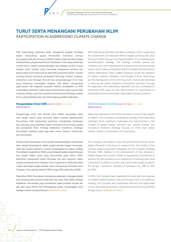 Menjaga Lingkungan Lestari untuk Generasi MendatangMaintaining a Sustainable Environment for Future Generations150 Laporan Keberlanjutan %u2022 PT Pertamina Hulu EnergiPHE Subholding Upstream telah mengambil langkah strategis dalam mendukung upaya Pemerintah Indonesia menuju pencapaian Net Zero Emission (NZE) melalui implementasi strategi dekarbonisasi yang komprehensif. Strategi ini mencakup beberapa inisiatif kunci, seperti pengembangan gas sebagai sumber energi dengan emisi rendah, yang menandai pergeseran penting dari bahan bakar fosil tradisional ke alternatif yang lebih bersih. Inisiatif penting lainnya termasuk penerapan teknologi Carbon Capture, Utilization, and Storage (CCUS) dan pengembangan CCS Hub, yang keduanya merupakan langkah vital dalam mengurangi jejak karbon dari kegiatan produksi. Melalui pendekatan ini, PHE Subholding Upstream tidak hanya berkontribusi pada tujuan NZE Indonesia tetapi juga menunjukkan komitmennya terhadap praktik bisnis yang berkelanjutan dan bertanggung jawab lingkungan.Pengendalian Emisi GRK [OJK F.11, F.12][GRI 3-3, 305][IPIECA CCE-4]Pengurangan emisi Gas Rumah Kaca (GRK) merupakan salah satu target utama yang tertuang dalam strategi keberlanjutan Perusahaan. PHE Subholding Upstream menghadapi tantangan dan peluang yang signifikan dalam konteks transisi energi global dan perubahan iklim. Strategi ketahanan (resilience strategy) Perusahaan berfokus pada tiga pilar utama: Karbon, Konservasi, dan Komunitas. Analisis risiko Perusahaan menunjukkan bahwa kebijakan pemerintah akan sangat berpengaruh dalam jangka pendek hingga menengah. Hasil dari analisis skenario ini telah diintegrasikan ke dalam strategi Perusahaan hingga tahun 2060, yang mengarah pada pengembangan dua target terkait emisi yang diumumkan pada tahun 2022, komitmen aspirasional untuk mencapai net zero emission dalam operasi, termasuk emisi Cakupan 1 dan 2, pada tahun 2060 atau lebih cepat, dan target jangka pendek untuk mengurangi intensitas emisi Cakupan 1 dari operasi sebesar 29% hingga 32% pada tahun 2030.Pada tahun 2023, Perusahaan memperluas pekerjaan ini dengan analisis baru tentang risiko transisi terkait iklim dan risiko fisik. Dalam strategi ketahanan, Perusahaan juga menekankan pada produksi minyak dan gas alam yang efisien dan bertanggung jawab, menganggap emisi sebagai sumber energi potensial. [SASB EM-EP-110a.3]PHE Subholding Upstream has taken a strategic step in supporting the Government of Indonesia's efforts toward achieving Net Zero Emissions (NZE) through the implementation of a comprehensive decarbonization strategy. The strategy includes several key initiatives, such as the development of gas as a low-emission energy source, which marks an important shift from traditional fossil fuels to cleaner alternatives. Other notable initiatives include the adoption of Carbon Capture, Utilization, and Storage (CCUS) technology and the development of the CCS Hub, both of which are vital steps in reducing the carbon footprint of production activities. Through this approach, PHE Subholding Upstream not only contributes to Indonesia's NZE goals but also demonstrates its commitment to sustainable and environmentally responsible business practices.GHG Emission Control [OJK F.11, F.12][GRI 3-3, 305][IPIECA CCE-4]Reducing Greenhouse Gas (GHG) emissions is one of main targets as stated in the Company's sustainability strategy. PHE Subholding Upstream faces significant challenges and opportunities in the context of global energy transition and climate change. The Company's resilience strategy focuses on three main pillars, namely: Carbon, Conservation, and Community. The Company risk analysis shows that government policies will be highly influential in the short to medium term. The results of this scenario analysis have been integrated into the Company strategy through 2060, leading to the development of two emissionsrelated targets announced in 2022, an aspirational commitment to achieve net zero emissions in our operations, including Scope 1 and 2 emissions, by 2060 or sooner, and a short-term target to reduce the Scope 1 emissions intensity of operations by 29% to 32% by 2030. In 2023, the Company have expanded this work with new analyses of climate-related transition risks and physical risks. In its resilience strategy, the Company also emphasizes efficient and responsible oil and natural gas production, considering emissions as a potential energy source. [SASB EM-EP-110a.3]TURUT SERTA MENANGANI PERUBAHAN IKLIMPARTICIPATION IN ADDRESSING CLIMATE CHANGE89 10 11