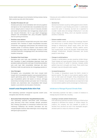 PT Pertamina Hulu Energi %u2022 Sustainability Report 151Berikut adalah beberapa rincian tambahan tentang masing-masing faktor pendorong risiko iklim fisik tersebut:%u2022 Kenaikan Permukaan Air LautKenaikan permukaan air laut disebabkan oleh mencairnya gletser dan lapisan es. Hal ini diperkirakan akan menyebabkan banjir dan erosi di wilayah pesisir di seluruh dunia. Di Indonesia, kenaikan permukaan laut diperkirakan akan menggenangi wilayah pesisir dan merusak infrastruktur. Hal ini juga dapat mengganggu pelayaran dan penangkapan ikan, yang merupakan kegiatan ekonomi penting di Indonesia.%u2022 Peristiwa cuaca ekstremPeristiwa cuaca ekstrem menjadi lebih sering dan intens akibat perubahan iklim. Peristiwa ini dapat menyebabkan kerusakan infrastruktur, mengganggu rantai pasokan, dan membuat orang terpaksa pindah. Di Indonesia, kejadian cuaca ekstrem telah menyebabkan banjir, badai, dan kekeringan. Peristiwa ini telah merusak infrastruktur, mengganggu bisnis, dan membuat orang terpaksa mengungsi.%u2022 Perubahan Pola Curah HujanPerubahan pola curah hujan juga disebabkan oleh perubahan iklim. Perubahan ini dapat menyebabkan kekeringan, banjir, dan perubahan waktu serta jumlah curah hujan. Di Indonesia, perubahan pola curah hujan telah menyebabkan kekeringan dan banjir. Peristiwa ini telah merusak tanaman dan mengganggu pasokan air.%u2022 Suhu MeningkatPeningkatan suhu menyebabkan iklim bumi menjadi lebih hangat. Hal ini menyebabkan kejadian cuaca yang lebih ekstrem, seperti gelombang panas dan kekeringan. Peningkatan suhu juga menyebabkan gletser dan lapisan es mencair, sehingga berkontribusi terhadap kenaikan permukaan laut. Di Indonesia, kenaikan suhu diperkirakan akan menyebabkan lebih banyak kejadian cuaca ekstrem dan kerusakan infrastruktur.Inisiatif untuk Mengelola Risiko Iklim FisikPHE Subholding Upstream mengambil sejumlah inisiatif untuk mengelola risiko fisik iklim, termasuk:%u2022 Berinvestasi Pada Infrastruktur Yang Berketahanan IklimPHE Subholding Upstream berinvestasi pada infrastruktur yang dirancang untuk tahan terhadap dampak perubahan iklim. Misalnya, perusahaan ini membangun tembok laut untuk melindungi fasilitasnya dari kenaikan permukaan laut dan mengembangkan tanaman tahan kekeringan untuk mengurangi ketergantungannya pada air.Following are some additional details about each of these physical climate risk drivers:%u2022 Sea level riseSea level rise has been caused by melting glaciers and ice sheets. This is expected to cause flooding and erosion in coastal areas around the world. In Indonesia, sea level rise is expected to inundate coastal areas and damage infrastructure. It can also disrupt shipping and fishing, which are important economic activities in Indonesia.%u2022 Extreme weather eventsExtreme weather events are becoming increasingly frequent and intense due to climate change. These events can cause damage to infrastructure, disrupt supply chains, and force people to relocate. In Indonesia, extreme weather events have caused floods, storms, and droughts. These events have damaged infrastructure, disrupted businesses, and forced people to seek refuge.%u2022 Changes in rainfall patternsChanges in rainfall patterns are also caused by climate change. These changes can cause droughts, floods, and changes in the timing and amount of rainfall. In Indonesia, changing rainfall patterns have led to droughts and floods. These events have damaged crops and disrupted water supplies.%u2022 Increased temperatureThe increase in temperature causes the Earth's climate to become warmer. This leads to more extreme weather events, such as heat waves and droughts. Rising temperatures also cause glaciers and ice sheets to melt, thus contributing to sea level rise. In Indonesia, rising temperatures are expected to lead to more extreme weather events and damage to infrastructure.Initiatives to Manage Physical Climate RisksPHE Subholding Upstream has taken a number of initiatives to manage physical climate risks, including:%u2022 Investing in climate-resilient infrastructurePHE Subholding Upstream has been investing in infrastructure designed to withstand the impacts of climate change. For instance, the company has built seawalls to protect its facilities from sea-level rise and it has developed droughtresistant plants to reduce its reliance on water.