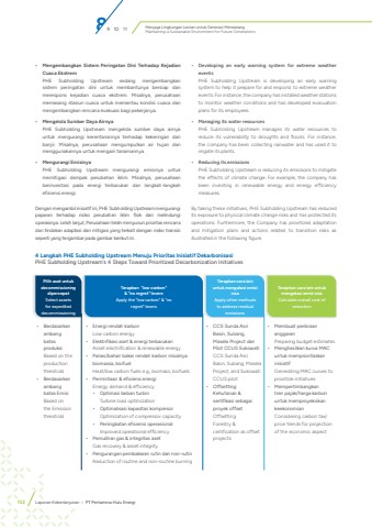 Menjaga Lingkungan Lestari untuk Generasi MendatangMaintaining a Sustainable Environment for Future Generations152 Laporan Keberlanjutan %u2022 PT Pertamina Hulu Energi%u2022 Mengembangkan Sistem Peringatan Dini Terhadap Kejadian Cuaca EkstremPHE Subholding Upstream sedang mengembangkan sistem peringatan dini untuk membantunya bersiap dan merespons kejadian cuaca ekstrem. Misalnya, perusahaan memasang stasiun cuaca untuk memantau kondisi cuaca dan mengembangkan rencana evakuasi bagi pekerjanya.%u2022 Mengelola Sumber Daya AirnyaPHE Subholding Upstream mengelola sumber daya airnya untuk mengurangi kerentanannya terhadap kekeringan dan banjir. Misalnya, perusahaan mengumpulkan air hujan dan menggunakannya untuk mengairi tanamannya.%u2022 Mengurangi EmisinyaPHE Subholding Upstream mengurangi emisinya untuk memitigasi dampak perubahan iklim. Misalnya, perusahaan berinvestasi pada energi terbarukan dan langkah-langkah efisiensi energi.Dengan mengambil inisiatif ini, PHE Subholding Upstream mengurangi paparan terhadap risiko perubahan iklim fisik dan melindungi operasinya. Lebih lanjut, Perusahaan telah menyusun prioritas rencana dan tindakan adaptasi dan mitigasi yang terkait dengan risiko transisi seperti yang tergambar pada gambar berikut ini.%u2022 Developing an early warning system for extreme weather eventsPHE Subholding Upstream is developing an early warning system to help it prepare for and respond to extreme weather events. For instance, the company has installed weather stations to monitor weather conditions and has developed evacuation plans for its employees.%u2022 Managing its water resourcesPHE Subholding Upstream manages its water resources to reduce its vulnerability to droughts and floods. For instance, the company has been collecting rainwater and has used it to irrigate its plants.%u2022 Reducing its emissionsPHE Subholding Upstream is reducing its emissions to mitigate the effects of climate change. For example, the company has been investing in renewable energy and energy efficiency measures.By taking these initiatives, PHE Subholding Upstream has reduced its exposure to physical climate change risks and has protected its operations. Furthermore, the Company has prioritized adaptation and mitigation plans and actions related to transition risks as illustrated in the following figure.4 Langkah PHE Subholding Upstream Menuju Prioritas Inisiatif DekarbonisasiPHE Subholding Upstream's 4 Steps Toward Prioritized Decarbonization Initiatives%u2022 Berdasarkan ambang batas produksiBased on the production threshold%u2022 Berdasarkan ambang batas EmisiBased on the Emission threshold%u2022 Energi rendah karbonLow carbon energy%u2022 Elektrifikasi aset & energi terbarukanAsset electrification & renewable energy%u2022 Panas/bahan bakar rendah karbon misalnya biomassa, biofuelHeat/low carbon fuels e.g., biomass, biofuels%u2022 Permintaan & efisiensi energiEnergy demand & efficiency%u2022 Optimasi beban turbinTurbine load optimization%u2022 Optimalisasi kapasitas kompresorOptimization of compressor capacity%u2022 Peningkatan efisiensi operasionalImproved operational efficiency%u2022 Pemulihan gas & integritas aset Gas recovery & asset integrity%u2022 Pengurangan pembakaran rutin dan non-rutinReduction of routine and non-routine burning%u2022 CCS Sunda Asri Basin, Subang, Masela Project dan Pilot CCUS SukowatiCCS Sunda Asri Basin, Subang, Masela Project, and Sukowati CCUS pilot%u2022 OffsettingKehutanan & sertifikasi sebagai proyek offsetOffsettingForestry & certification as offset projects%u2022 Membuat perkiraan anggaranPreparing budget estimates%u2022 Menghasilkan kurva MAC untuk memprioritaskan inisiatifGenerating MAC curves to prioritize initiatives%u2022 Mempertimbangkan tren pajak/harga karbon untuk memproyeksikan keekonomianConsidering carbon tax/price trends for projection of the economic aspectPilih aset untuk decommissioningdipercepatSelect assets for expedited decommissioningTerapkan \& \Apply the \regret\Terapkan cara lain untuk mengatasi emisi sisaCalculate overall cost of reductionTerapkan cara lain untuk mengatasi emisi sisaApply other methods to address residual emissions89 10 11