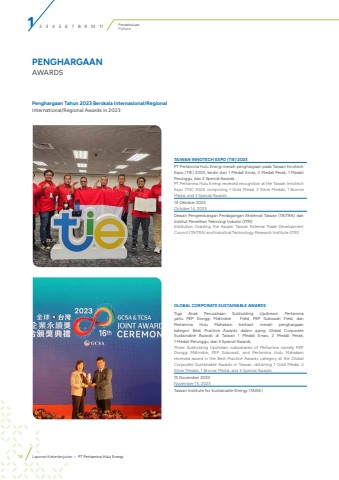 PENGHARGAANAWARDSTAIWAN INNOTECH EXPO (TIE) 2023PT Pertamina Hulu Energi meraih penghargaan pada Taiwan Innotech Expo (TIE) 2023, terdiri dari 1 Medali Emas, 2 Medali Perak, 1 Medali Perunggu, dan 3 Special Awards.PT Pertamina Hulu Energi received recognition at the Taiwan Innotech Expo (TIE) 2023, comprising 1 Gold Medal, 2 Silver Medals, 1 Bronze Medal, and 3 Special Awards.14 Oktober 2023October 14, 2023Dewan Pengembangan Perdagangan Eksternal Taiwan (TAITRA) dan Institut Penelitian Teknologi Industri (ITRI)Institution Granting the Award: Taiwan External Trade Development Council (TAITRA) and Industrial Technology Research Institute (ITRI) GLOBAL CORPORATE SUSTAINABLE AWARDSTiga Anak Perusahaan Subholding Upstream Pertamina yaitu PEP Donggi Matindok Field, PEP Sukowati Field, dan Pertamina Hulu Mahakam berhasil meraih penghargaan kategori Best Practice Awards dalam ajang Global Corporate Sustainable Awards di Taiwan 1 Medali Emas, 2 Medali Perak, 1 Medali Perunggu, dan 3 Special Awards.Three Subholding Upstream subsidiaries of Pertamina namely PEP Donggi Matindok, PEP Sukowati, and Pertamina Hulu Mahakam received award in the Best Practice Awards category at the Global Corporate Sustainable Awards in Taiwan, obtaining 1 Gold Medal, 2 Silver Medals, 1 Bronze Medal, and 3 Special Awards.15 November 2023November 15, 2023Taiwan Institute for Sustainable Energy (TAISE)Penghargaan Tahun 2023 Berskala Internasional/RegionalInternational/Regional Awards in 20231 2 3 4 5 6 7 8 9 10 11 PendahuluanPreface14 Laporan Keberlanjutan %u2022 PT Pertamina Hulu Energi