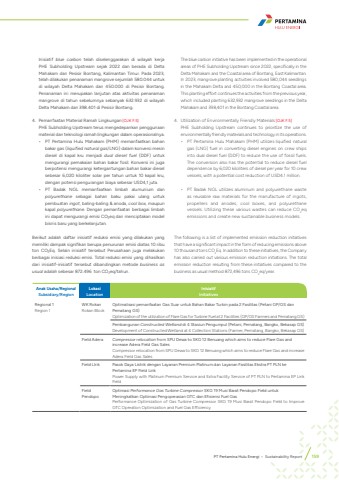 PT Pertamina Hulu Energi %u2022 Sustainability Report 159Inisiatif blue carbon telah diselenggarakan di wilayah kerja PHE Subholding Upstream sejak 2022 dan berada di Delta Mahakam dan Pesisir Bontang, Kalimantan Timur. Pada 2023, telah dilakukan penanaman mangrove sejumlah 580.044 untuk di wilayah Delta Mahakam dan 450.000 di Pesisir Bontang. Penanaman ini merupakan lanjutan atas aktivitas penanaman mangrove di tahun sebelumnya sebanyak 632.932 di wilayah Delta Mahakam dan 398.401 di Pesisir Bontang.4. Pemanfaatan Material Ramah Lingkungan [OJK F.5]PHE Subholding Upstream terus mengedepankan penggunaan material dan teknologi ramah lingkungan dalam operasionalnya. %u2022 PT Pertamina Hulu Mahakam (PHM) memanfaatkan bahan bakar gas (liquified natural gas/LNG) dalam konversi mesin diesel di kapal kru menjadi dual diesel fuel (DDF) untuk mengurangi pemakaian bahan bakar fosil. Konversi ini juga berpotensi mengurangi ketergantungan bahan bakar diesel sebesar 6,020 kiloliter solar per tahun untuk 10 kapal kru, dengan potensi pengurangan biaya sebesar USD4,1 juta. %u2022 PT Badak NGL memanfaatkan limbah alumunium dan polyurethane sebagai bahan baku pakai ulang untuk pembuatan ingot, baling-baling & anoda, cool box, maupun kapal polyurethane. Dengan pemanfaatan berbagai limbah ini dapat mengurangi emisi CO%u2082eq dan menciptakan model bisnis baru yang berkelanjutan. Berikut adalah daftar inisiatif reduksi emisi yang dilakukan yang memiliki dampak signifikan berupa penurunan emisi diatas 10 ribu ton CO%u2082Eq. Selain inisiatif tersebut Perusahaan juga melakukan berbagai inisiasi reduksi emisi. Total reduksi emisi yang dihasilkan dari inisiatif-inisiatif tersebut dibandingkan metode business as usual adalah sebesar 872.496 ton CO%u2082eq/tahun.The blue carbon initiative has been implemented in the operational areas of PHE Subholding Upstream since 2022, specifically in the Delta Mahakam and the Coastal area of Bontang, East Kalimantan. In 2023, mangrove planting activities involved 580,044 seedlings in the Mahakam Delta and 450,000 in the Bontang Coastal area. This planting effort continues the activities from the previous year, which included planting 632,932 mangrove seedlings in the Delta Mahakam and 398,401 in the Bontang Coastal area.4. Utilization of Environmentally Friendly Materials [OJK F.5]PHE Subholding Upstream continues to prioritize the use of environmentally friendly materials and technology in its operations. %u2022 PT Pertamina Hulu Mahakam (PHM) utilizes liquified natural gas (LNG) fuel in converting diesel engines on crew ships into dual diesel fuel (DDF) to reduce the use of fossil fuels. The conversion also has the potential to reduce diesel fuel dependence by 6,020 kiloliters of diesel per year for 10 crew vessels, with a potential cost reduction of USD4.1 million. %u2022 PT Badak NGL utilizes aluminum and polyurethane waste as reusable raw materials for the manufacture of ingots, propellers and anodes, cool boxes, and polyurethane vessels. Utilizing these various wastes can reduce CO2eq emissions and create new sustainable business models. The following is a list of implemented emission reduction initiatives that have a significant impact in the form of reducing emissions above 10 thousand tons CO2Eq. In addition to these initiatives, the Company has also carried out various emission reduction initiations. The total emission reduction resulting from these initiatives compared to the business as usual method 872,496 tons CO2eq/year.Anak Usaha/RegionalSubsidiary/RegionLokasi LocationInisiatif InitiativesRegional 1Region 1WK RokanRokan BlockOptimalisasi pemanfaatan Gas Suar untuk Bahan Bakar Turbin pada 2 Fasilitas (Petani GP/GS dan Pematang GS)Optimization of the utilization of Flare Gas for Turbine Fuel at 2 Facilities (GP/GS Farmers and Pematang GS)Pembangunan Constructed Wetland di 4 Stasiun Pengumpul (Petani, Pematang, Bangko, Bekasap GS)Development of Constructed Wetland at 4 Collection Stations (Farmer, Pematang, Bangko, Bekasap GS)Field Adera Compressor relocation from SPU Dewa to SKG 12 Benuang which aims to reduce Flare Gas and increase Adera Field Gas SalesCompressor relocation from SPU Dewa to SKG 12 Benuang which aims to reduce Flare Gas and increase Adera Field Gas SalesField LIrik Pasok Daya Listrik dengan Layanan Premium Platinum dan Layanan Fasilitas Ekstra PT PLN ke Pertamina EP Field LirikPower Supply with Platinum Premium Service and Extra Facility Service of PT PLN to Pertamina EP Lirik Field Field PendopoOptimasi Performance Gas Turbine Compressor SKG 19 Musi Barat Pendopo Field untuk Meningkatkan Optimasi Pengoperasian GTC dan Efisiensi Fuel GasPerformance Optimization of Gas Turbine Compressor SKG 19 Musi Barat Pendopo Field to Improve GTC Operation Optimization and Fuel Gas Efficiency