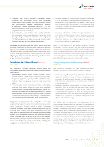 PT Pertamina Hulu Energi %u2022 Sustainability Report 1612. Melakukan studi tentang teknologi Penangkapan Karbon (Utilization) dan Penyimpanan (CCUS) untuk menangkap karbon dioksida yang dihasilkan dan menggunakannya kembali atau menyimpannya daripada melepaskannya langsung ke lingkungan. Dengan mengadopsi teknologi CCUS, PHE Subholding Upstream dapat mengurangi emisi gas rumah kaca yang dihasilkan dari operasionalnya.3. Mengembangkan solusi berbasis alam melalui rehabilitasi dan penghijauan untuk mengimbangi emisi yang sulit untuk dikurangi. Dengan melakukan rehabilitasi dan penghijauan, PHE Subholding Upstream dapat mengurangi dampak negatif terhadap lingkungan dan meningkatkan keberlanjutan.Berdasarkan evaluasi perusahaan atas inisiatif reduksi emisi yang diterapkan, selama tahun pelaporan PHE Subholding Upstream dapat mencapai bahkan melebihi target reduksi emisi berdasarkan KPI. PHE Subholding Upstream terus memantau pencapaian target tersebut. Jika target reduksi emisi tidak tercapai salah satu langkah mitigasi yang dilakukan oleh PHE Subholding Upstream adalah dengan pembelian kredit karbon.Pengelolaan dan Efisiensi Energi [OJK F.6, F.7][GRI 3-3, 302]PHE Subholding Upstream melakukan efisiensi energi dan meningkatkan bauran energi bersih dan terbarukan melalui beberapa inisiatif berikut:1. Meningkatkan efisiensi energi melalui optimasi operasi peralatan mekanik seperti pompa, kompresor, dan generator. Dengan mengoptimalkan operasi peralatan ini, PHE Subholding Upstream dapat mengurangi konsumsi energi yang tidak efisien.2. Mengembangkan sumber energi alternatif untuk pembangkitan panas dan listrik, seperti biofuel dan energi surya fotovoltaik. Perusahaan telah mengidentifikasi kapasitas surya sebesar 30,2 MWp yang diharapkan akan beroperasi pada tahun 2025. Dengan mengembangkan sumber energi alternatif ini, PHE Subholding Upstream dapat mengurangi ketergantungan pada bahan bakar fosil dan meningkatkan bauran energi bersih dan terbarukan.Penggunaan energi yang efisien dan peningkatan bauran energi yang ramah lingkungan merupakan inisiasi utama dalam pengelolaan energi Perusahaan. Konsumsi energi di dalam Perusahaan mencakup pemakaian energi yang berasal dari sumber energi tak terbarukan yang meliputi energi yang dibangkitkan sendiri dari bahan bakar dan uap, sumber energi terbarukan berupa pemakaian biodiesel untuk pembangkit, panel surya dan listrik yang dibeli dari sumber terbarukan, serta listrik yang dibeli dari PT PLN (Persero). Perusahaan belum menghitung konsumsi energi di luar Perusahaan, termasuk oleh kontraktor/vendor/pemasok. Berikut adalah jumlah penggunaan energi di dalam Perusahaan. [GRI 302-2]2. Conducting studies on Carbon Capture, Utilization, and Storage (CCUS) technology to capture carbon dioxide emissions and either reuse or store them rather than releasing them directly into the environment. By adopting CCUS technology, PHE Subholding Upstream can reduce greenhouse gas emissions generated from its operations.3. Developing nature-based solutions through rehabilitation and reforestation to offset emissions that are challenging to reduce. By engaging in rehabilitation and reforestation efforts, PHE Subholding Upstream can mitigate negative impacts on the environment and enhance sustainability.Based on our evaluation of the emission reduction initiatives implemented, During the reporting year, PHE Subholding Upstream was able to achieve, and even surpass, the emission reduction targets as per Key Performance Indicators (KPI). PHE Subholding Upstream continues to monitor the achievement of these targets. If the emission reduction target is not achieved, one of the mitigation measures taken by PHE Subholding Upstream is to purchase carbon credits.Energy Management and Efficiency [OJK F.6, F.7][GRI 3-3, 302]PHE Subholding Upstream has been implementing energy efficiency and improving mix through the following initiatives: 1. Improving energy efficiency through optimization of mechanical equipment operations such as pumps, compressors, and generators. By optimizing the operation of such equipment, PHE Subholding Upstream has been able to reduce inefficient energy consumption.2. Developing alternative energy sources for heat and electricity generation, such as biofuels and solar photovoltaic energy. The Company has identified 30.2 MWp of solar capacity that is expected to be operational by 2025. By developing these alternative energy sources, PHE Subholding Upstream has been able to reduce dependence on fossil fuels and improve the mix of clean and renewable energy. The efficient use of energy and the improvement of an environmentally friendly energy mix have been the main initiatives in the Company's energy management. Energy consumption in the Company includes the use of energy derived from non-renewable energy sources which include self-generated energy from fuel and steam, renewable energy sources in the form of the use of biodiesel for generation, solar panels and electricity purchased from renewable sources, and electricity purchased from PT PLN (Persero). The Company is yet to calculate energy consumption outside the Company, including by contractors/vendors/suppliers. The amount of energy usage in the Company is described below. [GRI 302-2]
