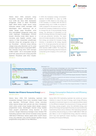 PT Pertamina Hulu Energi %u2022 Sustainability Report 163Selama tahun 2023, konsumsi energi Perusahaan mencapai 157.355.148,30 GJ, turun 6,19% dari tahun 2022. Berdasarkan penggunaan energi di dalam Perusahaan dapat dilihat bahwa tingkat bauran energi terbarukan sebesar 4,06%, meningkat 1,32% dibandingkan tahun sebelumnya. Hal ini sejalan dengan upaya Perusahaan untuk terus meningkatkan penggunaan energi yang ramah lingkungan. Pengungkapan informasi besaran intensitas energi dalam laporan ini mencakup pada kegiatan produksi migas. Laporan ini tidak menyertakan penghitungan intensitas energi dari penggunaan energi di luar Perusahaan. Intensitas energi dihitung sebagai energi yang dibutuhkan per GJ untuk produksi migas per barrel oil equivalent (BOE). Nilai Intensitas Energi tahun 2023 mencapai 0,4981 GJ/BOE. Hal ini menunjukkan dampak positif dari upaya penurunan energi yang telah dijalankan Perusahaan pada tahun berjalan. [GRI 302-3]In 2023, the Company's energy consumption reached 157,355,148.30 GJ, down by 6.19% compared to 2022. Based on the energy use in the Company, it is evident that the level of renewable energy mix is 4.06%, an increase of 1.32% compared to the previous year. This is in line with the Company's endeavours to continue to increase the use of environmentally friendly energy. The disclosure of information on the amount of energy intensity in this report includes oil and gas production activities. This report does not include calculations of energy intensity from energy use outside the Company. Energy intensity is calculated as the energy required per GJ for oil and gas production per barrel oil equivalent (BOE). The Energy Intensity Value in 2023 reached 0.4981 GJ/BOE. This shows the positive impact of the energy reduction measures conducted by the Company in the current year.[GRI 302-3]Persentase Energi TerbarukanPercentage of Renewable Energy 20234,0620222,7420212,15Reduksi dan Efisiensi Konsumsi Energi [OJK F.7][GRI 302-4, 302-5]Selama tahun 2023, PHE Subholding Upstream telah menjalankan berbagai inisiasi untuk mereduksi tingkat energi yang digunakan. Perhitungan efisiensi energi mencakup setiap regional dengan basis periode satu tahun, berdasarkan selisih antara jumlah energi terpakai aktual dengan program penghematan energi, dibandingkan estimasi energi terpakai tanpa program penghematan energi (business as usual scenario). Dengan dilakukannya berbagai inisiasi tersebut PHE Subholding Upstream telah berhasil mereduksi energi sejumlah 3.887.062,07 MWh/tahun. Berikut adalah daftar inisiatif reduksi energi yang dilakukan yang memiliki dampak signifikan berupa penghematan energi diatas 10 ribu MWh/tahun.Energy Consumption Reduction and Efficiency[OJK F.7][GRI 302-4, 302-5]During 2023, PHE Subholding Upstream has carried out various initiatives to reduce the level of energy used. Energy efficiency calculations include each region on a one-year period basis, based on the difference between the actual amount of energy used and the energy savings program, versus the estimated energy used without the energy saving program (business as usual scenario). By implementing these various initiatives, PHE Subholding Upstream successfully reduced energy by a total of 3,887,062.07 MWh per year. Below is a list of implemented energy reduction initiatives, which have had significant impact resulting in energy savings exceeding 10 thousand MWh/year.Hasil Pengukuran Intensitas EnergiEnergy Intensity Measurement Results[OJK F.6] [GRI 302-3] 2023*0,50 GJ/BOE20220,45 GJ/BOE2021** 0,29 GJ/BOEKeterangan/Notes:* Intensitas energi dihitung dengan membandingkan rasio antara total pemakaian energi dengan total produksi (gross up production) sejumlah 287.907 MBOE pada tahun 2023.* Intensitas energi dihitung tanpa memasukkan total energi dari PDSI, Elnusa dan Badak NGL karena angka produksinya tidak dikonversikan menjadi BOE. Apabila memperhitungkan energi dari PDSI, Elnusa dan Badak NGL, intensitas energi 2023 akan menjadi 0,6339 GJ/BOE.** Data tahun 2021 sudah mencakup Regional 1-5, Elnusa, dan WK Rokan (Agustus-Desember), PT Badak NGL (Oktober-Desember).* Energy intensity is calculated by comparing the ratio between total energy consumption and gross up production of 287,907 MBOE in 2023.* Energy intensity is calculated without including total energy from PDSI, Elnusa and Badak NGL because production figures are not converted into BOE. If energy from PDSI, Elnusa and Badak NGL is considered, the 2023 energy intensity is 0.6339 GJ/BOE.** Data for 2021 includes Regional 1-5, Elnusa, and Rokan Block (August-December), PT Badak NGL (October-December).