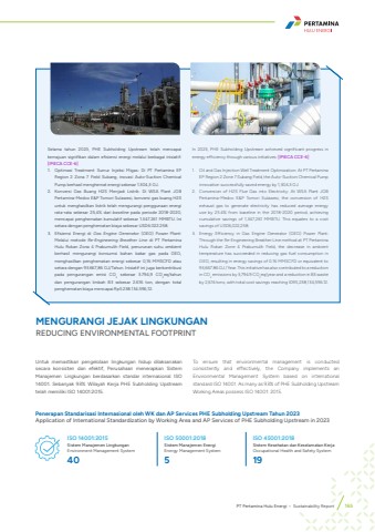 PT Pertamina Hulu Energi %u2022 Sustainability Report 165Selama tahun 2023, PHE Subholding Upstream telah mencapai kemajuan signifikan dalam efisiensi energi melalui berbagai inisiatif:[IPIECA CCE-6]1. Optimasi Treatment Sumur Injeksi Migas: Di PT Pertamina EP Region 2 Zona 7 Field Subang, inovasi Auto-Suction Chemical Pump berhasil menghemat energi sebesar 1.304,3 GJ. 2. Konversi Gas Buang H2S Menjadi Listrik: Di WSA Plant JOB Pertamina-Medco E&P Tomori Sulawesi, konversi gas buang H2S untuk menghasilkan listrik telah mengurangi penggunaan energi rata-rata sebesar 25,4% dari baseline pada periode 2018-2020, mencapai penghematan kumulatif sebesar 1.347.261 MMBTU. Ini setara dengan penghematan biaya sebesar USD6.022.258.3. Efisiensi Energi di Gas Engine Generator (GEG) Power Plant: Melalui metode Re-Engineering Breather Line di PT Pertamina Hulu Rokan Zona 4 Prabumulih Field, penurunan suhu ambientberhasil mengurangi konsumsi bahan bakar gas pada GEG, menghasilkan penghematan energi sebesar 0,16 MMSCFD atau setara dengan 93.667,86 GJ/Tahun. Inisiatif ini juga berkontribusi pada pengurangan emisi CO2 sebesar 3.794,9 CO2eq/tahun dan pengurangan limbah B3 sebesar 2.616 ton, dengan total penghematan biaya mencapai Rp5.238.134.596,12. In 2023, PHE Subholding Upstream achieved significant progress in energy efficiency through various initiatives: [IPIECA CCE-6]1. Oil and Gas Injection Well Treatment Optimization: At PT Pertamina EP Region 2 Zone 7 Subang Field, the Auto-Suction Chemical Pump innovation successfully saved energy by 1,304.3 GJ. 2. Conversion of H2S Flue Gas into Electricity: At WSA Plant JOB Pertamina-Medco E&P Tomori Sulawesi, the conversion of H2S exhaust gas to generate electricity has reduced average energy use by 25.4% from baseline in the 2018-2020 period, achieving cumulative savings of 1,347,261 MMBTU. This equates to a cost savings of USD6,022,258.3. Energy Efficiency in Gas Engine Generator (GEG) Power Plant: Through the Re-Engineering Breather Line method at PT Pertamina Hulu Rokan Zone 4 Prabumulih Field, the decrease in ambient temperature has succeeded in reducing gas fuel consumption in GEG, resulting in energy savings of 0.16 MMSCFD or equivalent to 93,667.86 GJ / Year. This initiative has also contributed to a reduction in CO2 emissions by 3,794.9 CO2eq/year and a reduction in B3 waste by 2,616 tons, with total cost savings reaching IDR5,238,134,596.12. Penerapan Standarisasi Internasional oleh WK dan AP Services PHE Subholding Upstream Tahun 2023Application of International Standardization by Working Area and AP Services of PHE Subholding Upstream in 2023ISO 14001:2015 Sistem Manajemen LingkunganEnvironment Management SystemISO 50001:2018 Sistem Manajemen EnergiEnergy Management SystemISO 45001:2018 Sistem Kesehatan dan Keselamatan KerjaOccupational Health and Safety System40 5 19Untuk memastikan pengelolaan lingkungan hidup dilaksanakan secara konsisten dan efektif, Perusahaan menerapkan Sistem Manajemen Lingkungan berdasarkan standar internasional ISO 14001. Sebanyak 93% Wilayah Kerja PHE Subholding Upstream telah memiliki ISO 14001:2015. To ensure that environmental management is conducted consistently and effectively, the Company implements an Environmental Management System based on international standard ISO 14001. As many as 93% of PHE Subholding Upstream Working Areas possess ISO 14001: 2015.MENGURANGI JEJAK LINGKUNGANREDUCING ENVIRONMENTAL FOOTPRINT