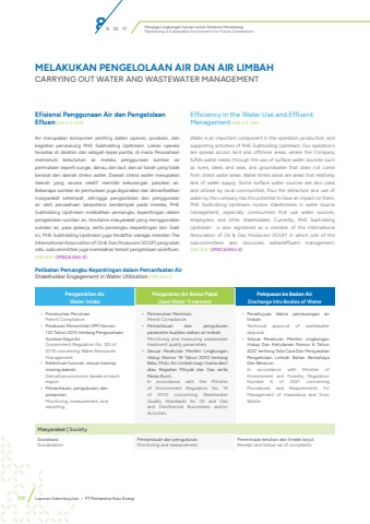 Menjaga Lingkungan Lestari untuk Generasi MendatangMaintaining a Sustainable Environment for Future Generations172 Laporan Keberlanjutan %u2022 PT Pertamina Hulu EnergiEfisiensi Penggunaan Air dan Pengelolaan Efluen [GRI 3-3, 303]Air merupakan komponen penting dalam operasi, produksi, dan kegiatan pendukung PHE Subholding Upstream. Lokasi operasi tersebar di daratan dan wilayah lepas pantai, di mana Perusahaan memenuhi kebutuhan air melalui penggunaan sumber air permukaan seperti sungai, danau, dan laut, dan air tanah yang tidak berasal dari daerah stress water. Daerah stress water merupakan daerah yang secara relatif memiliki kekurangan pasokan air. Beberapa sumber air permukaan juga digunakan dan dimanfaatkan masyarakat setempat, sehingga pengambilan dan penggunaan air oleh perusahaan berpotensi berdampak pada mereka. PHE Subholding Upstream melibatkan pemangku kepentingan dalam pengelolaan sumber air, terutama masyarakat yang menggunakan sumber air, para pekerja, serta pemangku kepentingan lain. Saat ini, PHE Subholding Upstream juga terdaftar sebagai member The International Association of Oil & Gas Producers (IOGP) yang salah satu subcommittee juga membahas terkait pengelolaan air/efluen. [GRI 303-1][IPIECA ENV-2]Efficiency in the Water Use and Effluent Management[GRI 3-3, 303]Water is an important component in the operation, production, and supporting activities of PHE Subholding Upstream. Our operations are spread across land and offshore areas, where the Company fulfills water needs through the use of surface water sources such as rivers, lakes, and seas, and groundwater that does not come from stress water areas. Water stress areas are areas that relatively lack of water supply. Some surface water sources are also used and utilized by local communities, thus the extraction and use of water by the company has the potential to have an impact on them. PHE Subholding Upstream involve stakeholders in water source management, especially communities that use water sources, employees, and other stakeholders. Currently, PHE Subholding Upstream is also registered as a member of the International Association of Oil & Gas Producers (IOGP) in which one of the subcommittees also discusses water/effluent management.[GRI 303-1][IPIECA ENV-2]MELAKUKAN PENGELOLAAN AIR DAN AIR LIMBAH CARRYING OUT WATER AND WASTEWATER MANAGEMENTPelibatan Pemangku Kepentingan dalam Pemanfaatan AirStakeholder Engagement in Water Utilization [GRI 303-1]Pengambilan AirWater IntakePengolahan Air Bekas PakaiUsed Water TreatmentPelepasan ke Badan AirDischarge Into Bodies of Water%u2022 Pemenuhan Perizinan.Permit Compliance.%u2022 Peraturan Pemerintah (PP) Nomor 122 Tahun 2015 tentang Pengusahaan Sumber Daya Air.Government Regulation No. 122 of 2015 concerning Water Resources Management.%u2022 Ketentuan turunan, sesuai masingmasing daerah.Derivative provisions, based on each region.%u2022 Pemantauan, pengukuran, dan pelaporan.Monitoring, measurement, and reporting.%u2022 Pemenuhan Perizinan.Permit Compliance.%u2022 Pemantauan dan pengukuran parameter kualitas olahan air limbah.Monitoring and measuring wastewater treatment quality parameters.%u2022 Sesuai Peraturan Menteri Lingkungan Hidup Nomor 19 Tahun 2010 tentang Baku Mutu Air Limbah bagi Usaha dan/atau Kegiatan Minyak dan Gas serta Panas Bumi.In accordance with the Minister of Environment Regulation No. 19 of 2010 concerning Wastewater Quality Standards for Oil and Gas and Geothermal Businesses and/or Activities.%u2022 Persetujuan teknis pembuangan air limbah. Technical approval of wastewater disposal.%u2022 Sesuai Peraturan Menteri Lingkungan Hidup Dan Kehutanan Nomor 6 Tahun 2021 tentang Tata Cara Dan Persyaratan Pengelolaan Limbah Bahan Berbahaya Dan Beracun.In accordance with Minister of Environment and Forestry Regulation Number 6 of 2021 concerning Procedures and Requirements for Management of Hazardous and Toxic Waste. Masyarakat | SocietySosialisasiSocializationPemantauan dan pengukuran.Monitoring and measurement.Penerimaan keluhan dan tindak lanjut.Receipt and follow-up of complaints.89 10 11