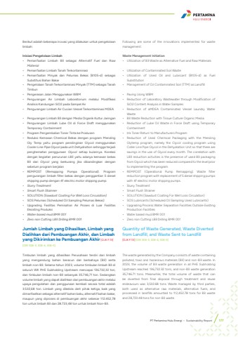 PT Pertamina Hulu Energi %u2022 Sustainability Report 177Berikut adalah beberapa inovasi yang dilakukan untuk pengelolaan limbah:Inisiasi Pengelolaan Limbah%u2022 Pemanfaatan Limbah B3 sebagai Alternatif Fuel dan Raw Material%u2022 Pemanfaatan Limbah Tanah Terkontaminasi%u2022 Pemanfaatan Minyak dan Pelumas Bekas (B105-d) sebagai Substitusi Bahan Bakar%u2022 Pengelolaan Tanah Terkontaminasi Minyak (TTM) sebagai Tanah Timbun%u2022 Pengerasan Jalan Menggunakan WBM%u2022 Pengurangan Air Limbah Laboratorium melalui Modifikasi Analisis Kandungan SiO2 pada Sampel Air%u2022 Pengurangan Limbah Air Cucian Vessel Terkontaminasi MDEA%u2022 Pengurangan Limbah B3 dengan Media Organik Kultur Jaringan%u2022 Pengurangan Limbah Lube Oil di Force Draft menggunakan Temporary Containment%u2022 Program Pengembalian Toner Tinta ke Produsen%u2022 Reduksi Kemasan Chemical Bekas dengan program Mending Gly Temp yaitu program pendinginan Glycol menggunakan Cooler Line Pipe Glycol pada unit Dehydration sehingga terjadi penghematan penggunaan Glycol setiap bulannya. Korelasi dengan kegiatan penurunan LB3 yaitu adanya kemasan bekas B3 dari Glycol yang berkurang jika dibandingkan dengan sebelum program berjalan%u2022 REMPOST (Remapping Pompa Operational). Program pengurangan limbah filter bekas dengan penggantian 5 diesel shipping pump dengan 4f electric motor shipping pump.%u2022 Slurry Treatment%u2022 Smart Flush Stainner%u2022 SOLUTION (Sawdust Coating For Well Loss Circulation)%u2022 SOS Pelumas (Scheduled Oil Sampling Pelumas Bekas)%u2022 Upgrading Fasilitas Pemisahan Air Proses di Luar Fasilitas Eksisting Produksi%u2022 Water based mud BMR 001%u2022 Zero non Cutting LB3 Drilling BMR 001Jumlah Limbah yang Dihasilkan, Limbah yang Dialihkan dari Pembuangan Akhir, dan Limbah yang Dikirimkan ke Pembuangan Akhir [OJK F.13] [GRI 306-3, 306-4, 306-5]Timbulan limbah yang dihasilkan Perusahaan terdiri dari limbah yang mengandung bahan beracun dan berbahaya (B3) serta limbah non-B3. Selama tahun 2023, volume timbulan limbah B3 di seluruh WK PHE Subholding Upstream mencapai 136.732,32 ton, dan timbulan limbah non-B3 sebanyak 35.746,71 ton. Sedangkan volume limbah yang dapat dialihkan dari pembuangan akhir melalui upaya pengolahan dan penggunaan kembali secara total adalah 3.532,68 ton. Limbah yang dikelola oleh pihak ketiga, baik yang dimanfaatkan sebagai alternatif bahan baku, alternatif bahan bakar, maupun yang diproses di pembuangan akhir sebesar 112.452,78 ton untuk limbah B3 dan 28.723,48 ton untuk limbah Non-B3. Following are some of the innovations implemented for waste management:Waste Management Initiation%u2022 Utilization of B3 Waste as Alternative Fuel and Raw Materials%u2022 Utilization of Contaminated Soil Waste%u2022 Utilization of Used Oil and Lubricant (B105-d) as Fuel Substitution%u2022 Management of Oil Contaminated Soil (TTM) as Landfill%u2022 Paving Using WBM%u2022 Reduction of Laboratory Wastewater through Modification of SiO2 Content Analysis in Water Samples%u2022 Reduction of aMDEA Contaminated Vessel Laundry Water Waste%u2022 B3 Waste Reduction with Tissue Culture Organic Media%u2022 Reduction of Lube Oil Waste in Force Draft using Temporary Containment%u2022 Ink Toner Return to Manufacturers Program%u2022 Reduction of Used Chemical Packaging with the Mending Glytemp program, namely the Clycol cooling program using Coller Line Pipe Glycol in the Dehydration Unit so that there are savings in the use of Glycol every month. The correlation with LB3 reduction activities is the presence of used B3 packaging from Glycol which has been reduced compared to the level prior to implementing the program %u2022 REMPOST (Operational Pump Remapping). Waste filter reduction program with replacement of 5 diesel shipping pumps with 4f electric motor shipping pumps.%u2022 Slurry Treatment%u2022 Smart Flush Strainer%u2022 SOLUTION (Sawdust Coating For Well Loss Circulation)%u2022 SOS Lubricants (Scheduled Oil Sampling Used Lubricants)%u2022 Upgrading Process Water Separation Facilities Outside Existing Production Facilities%u2022 Water based mud BMR 001%u2022 Zero non Cutting LB3 Drilling BMR 001Quantity of Waste Generated, Waste Diverted from Landfill, and Waste Sent to Landfill [OJK F.13] [GRI 306-3, 306-4, 306-5]The waste generated by the Company consists of waste containing polluted, toxic and hazardous materials (B3) and non-B3 waste. In 2023, the volume of B3 waste generation in all PHE Subholding Upstream reached 136,732.32 tons, and non-B3 waste generation 35,746.71 tons. Meanwhile, the total volume of waste that can be diverted from final disposal through treatment and reuse endeavours was 3,532.68 tons. Waste managed by third parties, both used as alternative raw materials, alternative fuels, and processed in landfills amounted to 112,452.78 tons for B3 waste and 28,723.48 tons for non-B3 waste.