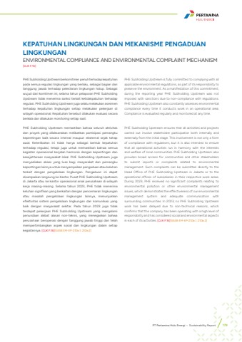 PT Pertamina Hulu Energi %u2022 Sustainability Report 179PHE Subholding Upstream berkomitmen penuh terhadap kepatuhan pada semua regulasi lingkungan yang berlaku, sebagai bagian dari tanggung jawab terhadap pelestarian lingkungan hidup. Sebagai wujud dari komitmen ini, selama tahun pelaporan PHE Subholding Upstream tidak menerima sanksi terkait ketidakpatuhan terhadap regulasi. PHE Subholding Upstream juga selalu melakukan asesmen terhadap kepatuhan lingkungan setiap melakukan pekerjaan di wilayah operasional. Kepatuhan tersebut dilakukan evaluasi secara berkala dan dilakukan monitoring setiap saat.PHE Subholding Upstream memastikan bahwa seluruh aktivitas dan proyek yang dilaksanakan melibatkan partisipasi pemangku kepentingan baik secara internal maupun eksternal sejak tahap awal. Keterlibatan ini tidak hanya sebagai bentuk kepatuhan terhadap regulasi, tetapi juga untuk memastikan bahwa semua kegiatan operasional berjalan harmonis dengan kepentingan dan kesejahteraan masyarakat lokal. PHE Subholding Upstream juga menyediakan akses yang luas bagi masyarakat dan pemangku kepentingan lainnya untuk menyampaikan pengaduan atau keluhan terkait dengan pengelolaan lingkungan. Pengaduan ini dapat disampaikan langsung ke Kantor Pusat PHE Subholding Upstream di Jakarta atau ke kantor operasional anak perusahaan di wilayah kerja masing-masing. Selama tahun 2023, PHE tidak menerima keluhan signifikan yang berkaitan dengan pencemaran lingkungan atau masalah pengelolaan lingkungan lainnya, menunjukkan efektivitas sistem pengelolaan lingkungan dan komunikasi yang baik dengan masyarakat sekitar. Pada tahun 2023 juga tidak terdapat pekerjaan PHE Subholding Upstream yang mengalami penundaan akibat alasan non-teknis, yang menegaskan bahwa perusahaan beroperasi dengan tanggung jawab tinggi dan telah mempertimbangkan aspek sosial dan lingkungan dalam setiap kegiatannya. [OJK F.16][SASB EM-EP-210b.1, 210b.2]PHE Subholding Upstream is fully committed to complying with all applicable environmental regulations, as part of its responsibility to preserve the environment. As a manifestation of this commitment, during the reporting year PHE Subholding Upstream was not imposed with sanctions due to non-compliance with regulations. PHE Subholding Upstream also constantly assesses environmental compliance every time it conducts work in an operational area. Compliance is evaluated regularly and monitored at any time.PHE Subholding Upstream ensures that all activities and projects carried out involve stakeholder participation both internally and externally from the initial stage. This involvement is not only a form of compliance with regulations, but it is also intended to ensure that all operational activities run in harmony with the interests and welfare of local communities. PHE Subholding Upstream also provides broad access for communities and other stakeholders to submit reports or complaints related to environmental management. Such complaints can be submitted directly to the Head Office of PHE Subholding Upstream in Jakarta or to the operational offices of subsidiaries in their respective work areas. During 2023, PHE received no significant complaints relating to environmental pollution or other environmental management issues, which demonstrates the effectiveness of our environmental management system and adequate communication with surrounding communities. In 2023, no PHE Subholding Upstream work has been delayed due to non-technical reasons, which confirms that the company has been operating with a high level of responsibility and has considered social and environmental aspects in each of its activities. [OJK F.16][SASB EM-EP-210b.1, 210b.2]KEPATUHAN LINGKUNGAN DAN MEKANISME PENGADUAN LINGKUNGANENVIRONMENTAL COMPLIANCE AND ENVIRONMENTAL COMPLAINT MECHANISM[OJK F.16]
