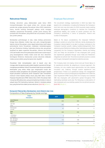 Rekrutmen PekerjaStrategi rekrutmen yang dilaksanakan pada tahun 2023 mempertimbangkan lima aspek antara lain: rencana jangka pendek dan jangka panjang Perusahaan tahun 2023, kebutuhan bisnis, kondisi existing demografi pekerja untuk menjaga stabilitas operasional Perusahaan, jumlah posisi kosong dan produktivitas Perusahaan yang dilihat dari sisi produksi, finansial dan jumlah pekerja.Berdasarkan pertimbangan di atas, maka strategi pemenuhan tenaga kerja dilakukan melalui tiga cara yaitu mengembangkan talenta internal Perusahaan untuk dapat berkontribusi aktif dalam pertumbuhan bisnis Perusahaan, melakukan mutasi/penugasan dari luar (Pertamina Holding, Subholding lainnya dan perusahaan terafiliasi) ke dalam organisasi Perusahaan, Internal Job Posting (IJP), dan terakhir rekrutmen pekerja baru baik lulusan muda maupun yang berpengalaman melalui media sosial dan situs rekrutmen terintegrasi Pertamina. Keseluruhan proses rekrutmen dilakukan melalui proses seleksi yang transparan dan obyektif. Perusahaan tidak mempekerjakan anak di bawah umur dan menggunakan tenaga kerja paksa dalam kegiatan operasional. Dengan mengadopsi pendekatan inklusif, Perusahaan tidak hanya menciptakan kesempatan yang setara, tetapi juga menginspirasi inovasi dan kreativitas melalui pengalaman dan perspektif yang beragam. Apabila terjadi perubahan operasional, pihak manajemen akan memberikan minimum notice kepada pekerja sesuai yang telah diatur di dalam Perjanjian Kerja Bersama (PKB). Selama tahun 2023, Perusahaan telah menyaring 328 pekerja baru yang penempatannya tersebar di seluruh wilayah kerja PHE Subholding Upstream. Berikut ini deskripsi pekerja baru yang berhasil lolos dalam proses rekrutmen: [OJK F.19] [GRI 401-1]Employee RecruitmentThe recruitment strategy implemented in 2023 has taken five aspects into consideration, including the following: the Company's short-term and long-term plans for 2023, business needs, existing employee demographic conditions to maintain the Company's operational stability, the number of vacant positions and the Company's productivity in terms of production, finance and number of employees.Based on the above considerations, the manpower fulfilment strategy is carried out using three methods, namely developing the Company's internal talents to be able to actively contribute to the Company's business growth, making mutations/assignments from external sources (Pertamina Holding, other Subholdings and affiliated companies) into the Company's organization, Internal Job Posting (IJP), and finally the recruitment of new employees both young and experienced graduates through social media and Pertamina's integrated recruitment site. The entire recruitment process is carried out through a transparent and objective selection process. The Company does not employ minors and use forced labour in its operational activities. By adopting an inclusive approach, the Company not only creates equal opportunities, but also inspires innovation and creativity through diverse experiences and perspectives. If there is an operational change, the management gives a minimum notice to employees as stipulated in the Collective Labor Agreement (PKB). During 2023, the Company has screened 328 new employees with placements spread throughout PHE Subholding Upstream work area. The following is a description of new employees who successfully passed the recruitment process:[OJK F.19] [GRI 401-1]Komposisi Pekerja Baru Berdasarkan Jenis Kelamin dan UsiaComposition of New Employees by Gender and AgeUraianDescription 2023 2022 2021Jenis KelaminGender 328 286 0Laki-laki Male 296 236 0PerempuanFemale 32 50 0UsiaAge 328 286 0> 50 tahun > 50 years 4 7 030 - 50 tahun 30 -50 years 173 109 0< 30 tahun < 30 years 151 170 0PT Pertamina Hulu Energi %u2022 Sustainability Report 185