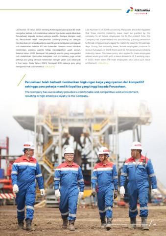 Perusahaan telah berhasil memberikan lingkungan kerja yang nyaman dan kompetitif sehingga para pekerja memiliki loyalitas yang tinggi kepada Perusahaan. The Company has successfully provided a comfortable and competitive work environment, resulting in high employee loyalty to the Company.UU Nomor 13 Tahun 2003 tentang Ketenagakerjaan pasal 82 telah mengatur bahwa cuti melahirkan selama tiga bulan wajib diberikan Perusahaan kepada semua pekerja wanita. Sampai dengan saat ini, Perusahaan telah menjalankan undang-undang ini dengan memberikan ijin kepada pekerja wanita yang melakukan pengajuan cuti melahirkan selama 90 hari kalender. Selama masa istirahat melahirkan, pekerja wanita tetap mendapatkan upah penuh. Selama tahun 2023 terdapat 56 pekerja wanita yang mengambil cuti melahirkan. Kemudian kebijakan cuti ini berlaku juga untuk pekerja pria yang istrinya melahirkan dengan jatah cuti sebanyak 5 hari kerja. Pada tahun 2023, terdapat 278 pekerja pria yang mengambil hak cuti tersebut. [GRI 401-3]Law Number 13 of 2003 concerning Manpower article 82 regulates that three months maternity leave must be granted by the company to all female employees. Up to the present time, the Company has implemented this provision by granting permission to female employees who apply for maternity leave for 90 calendar days. During the maternity break, female employees continue to receive full wages. In 2023, there were 56 female employees taking maternity leave. This leave policy also applies to male employees whose wives give birth with a leave allowance of 5 working days. In 2023, there were 278 male employees who used such leave entitlement. [GRI 401-3]PT Pertamina Hulu Energi %u2022 Sustainability Report 189