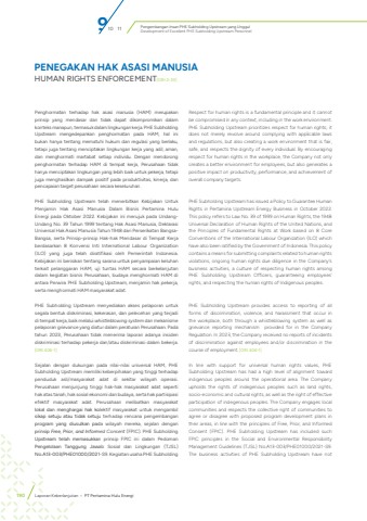 Pengembangan Insan PHE Subholding Upstream yang UnggulDevelopment of Excellent PHE Subholding Upstream Personnel 10 11Penghormatan terhadap hak asasi manusia (HAM) merupakan prinsip yang mendasar dan tidak dapat dikompromikan dalam konteks manapun, termasuk dalam lingkungan kerja. PHE Subholding Upstream mengedepankan penghormatan pada HAM, hal ini bukan hanya tentang mematuhi hukum dan regulasi yang berlaku, tetapi juga tentang menciptakan lingkungan kerja yang adil, aman, dan menghormati martabat setiap individu. Dengan mendorong penghormatan terhadap HAM di tempat kerja, Perusahaan tidak hanya menciptakan lingkungan yang lebih baik untuk pekerja, tetapi juga menghasilkan dampak positif pada produktivitas, kinerja, dan pencapaian target perusahaan secara keseluruhan.PHE Subholding Upstream telah menerbitkan Kebijakan Untuk Menjamin Hak Asasi Manusia Dalam Bisnis Pertamina Hulu Energi pada Oktober 2022. Kebijakan ini merujuk pada UndangUndang No. 39 Tahun 1999 tentang Hak Asasi Manusia, Deklarasi Universal Hak Asasi Manusia Tahun 1948 dari Perserikatan BangsaBangsa, serta Prinsip-prinsip Hak-hak Mendasar di Tempat Kerja berdasarkan 8 Konvensi Inti International Labour Organization (ILO) yang juga telah diratifikasi oleh Pemerintah Indonesia. Kebijakan ini berisikan tentang sarana untuk penyampaian keluhan terkait pelanggaran HAM, uji tuntas HAM secara berkelanjutan dalam kegiatan bisnis Perusahaan, budaya menghormati HAM di antara Perwira PHE Subholding Upstream, menjamin hak pekerja, serta menghormati HAM masyarakat adat.PHE Subholding Upstream menyediakan akses pelaporan untuk segala bentuk diskriminasi, kekerasan, dan pelecehan yang terjadi di tempat kerja, baik melalui whistleblowing system dan mekanisme pelaporan grievance yang diatur dalam peraturan Perusahaan. Pada tahun 2023, Perusahaan tidak menerima laporan adanya insiden diskriminasi terhadap pekerja dan/atau diskriminasi dalam bekerja.[GRI 406-1] Sejalan dengan dukungan pada nilai-nilai universal HAM, PHE Subholding Upstream memiliki keberpihakan yang tinggi terhadap penduduk asli/masyarakat adat di sekitar wilayah operasi. Perusahaan menjunjung tinggi hak-hak masyarakat adat seperti hak atas tanah, hak sosial ekonomi dan budaya, serta hak partisipasi efektif masyarakat adat. Perusahaan melibatkan masyarakat lokal dan menghargai hak kolektif masyarakat untuk mengambil sikap setuju atau tidak setuju terhadap rencana pengembangan program yang diusulkan pada wilayah mereka, sejalan dengan prinsip Free, Prior, and Informed Consent (FPIC). PHE Subholding Upstream telah memasukkan prinsip FPIC ini dalam Pedoman Pengelolaan Tanggung Jawab Sosial dan Lingkungan (TJSL) No.A13-003/PHE01000/2021-S9. Kegiatan usaha PHE Subholding Respect for human rights is a fundamental principle and it cannot be compromised in any context, including in the work environment. PHE Subholding Upstream prioritizes respect for human rights; it does not merely revolve around complying with applicable laws and regulations, but also creating a work environment that is fair, safe, and respects the dignity of every individual. By encouraging respect for human rights in the workplace, the Company not only creates a better environment for employees, but also generates a positive impact on productivity, performance, and achievement of overall company targets.PHE Subholding Upstream has issued a Policy to Guarantee Human Rights in Pertamina Upstream Energy Business in October 2022. This policy refers to Law No. 39 of 1999 on Human Rights, the 1948 Universal Declaration of Human Rights of the United Nations, and the Principles of Fundamental Rights at Work based on 8 Core Conventions of the International Labour Organization (ILO) which have also been ratified by the Government of Indonesia. This policy contains a means for submitting complaints related to human rights violations, ongoing human rights due diligence in the Company's business activities, a culture of respecting human rights among PHE Subholding Upstream Officers, guaranteeing employees' rights, and respecting the human rights of Indigenous peoples.PHE Subholding Upstream provides access to reporting of all forms of discrimination, violence, and harassment that occur in the workplace, both through a whistleblowing system as well as grievance reporting mechanism provided for in the Company Regulation. In 2023, the Company received no reports of incidents of discrimination against employees and/or discrimination in the course of employment. [GRI 406-1]In line with support for universal human rights values, PHE Subholding Upstream has had a high level of alignment toward indigenous peoples around the operational area. The Company upholds the rights of indegenous peoples such as land rights, socio-economic and cultural rights, as well as the right of effective participation of indegenous peoples. The Company engages local communities and respects the collective right of communities to agree or disagree with proposed program development plans in their areas, in line with the principles of Free, Prior, and Informed Consent (FPIC). PHE Subholding Upstream has included such FPIC principles in the Social and Environmental Responsibility Management Guidelines (TJSL) No.A13-003/PHE01000/2021-S9. The business activities of PHE Subholding Upstream have not PENEGAKAN HAK ASASI MANUSIAHUMAN RIGHTS ENFORCEMENT[GRI 2-23]9190 Laporan Keberlanjutan %u2022 PT Pertamina Hulu Energi