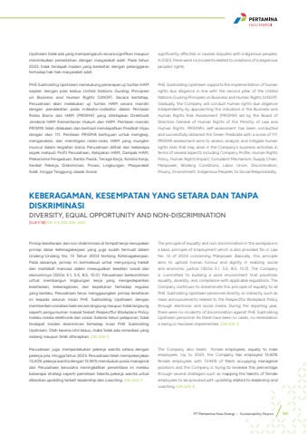 Upstream tidak ada yang mempengaruhi secara signifikan maupun menimbulkan perselisihan dengan masyarakat adat. Pada tahun 2023, tidak terdapat insiden yang berkaitan dengan pelanggaran terhadap hak-hak masyarakat adat.PHE Subholding Upstream mendukung penerapan uji tuntas HAM sejalan dengan pilar kedua United Nations Guiding Principles on Business and Human Rights (UNGP). Secara bertahap, Perusahaan akan melakukan uji tuntas HAM secara mandiri dengan pendekatan pada indikator-indikator dalam Penilaian Risiko Bisnis dan HAM (PRISMA) yang ditetapkan Direktorat Jenderal HAM Kementarian Hukum dan HAM. Penilaian mandiri PRISMA telah dilakukan dan berhasil mendapatkan Predikat Hijau dengan skor 111. Penilaian PRISMA bertujuan untuk mengkaji, menganalisis, dan memitigasi risiko-risiko HAM yang mungkin muncul dalam kegiatan bisnis Perusahaan dilihat dari beberapa aspek meliputi Profil Perusahaan, Kebijakan HAM, Dampak HAM, Mekanisme Pengaduan, Rantai Pasok, Tenaga Kerja, Kondisi Kerja, Serikat Pekerja, Diskriminasi, Privasi, Lingkungan, Masyarakat Adat, hingga Tanggung Jawab Sosial.significantly affected or caused disputes with indigenous peoples. In 2023, there were no incidents related to violations of indegenous peoples' rights.PHE Subholding Upstream supports the implementation of human rights due diligence in line with the second pillar of the United Nations Guiding Principles on Business and Human Rights (UNGP). Gradually, the Company will conduct human rights due diligence independently by approaching the indicators in the Business and Human Rights Risk Assessment (PRISMA) set by the Board of Directors General of Human Rights of the Ministry of Law and Human Rights. PRISMA's self-assessment has been conducted and successfully obtained the Green Predicate with a score of 111. PRISMA assessment aims to assess, analyze, and mitigate human rights risks that may arise in the Company's business activities in terms of several aspects including Company Profile, Human Rights Policy, Human Rights Impact, Complaint Mechanism, Supply Chain, Manpower, Working Conditions, Labor Union, Discrimination, Privacy, Environment, Indigenous Peoples, to Social Responsibility.KEBERAGAMAN, KESEMPATAN YANG SETARA DAN TANPA DISKRIMINASIDIVERSITY, EQUAL OPPORTUNITY AND NON-DISCRIMINATION [OJK F.18][GRI 3-3, 202, 405, 406]Prinsip kesetaraan dan non-diskriminasi di tempat kerja merupakan prinsip dasar ketenagakerjaan yang juga sudah termuat dalam Undang-Undang No. 13 Tahun 2003 tentang Ketenagakerjaan. Pada dasarnya, prinsip ini bermaksud untuk menjunjung harkat dan martabat manusia dalam mewujudkan keadilan sosial dan ekonominya (SDGs 5.1, 5.5, 8.5, 10.2). Perusahaan berkomitmen untuk membangun lingkungan kerja yang mengedepankan kesetaraan, keberagaman, dan kepatuhan terhadap regulasi yang berlaku. Perusahaan terus menggaungkan prinsip kesetaran ini kepada seluruh Insan PHE Subholding Upstream dengan memberikan sosialiasi baik secara langsung maupun tidak langsung seperti pengumuman massal terkait Respectful Workplace Policymelalui media elektronik dan sosial. Selama tahun pelaporan, tidak terdapat insiden diskriminasi terhadap Insan PHE Subholding Upstream. Oleh karena nihil kasus, maka tidak ada remediasi yang sedang maupun telah diterapkan. [GRI 406-1]Perusahaan juga memperlakukan pekerja wanita setara dengan pekerja pria. Hingga tahun 2023. Perusahaan telah mempekerjakan 13,40% pekerja wanita dengan 13,94% menduduki posisi manajerial dan Perusahaan berusaha meningkatkan persentase ini melalui beberapa strategi seperti pemetaan talenta pekerja wanita untuk diberikan upskilling terkait leadership dan coaching. [GRI 405-1]The principle of equality and non-discrimination in the workplace is a basic principle of employment which is also provided for in Law No. 13 of 2003 concerning Manpower. Basically, this principle aims to uphold human honour and dignity in realizing social and economic justice (SDGs 5.1, 5.5, 8.5, 10.2). The Company is committed to building a work environment that prioritizes equality, diversity, and compliance with applicable regulations. The Company continues to disseminate this principle of equality to all PHE Subholding Upstream personnel directly or indirectly such as mass announcements related to the Respectful Workplace Policy through electronic and social media. During the reporting year, there were no incidents of discrimination against PHE Subholding Upstream personnel. As there have been no cases, no remediation is being or has been implemented. [GRI 406-1]The Company also treats female employees, equally to male employees. Up to 2023, the Company has employed 13.40% female employees with 13.94% of them occupying managerial positions and the Company is trying to increase this percentage through several strategies such as mapping the talents of female employees to be provided with upskilling related to leadership and coaching. [GRI 405-1]PT Pertamina Hulu Energi %u2022 Sustainability Report 191