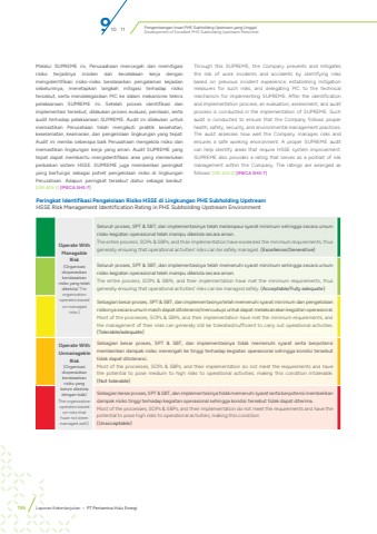 Pengembangan Insan PHE Subholding Upstream yang UnggulDevelopment of Excellent PHE Subholding Upstream Personnel 10 11Melalui SUPREME ini, Perusaahaan mencegah dan memitigasi risiko terjadinya insiden dan kecelakaan kerja dengan mengidentifikasi risiko-risiko berdasarkan pengalaman kejadian sebelumnya, menetapkan langkah mitigasi terhadap risiko tersebut, serta mendelegasikan PIC ke dalam mekanisme teknis pelaksanaan SUPREME ini. Setelah proses identifikasi dan implementasi tersebut, dilakukan proses evaluasi, penilaian, serta audit terhadap pelaksanaan SUPREME. Audit ini dilakukan untuk memastikan Perusahaan telah mengikuti praktik kesehatan, keselamatan, keamanan, dan pengelolaan lingkungan yang tepat. Audit ini menilai seberapa baik Perusahaan mengelola risiko dan memastikan lingkungan kerja yang aman. Audit SUPREME yang tepat dapat membantu mengidentifikasi area yang memerlukan perbaikan sistem HSSE. SUPREME juga memberikan peringkat yang berfungsi sebagai potret pengelolaan risiko di lingkungan Perusahaan. Adapun peringkat tersebut diatur sebagai berikut:[GRI 403-2] [IPIECA SHS-7]Through this SUPREME, the Company prevents and mitigates the risk of work incidents and accidents by identifying risks based on previous incident experience, establishing mitigation measures for such risks, and delegating PIC to the technical mechanism for implementing SUPREME. After the identification and implementation process, an evaluation, assessment, and audit process is conducted in the implementation of SUPREME. Such audit is conducted to ensure that the Company follows proper health, safety, security, and environmental management practices. The audit assesses how well the Company manages risks and ensures a safe working environment. A proper SUPREME audit can help identify areas that require HSSE system improvement. SUPREME also provides a rating that serves as a portrait of risk management within the Company. The ratings are arranged as follows: [GRI 403-2] [IPIECA SHS-7]Peringkat Identifikasi Pengelolaan Risiko HSSE di Lingkungan PHE Subholding UpstreamHSSE Risk Management Identification Rating in PHE Subholding Upstream EnvironmentOperate With Managable Risk(Organisasi dioperasikan berdasarkan risiko yang telah dikelola/ The organization operates based on managed risks.)Seluruh proses, SPT & SBT, dan implementasinya telah melampaui syarat minimum sehingga secara umum risiko kegiatan operasional telah mampu dikelola secara aman.The entire process, SOPs & SBPs, and their implementation have exceeded the minimum requirements, thus generally ensuring that operational activities' risks can be safely managed. (Excellence/Generative)Seluruh proses, SPT & SBT, dan implementasinya telah memenuhi syarat minimum sehingga secara umum risiko kegiatan operasional telah mampu dikelola secara aman.The entire process, SOPs & SBPs, and their implementation have met the minimum requirements, thus generally ensuring that operational activities' risks can be managed safely. (Acceptable/Fully adequate)Sebagian besar proses, SPT & SBT, dan implementasinya telah memenuhi syarat minimum dan pengelolaan risikonya secara umum masih dapat ditoleransi/mencukupi untuk dapat melaksanakan kegiatan operasional.Most of the processes, SOPs & SBPs, and their implementation have met the minimum requirements, and the management of their risks can generally still be tolerated/sufficient to carry out operational activities. (Tolerable/adequate)Operate With Unmanageble Risk (Organisasi dioperasikan berdasarkan risiko yang belum dikelola dengan baik/ The organization operates based on risks that have not been managed well.)Sebagian besar proses, SPT & SBT, dan implementasinya tidak memenuhi syarat serta berpotensi memberikan dampak risiko menengah ke tinggi terhadap kegiatan operasional sehingga kondisi tersebut tidak dapat ditoleransi.Most of the processes, SOPs & SBPs, and their implementation do not meet the requirements and have the potential to pose medium to high risks to operational activities, making this condition intolerable. (Not tolerable)Sebagian besar proses, SPT & SBT, dan implementasinya tidak memenuhi syarat serta berpotensi memberikan dampak risiko tinggi terhadap kegiatan operasional sehingga kondisi tersebut tidak dapat diterima. Most of the processes, SOPs & SBPs, and their implementation do not meet the requirements and have the potential to pose high risks to operational activities, making this condition. (Unacceptable)9196 Laporan Keberlanjutan %u2022 PT Pertamina Hulu Energi