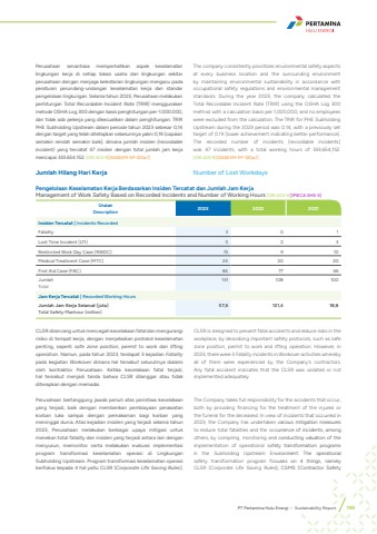 Perusahaan senantiasa memperhatikan aspek keselamatan lingkungan kerja di setiap lokasi usaha dan lingkungan sekitar perusahaan dengan menjaga kelestarian lingkungan mengacu pada peraturan perundang-undangan keselamatan kerja dan standar pengelolaan lingkungan. Selama tahun 2023, Perusahaan melakukan perhitungan Total Recordable Incident Rate (TRIR) menggunakan metode OSHA Log 300 dengan basis penghitungan per-1.000.000, dan tidak ada pekerja yang dikecualikan dalam penghitungan. TRIR PHE Subholding Upstream dalam periode tahun 2023 sebesar 0,14 dengan target yang telah ditetapkan sebelumnya yakni 0,19 (capaian semakin rendah semakin baik), dimana jumlah insiden (recordable incident) yang tercatat 47 insiden dengan total jumlah jam kerja mencapai 333.654.152. [GRI 403-9][SASB EM-EP-320a.1]Jumlah Hilang Hari KerjaThe company consistently prioritizes environmental safety aspects at every business location and the surrounding environment by maintaining environmental sustainability in accordance with occupational safety regulations and environmental management standards. During the year 2023, the company calculated the Total Recordable Incident Rate (TRIR) using the OSHA Log 300 method with a calculation basis per 1,000,000, and no employees were excluded from the calculation. The TRIR for PHE Subholding Upstream during the 2023 period was 0.14, with a previously set target of 0.19 (lower achievement indicating better performance). The recorded number of incidents (recordable incidents) was 47 incidents, with a total working hours of 333,654,152. [GRI 403-9][SASB EM-EP-320a.1]Number of Lost WorkdaysCLSR dirancang untuk mencegah kecelakaan fatal dan mengurangi risiko di tempat kerja, dengan menjelaskan protokol keselamatan penting, seperti safe zone position, permit to work dan lifting operation. Namun, pada tahun 2023, terdapat 3 kejadian Fatalitypada kegiatan Workover dimana hal tersebut seluruhnya dialami oleh kontraktor Perusahaan. Ketika kecelakaan fatal terjadi, hal tersebut menjadi tanda bahwa CLSR dilanggar atau tidak diterapkan dengan memadai. Perusahaan bertanggung jawab penuh atas peristiwa kecelakaan yang terjadi, baik dengan memberikan pembiayaan perawatan korban luka sampai dengan pemakaman bagi korban yang meninggal dunia. Atas kejadian insiden yang terjadi selama tahun 2023, Perusahaan melakukan berbagai upaya mitigasi untuk menekan total fatality dan insiden yang terjadi antara lain dengan menyusun, memonitor serta melakukan evaluasi implementasi program transformasi keselamatan operasi di Lingkungan Subholding Upstream. Program transformasi keselamatan operasi berfokus kepada 4 hal yaitu CLSR (Corporate Life Saving Rules), CLSR is designed to prevent fatal accidents and reduce risks in the workplace, by describing important safety protocols, such as safe zone position, permit to work and lifting operation. However, in 2023, there were 3 Fatality incidents in Workover activities whereby all of them were experienced by the Company's contractors. Any fatal accident indicates that the CLSR was violated or not implemented adequately. The Company takes full responsibility for the accidents that occur, both by providing financing for the treatment of the injured or the funeral for the deceased. In view of incidents that occurred in 2023, the Company has undertaken various mitigation measures to reduce total fatalities and the occurrence of incidents, among others, by compiling, monitoring and conducting valuation of the implementation of operational safety transformation programs in the Subholding Upstream Environment. The operational safety transformation program focuses on 4 things, namely CLSR (Corporate Life Saving Rules), CSMS (Contractor Safety Pengelolaan Keselamatan Kerja Berdasarkan Insiden Tercatat dan Jumlah Jam KerjaManagement of Work Safety Based on Recorded Incidents and Number of Working Hours [GRI 403-9][IPIECA SHS-3]UraianDescription 2023 2022 2021Insiden Tercatat | Incidents RecordedFatality 3 0 1Lost Time Incident (LTI) 5 2 3Restricted Work Day Case (RWDC) 15 9 10Medical Treatment Case (MTC) 24 20 20First Aid Case (FAC) 84 77 66Jumlah Total131 108 100Jam Kerja Tercatat | Recorded Working HoursJumlah Jam Kerja Selamat (juta)Total Safety Manhour (million)57,6 121,4 18,8PT Pertamina Hulu Energi %u2022 Sustainability Report 199