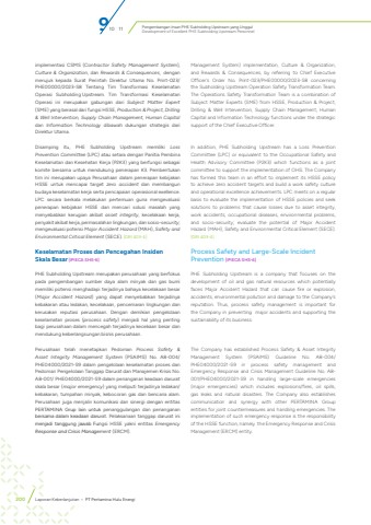 Pengembangan Insan PHE Subholding Upstream yang UnggulDevelopment of Excellent PHE Subholding Upstream Personnel 10 11implementasi CSMS (Contractor Safety Management System), Culture & Organization, dan Rewards & Consequences, dengan merujuk kepada Surat Perintah Direktur Utama No. Print-023/PHE00000/2023-S8 Tentang Tim Transformasi Keselamatan Operasi Subholding Upstream. Tim Transformasi Keselamatan Operasi ini merupakan gabungan dari Subject Matter Expert (SME) yang berasal dari fungsi HSSE, Production & Project, Drilling & Well Intervention, Supply Chain Management, Human Capital dan Information Technology dibawah dukungan strategis dari Direktur Utama. Disamping itu, PHE Subholding Upstream memiliki Loss Prevention Committee (LPC) atau setara dengan Panitia Pembina Keselamatan dan Kesehatan Kerja (P2K3) yang berfungsi sebagai komite bersama untuk mendukung penerapan K3. Pembentukan tim ini merupakan upaya Perusahaan dalam penerapan kebijakan HSSE untuk mencapai target zero accident dan membangun budaya keselamatan kerja serta pencapaian operasional exellence. LPC secara berkala melakukan pertemuan guna mengevaluasi penerapan kebijakan HSSE dan mencari solusi masalah yang menyebabkan kerugian akibat asset integrity, kecelakaan kerja, penyakit akibat kerja, permasalahan lingkungan, dan sosio-security; mengevaluasi potensi Major Accident Hazard (MAH), Safety and Environmental Critical Element (SECE). [GRI 403-4]Keselamatan Proses dan Pencegahan Insiden Skala Besar [IPIECA SHS-6]PHE Subholding Upstream merupakan perusahaan yang berfokus pada pengembangan sumber daya alam minyak dan gas bumi memiliki potensi menghadapi terjadinya bahaya kecelakaan besar (Major Accident Hazard) yang dapat menyebabkan terjadinya kebakaran atau ledakan, kecelakaan, pencemaran lingkungan dan kerusakan reputasi perusahaan. Dengan demikian pengelolaan keselamatan proses (process safety) menjadi hal yang penting bagi perusahaan dalam mencegah terjadinya kecekaan besar dan mendukung keberlangsungan bisnis perusahaan. Perusahaan telah menetapkan Pedoman Process Safety & Asset Integrity Management System (PSAIMS) No. A8-004/PHE04000/2021-S9 dalam pengelolaan keselamatan proses dan Pedoman Pengelolaan Tanggap Darurat dan Manajemen Krisis No. A8-001/ PHE04000/2021-S9 dalam penanganan keadaan darurat skala besar (major emergency) yang meliputi terjadinya ledakan/kebakaran, tumpahan minyak, kebocoran gas dan bencana alam. Perusahaan juga menjalin komunikasi dan sinergi dengan entitas PERTAMINA Grup lain untuk penanggulangan dan penanganan bersama dalam keadaan darurat. Pelaksanaan tanggap darurat ini menjadi tanggung jawab Fungsi HSSE yakni entitas Emergency Response and Crisis Management (ERCM). Management System) implementation, Culture & Organization, and Rewards & Consequences, by referring to Chief Executive Officer's Order No. Print-023/PHE00000/2023-S8 concerning the Subholding Upstream Operation Safety Transformation Team. The Operations Safety Transformation Team is a combination of Subject Matter Experts (SME) from HSSE, Production & Project, Drilling & Well Intervention, Supply Chain Management, Human Capital and Information Technology functions under the strategic support of the Chief Executive Officer. In addition, PHE Subholding Upstream has a Loss Prevention Committee (LPC) or equivalent to the Occupational Safety and Health Advisory Committee (P2K3) which functions as a joint committee to support the implementation of OHS. The Company has formed this team in an effort to implement its HSSE policy to achieve zero accident targets and build a work safety culture and operational excellence achievements. LPC meets on a regular basis to evaluate the implementation of HSSE policies and seek solutions to problems that cause losses due to asset integrity, work accidents, occupational diseases, environmental problems, and socio-security; evaluate the potential of Major Accident Hazard (MAH), Safety and Environmental Critical Element (SECE). [GRI 403-4]Process Safety and Large-Scale Incident Prevention [IPIECA SHS-6]PHE Subholding Upstream is a company that focuses on the development of oil and gas natural resources which potentially faces Major Accident Hazard that can cause fire or explosion, accidents, environmental pollution and damage to the Company's reputation. Thus, process safety management is important for the Company in preventing major accidents and supporting the sustainability of its business. The Company has established Process Safety & Asset Integrity Management System (PSAIMS) Guideline No. A8-004/PHE04000/2021-S9 in process safety management and Emergency Response and Crisis Management Guideline No. A8-001/PHE04000/2021-S9 in handling large-scale emergencies (major emergencies) which includes explosions/fires, oil spills, gas leaks and natural disasters. The Company also establishes communication and synergy with other PERTAMINA Group entities for joint countermeasures and handling emergencies. The implementation of such emergency response is the responsibility of the HSSE function, namely the Emergency Response and Crisis Management (ERCM) entity. 9200 Laporan Keberlanjutan %u2022 PT Pertamina Hulu Energi