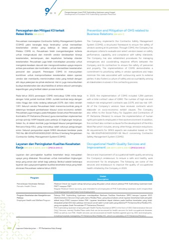 Pengembangan Insan PHE Subholding Upstream yang UnggulDevelopment of Excellent PHE Subholding Upstream Personnel 10 11Pencegahan dan Mitigasi K3 terkait Relasi Bisnis [GRI 403-7]Perusahaan menerapkan Contractor Safety Management System (CSMS) yakni kerangka kerja terstruktur untuk memastikan keselamatan vendor yang bekerja di lokasi perusahaan. Melalui CSMS ini, Perusahaan telah mengembangkan kriteria untuk mengevaluasi dan memilih vendor berdasarkan kinerja keselamatan, kemampuan, dan kepatuhan terhadap standar keselamatan. Perusahaan juga telah menetapkan prosedur untuk mengelola keadaan darurat dan mengoordinasikan upaya respons antara perusahaan dan kontraktor untuk memastikan keselamatan personel dan properti. Penerapan CSMS ini menunjukkan komitmen untuk memprioritaskan keselamatan dalam operasi vendor dan membantu meminimalkan risiko yang terkait dengan alih daya pekerjaan ke pihak eksternal. Hal ini juga menumbuhkan budaya keselamatan dan akuntabilitas di antara seluruh pemangku kepentingan yang terlibat dalam proses kontrak. Pada tahun 2023, penerapan CSMS mencakup 1.294 mitra kerja dengan total jumlah kontrak 3.990. Jumlah kontrak kerja dengan risiko tinggi dan risiko sedang sebanyak 2.079, dan risiko rendah 1.911. Seluruh vendor Perusahaan telah menerima kontrak yang di dalamnya terdapat pembahasan klausul sosio-economic exhibit. Perusahaan juga mengacu pada Keb%u0133akan Sosial untuk Pemasok dan Kontraktor PT Pertamina (Persero) guna memastikan implementasi prinsip-prinsip HAM kepada para pekerja di lingkungan kerjanya. Selain itu, di dalam kontrak juga terdapat klausul pengembangan Rencana Kerja K3LL yang mencakup salah satunya pengurangan emisi. Seluruh persyaratan aspek SMK3 dievaluasi berdasar pada TKO No. B8-004/PHE04000/2021-S9 Rev.0 tentang Pengelolaan Contractor Safety Management System (CSMS).Layanan dan Peningkatan Kualitas Kesehatan Kerja [GRI 403-3, 403-6, 403-10][IPIECA SHS-2]Layanan dan peningkatan kualitas kesehatan kerja merupakan upaya yang dilakukan Perusahaan untuk memastikan lingkungan kerja yang aman dan sehat bagi pekerja. Berikut adalah beberapa layanan dan upaya peningkatan kualitas kesehatan kerja yang telah diinisiasi Perusahaan selama tahun 2023:Prevention and Mitigation of OHS related to Business Relations [GRI 403-7]The Company implements the Contractor Safety Management System (CSMS), a structured framework to ensure the safety of vendors working at its premises. Through CSMS, the Company has developed criteria to evaluate and select vendors based on safety performance, capability, and compliance with safety standards. The Company has also established procedures for managing emergencies and coordinating response efforts between the Company and its contractors to ensure the safety of personnel and property. The implementation of CSMS demonstrates a commitment to prioritizing safety in vendor operations and helps minimize the risks associated with outsourcing work to external parties. It also fosters a culture of safety and accountability among all stakeholders involved in the contracting process. In 2023, the implementation of CSMS included 1,294 partners with a total contract value of 3,990. The number of high-risk and medium-risk employment contracts was 2,079, and low-risk 1,911. All of the Company's vendors have received contracts which elaborate on socio-economic exhibit clauses. The Company also refers to the Social Policy for Suppliers and Contractors of PT Pertamina (Persero) to ensure the implementation of human rights principles to employees in their work environment. In addition, the contract also contains a clause for the development of the K3LL Work Plan which includes, among other things, emission reductions. All requirements for SMK3 aspects are evaluated based on TKO No. B8-004/PHE04000/2021-S9 Rev.0 concerning Contractor Safety Management System (CSMS).Occupational Health Quality Services and Improvement [GRI 403-3, 403-6, 403-10][IPIECA SHS-2]Service and improvement of occupational health quality are among the Company%u2019s endeavours to ensure a safe and healthy work environment for its employees. The following are some of the services and endeavours to improve the quality of occupational health initiated by the Company in 2023:ProgramUraianDescriptionPemeriksaan Kesehatan BerkalaPeriodic Health CheckMedical Check Up reguler setiap tahunnya yang ditujukan untuk seluruh pekerja PHE Subholding Upstream baik PWTT maupun PWT.Regular Medical Check Up every year intended for all employees of PHE Subholding Upstream, both Unspecified Time Employment and Fixed Time Employment.Program Kesehatan dan Kesejahteraan PekerjaEmployee Health and Welfare ProgramPekerja PHE Subholding Upstream mendapatkan Bantuan Fasilitas Kesehatan (BFK) berupa Layanan ASO (Administrative Service Only) yaitu kartu Medika Plaza yang bisa di akses untuk layanan kesehatan baik penyakit akibat kerja (PAK) maupun bukan PAK. Layanan kesehatan dapat diakses pada fasilitas kesehatan yang telah disepakati pihak ASO dan pekerja, termasuk rumah sakit-rumah sakit yang dikelola PT Pertamina Bina Medika IHC, yang merupakan Anak Perusahaan PT Pertamina (Persero).PHE Subholding Upstream employees get Health Facility Assistance (BFK) in the form of ASO (Administrative Service Only) Services, namely Medika Plaza cards that can be accessed for health services for both occupational diseases (PAK) as well as non-PAK. Health services can be accessed at health facilities agreed upon by ASO and employees, including hospitals managed by PT Pertamina Bina Medika IHC, which is a subsidiary of PT Pertamina (Persero).9202 Laporan Keberlanjutan %u2022 PT Pertamina Hulu Energi