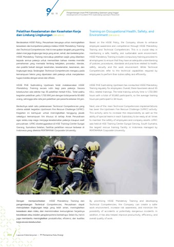 Pengembangan Insan PHE Subholding Upstream yang UnggulDevelopment of Excellent PHE Subholding Upstream Personnel 10 11Pelatihan Keselamatan dan Kesehatan Kerja dan Lindung Lingkungan [GRI 403-5]Berdasarkan HSSE Policy, Perusahaan berupaya untuk meningkatkan kesadaran dan kompetensi pekerja melalui HSSE Mandatory Trainingdan Technical Competencies. Hal ini merupakan langkah yang penting dalam menjaga lingkungan kerja yang aman, sehat, dan berkelanjutan. HSSE Mandatory Training mencakup pelatihan wajib yang diberikan kepada semua pekerja untuk memastikan bahwa mereka memiliki pemahaman yang memadai tentang kebijakan, prosedur, standar, dan praktik terkait dengan kesehatan, keselamatan, keamanan, dan lingkungan kerja. Sedangkan Technical Competencies mengacu pada kemampuan teknis yang diperlukan oleh pekerja untuk menjalankan tugas mereka dengan aman dan efisien.HSSE PHE Subholding Upstream telah melaksanakan HSSE Mandatory Training secara rutin bagi para pekerja. Secara keseluruhan ada sekitar top 35 pelatihan terkait K3LL. Total waktu kegiatan pelatihan yaitu 1.722.590 jam dengan total peserta 50.692 orang, sehingga rata-rata jam pelatihan per peserta sebesar 34 jam.Berikutnya salah satu pelaksanaan Technical Competencies yang utama adalah kegiatan Upstream Fire Rescue Challenge (UFRC). Kegiatan ini bertujuan untuk meningkatkan tanggung jawab sekaligus kemampuan tim khusus di setiap Anak Perusahaan agar selalu siap siaga menjaga keselamatan pekerja maupun aset perusahaan. UFRC diselenggarakan di HSE Training Center Sungai Gerong, Sumatera Selatan, fasilitas pelatihan rescue terbesar di Indonesia yang dikelola PERTAMINA Corporate University. Training on Occupational Health, Safety, and Environment [GRI 403-5]Based on the HSSE Policy, the Company strives to enhance employee awareness and competence through HSSE Mandatory Training and Technical Competencies. This is a crucial step in maintaining a safe, healthy, and sustainable work environment. HSSE Mandatory Training includes compulsory training provided to all employees to ensure that they have an adequate understanding of policies, procedures, standards and practices related to health, safety, security and the work environment. While Technical Competencies refer to the technical capabilities required by employees to perform their duties safely and efficiently.HSSE PHE Subholding Upstream has conducted HSSE Mandatory Training regularly for employees. Overall, there have been about 35 K3LL related trainings. The total training activity time is 1,722,590 hours with a total of 50,692 participants, so the average training hours per participant is 34 hours.Next, one of the main Technical Competencies implementations has been the Upstream Fire Rescue Challenge (UFRC) activity. This activity aims to increase the responsibility as well as the ability of special teams in each Subsidiary to be ready at all times to maintain the safety of employees and company assets. UFRC was held at HSE Training Center Sungai Gerong, South Sumatra, the largest rescue training facility in Indonesia managed by PERTAMINA Corporate University. Dengan memprioritaskan HSSE Mandatory Training dan pengembangan Technical Competencies, Perusahaan dapat menciptakan lingkungan kerja yang lebih aman, meningkatkan kesadaran akan risiko, dan meminimalkan kemungkinan terjadinya kecelakaan atau insiden yang berpotensi berbahaya. Selain itu, hal ini juga membantu meningkatkan produktivitas, efisiensi, dan kualitas kerja secara keseluruhan.By prioritizing HSSE Mandatory Training and developing Technical Competencies, the Company can create a safer work environment, increase risk awareness, and minimize the possibility of accidents or potentially dangerous incidents. In addition, it has also helped improve productivity, efficiency, and overall quality of work.9204 Laporan Keberlanjutan %u2022 PT Pertamina Hulu Energi