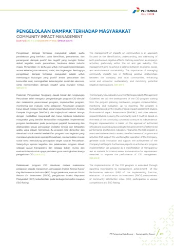 Pengelolaan dampak terhadap masyarakat adalah suatu pendekatan yang berfokus pada identifikasi, pemahaman, dan penanganan dampak positif dan negatif yang mungkin timbul akibat kegiatan suatu perusahaan, terutama dalam industri migas. Pengelolaan ini bertujuan untuk mencapai keseimbangan antara keberlanjutan ekonomi, sosial, dan lingkungan. Pentingnya pengelolaan dampak terhadap masyarakat adalah untuk membangun hubungan yang positif antara perusahaan dan komunitas lokal, meningkatkan keberlanjutan sosial dan ekonomi, serta meminimalkan dampak negatif yang mungkin timbul. [GRI 413-1]Pedoman Pengelolaan Tanggung Jawab Sosial dan Lingkungan Perusahaan telah mengatur pengembangan program CID dimulai dari mekanisme perencanaan program, implementasi program, monitoring dan evaluasi, serta pelaporan. Perumusan program harus dibuat melalui hasil studi social impact assessment, Analisis Dampak Lingkungan (AMDAL), dan kajian/studi relevan lainnya dengan melibatkan masyarakat dan harus berbasis kebutuhan masyarakat yang bersifat kemandirian masyarakat. Implementasi program berdasarkan pada persetujuan pejabat berwenang dan dilaksanakan sesuai pencapaian indikator kinerja dan ketepatan waktu yang dibuat. Sementara itu program CID dimonitor dan dievaluasi untuk menilai keefektifan program dan kegiatan yang mendukung kelancaran operasi Perusahaan, memunculkan inovasi sosial serta mendukung pencapaian target sasaran Perusahaan. Selanjutnya laporan kegiatan dan pelaksanaan program dibuat sebagai wujud transparansi dan sebagai bahan review dan evaluasi internal untuk upaya perbaikan guna meningkatkan kinerja pengelolaan CID. [GRI 413-2]Pelaksanaan program CID dievaluasi melalui mekanisme pelaporan kepada manajemen, pencapaian Indeks Kinerja Kunci/ Key Performance Indicator (KPI) fungsi pelaksana, evaluasi Social Return On Investment (SROI), pengukuran Indeks Kepuasan Masyarakat (IKM), keikutsertaan pada berbagai kompetisi maupun ESG Rating. The management of impacts on communities is an approach focused on the identification, understanding, and addressing of both positive and negative effects that may arise from a company's activities, particularly within the oil and gas industry. This management aims to achieve a balance between economic, social, and environmental sustainability. The importance of managing community impacts lies in fostering positive relationships between the company and local communities, enhancing social and economic sustainability, and minimizing potential negative repercussions. [GRI 413-1]The Company%u2019s Social and Environmental Responsibility Management Guidelines set out the development of the CID program starting from the program planning mechanism, program implementation, monitoring and evaluation, up to reporting. The program is formulated based on the results of social impact assessment studies, Environmental Impact Assessments (AMDAL), and other relevant research/studies involving the community and it must be based on the needs of the community concerned to ensure its independence. Program implementation is based on the approval of authorized officials and is carried out according to the achievement of determined performance and timeline indicators. Meanwhile, the CID program is monitored and evaluated to assess the effectiveness of programs and activities that support the uninterrupted operation of the Company, generate social innovation and support the achievement of the Company%u2019s set targets. Furthermore, reports on activities and program implementation are prepared as a manifestation of transparency and as material for internal review and evaluation for improvement measures to improve the performance of CID management.[GRI 413-2]The implementation of the CID program is evaluated through reporting mechanisms to management, achievement of Key Performance Indicator (KPI) of the implementing function, evaluation of social return on investment (SROI), measurement of community satisfaction index (CSI), participation in various competitions and ESG Rating.PENGELOLAAN DAMPAK TERHADAP MASYARAKAT COMMUNITY IMPACT MANAGEMENT [OJK F.23][GRI 3-3, 413][SASB EM-EP-210b.1][IPIECA SOC-9]PT Pertamina Hulu Energi %u2022 Sustainability Report 211