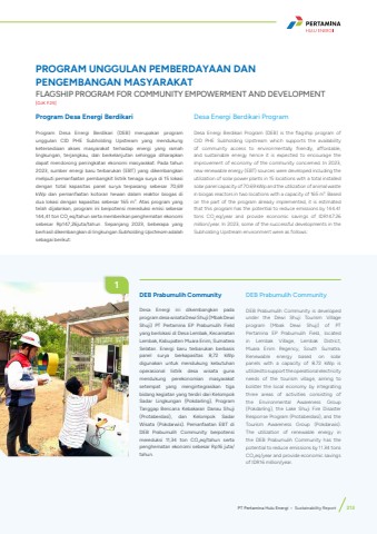 Program Desa Energi BerdikariProgram Desa Energi Berdikari (DEB) merupakan program unggulan CID PHE Subholding Upstream yang mendukung ketersediaan akses masyarakat terhadap energi yang ramah lingkungan, terjangkau, dan berkelanjutan sehingga diharapkan dapat mendorong peningkatan ekonomi masyarakat. Pada tahun 2023, sumber energi baru terbarukan (EBT) yang dikembangkan meliputi pemanfaatan pembangkit listrik tenaga surya di 15 lokasi dengan total kapasitas panel surya terpasang sebesar 70,69 kWp dan pemanfaatan kotoran hewan dalam reaktor biogas di dua lokasi dengan kapasitas sebesar 165 m3. Atas program yang telah dijalankan, program ini berpotensi mereduksi emisi sebesar 144,41 ton CO2eq/tahun serta memberikan penghematan ekonomi sebesar Rp147,26juta/tahun. Sepanjang 2023, beberapa yang berhasil dikembangkan di lingkungan Subholding Upstream adalah sebagai berikut:Desa Energi Berdikari ProgramDesa Energi Berdikari Program (DEB) is the flagship program of CID PHE Subholding Upstream which supports the availability of community access to environmentally friendly, affordable, and sustainable energy hence it is expected to encourage the improvement of economy of the community concerned. In 2023, new renewable energy (EBT) sources were developed including the utilization of solar power plants in 15 locations with a total installed solar panel capacity of 70.69 kWp and the utilization of animal waste in biogas reactors in two locations with a capacity of 165 m3. Based on the part of the program already implemented, it is estimated that this program has the potential to reduce emissions by 144.41 tons CO2eq/year and provide economic savings of IDR147.26 million/year. In 2023, some of the successful developments in the Subholding Upstream environment were as follows:PROGRAM UNGGULAN PEMBERDAYAAN DAN PENGEMBANGAN MASYARAKATFLAGSHIP PROGRAM FOR COMMUNITY EMPOWERMENT AND DEVELOPMENT[OJK F.25]DEB Prabumulih CommunityDesa Energi ini dikembangkan pada program desa wisata Dewi Shuji (Mbak Dewi Shuji) PT Pertamina EP Prabumulih Field yang berlokasi di Desa Lembak, Kecamatan Lembak, Kabupaten Muara Enim, Sumatera Selatan. Energi baru terbarukan berbasis panel surya berkapasitas 8,72 kWp digunakan untuk mendukung kebutuhan operasional listrik desa wisata guna mendukung perekonomian masyarakat setempat yang mengintegrasikan tiga bidang kegiatan yang terdiri dari Kelompok Sadar Lingkungan (Pokdarling), Program Tanggap Bencana Kebakaran Danau Shuji (Protaberdasi), dan Kelompok Sadar Wisata (Pokdarwis). Pemanfaatan EBT di DEB Prabumulih Community berpotensi mereduksi 11,34 ton CO2eq/tahun serta penghematan ekonomi sebesar Rp16 juta/tahun.DEB Prabumulih CommunityDEB Prabumulih Community is developed under the Dewi Shuji Tourism Village program (Mbak Dewi Shuji) of PT Pertamina EP Prabumulih Field, located in Lembak Village, Lembak District, Muara Enim Regency, South Sumatra. Renewable energy based on solar panels with a capacity of 8.72 kWp is utilized to support the operational electricity needs of the tourism village, aiming to bolster the local economy by integrating three areas of activities consisting of the Environmental Awareness Group (Pokdarling), the Lake Shuji Fire Disaster Response Program (Protaberdasi), and the Tourism Awareness Group (Pokdarwis). The utilization of renewable energy in the DEB Prabumulih Community has the potential to reduce emissions by 11.34 tons CO2eq/year and provide economic savings of IDR16 million/year.1PT Pertamina Hulu Energi %u2022 Sustainability Report 213