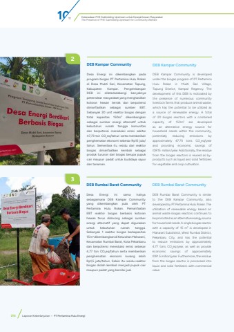 Keberadaan PHE Subholding Upstream untuk Kesejahteraan MasyarakatThe Presence of PHE Subholding Upstream for Community Welfare 11DEB Kampar CommunityDesa Energi ini dikembangkan pada program biogas PT Pertamina Hulu Rokan di Desa Mukti Sari, Kecamatan Tapung, Kabupaten Kampar. Pengembangan DEB ini dilatarbelakangi banyaknya peternakan masyarakat yang menghasilkan kotoran hewan ternak dan berpotensi dimanfaatkan sebagai sumber EBT. Sebanyak 20 unit reaktor biogas dengan total kapasitas 150m3 dikembangkan sebagai sumber energi alternatif untuk kebutuhan rumah tangga komunitas dan berpotensi mereduksi emisi sekitar 47,73 ton CO2eq/tahun serta memberikan penghematan ekonomi sebesar Rp15 juta/tahun. Sementara itu residu dari reaktor biogas dimanfaatkan kembali sebagai produk turunan dari biogas berupa pupuk cair maupun padat untuk budidaya sayur dan tanaman.DEB Kampar CommunityDEB Kampar Community is developed under the biogas program of PT Pertamina Hulu Rokan in Mukti Sari Village, Tapung District, Kampar Regency. The development of this DEB is motivated by the presence of numerous community livestock farms that produce animal waste, which has the potential to be utilized as a source of renewable energy. A total of 20 biogas reactors with a combined capacity of 150m3 are developed as an alternative energy source for household needs within the community, potentially reducing emissions by approximately 47.73 tons CO2eq/year and providing economic savings of IDR15 million/year. Additionally, the residue from the biogas reactors is reused as byproducts such as liquid and solid fertilizers for vegetable and crop cultivation.2DEB Rumbai Barat CommunityDesa Energi ini sama halnya sebagaimana DEB Kampar Community yang dikembangkan pula oleh PT Pertamina Hulu Rokan. Pemanfaatan EBT reaktor biogas berbasis kotoran hewan terus didorong sebagai sumber energi alternatif yang dapat digunakan untuk kebutuhan rumah tangga. Sebanyak 1 reaktor biogas berkapasitas 15 m3 dikembangkan di Kelurahan Maharani, Kecamatan Rumbai Barat, Kota Pekanbaru dan berpotensi mereduksi emisi sebesar 4,77 ton CO2eq/tahun serta memberikan penghematan ekonomi kurang lebih Rp1,5 juta/tahun. Selain itu residu reaktor biogas diolah kembali menjadi pupuk cair maupun padat yang bernilai jual.DEB Rumbai Barat CommunityDEB Rumbai Barat Community is similar to the DEB Kampar Community, also developed by PT Pertamina Hulu Rokan. The utilization of renewable energy based on animal waste biogas reactors continues to be promoted as an alternative energy source for household needs. A single biogas reactor with a capacity of 15 m3 is developed in Maharani Subdistrict, West Rumbai District, Pekanbaru City, and has the potential to reduce emissions by approximately 4.77 tons CO2eq/year, as well as provide economic savings of approximately IDR1.5 million/year. Furthermore, the residue from the biogas reactor is processed into liquid and solid fertilizers with commercial value.310214 Laporan Keberlanjutan %u2022 PT Pertamina Hulu Energi